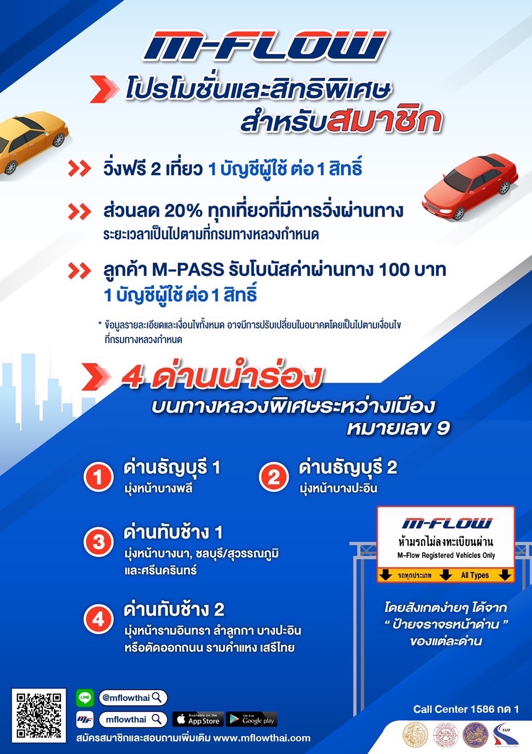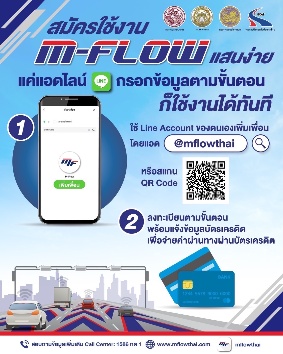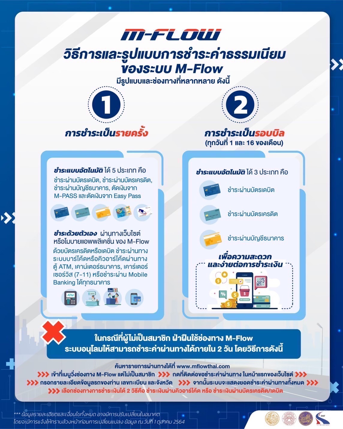 ไม่สามารถใช้บริการ M-Flow ได้ แต่ยังคงใช้ช่องชําระเงินสด และช่อง M-Pass Easy Pass ได้ หากสงสัยหรือต้องการสอบถามข้อมูลเพิ่มเติม โทรติดต่อได้ที่ Call Center โทร 1586 กด 1