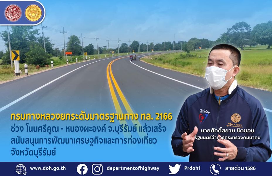 นายสราวุธ ทรงศิวิไล อธิบดีกรมทางหลวง เปิดเผยว่า กรมทางหลวงโดย สำนักก่อสร้างทางที่ 1 ดำเนินงานโครงการก่อสร้างทางหลวงหมายเลข 2166 ช่วง โนนศรีคูณ-หนองผะองค์ จ.บุรีรัมย์ ระยะทาง 12 กิโลเมตร เป็นส่วนหนึ่งของทางหลวงหมายเลข 2166 เสิงสาง – หนองผะองค์ แล้วเสร็จ ซึ่งจะทำให้ทางหลวงสายนี้ได้รับการปรับปรุงยกระดับมาตรฐานทางแล้วเสร็จตลอดสาย รวมระยะทางทั้งหมด 82.5 กิโลเมตร ตามนโยบายของนายศักดิ์สยาม ชิดชอบ รัฐมนตรีว่าการกระทรวงคมนาคม ในการยกระดับมาตรฐานทางหลวงทั่วประเทศ พัฒนาโครงข่ายคมนาคมและระบบโลจิสติกส์ เพื่อส่งเสริมคุณภาพชีวิตที่ดีให้กับประชาชนทั่วทุกภูมิภาค ให้สามารถเดินทางได้อย่างสะดวกรวดเร็วปลอดภัย สำหรับ ทางหลวงหมายเลข 2166 เสิงสาง – หนองผะองค์ เป็นทางหลวงสายสำคัญในการคมนาคมขนส่งเชื่อมโยงระหว่างจังหวัดนครราชสีมาและจังหวัดบุรีรัมย์ เดิมเป็นถนนลูกรัง ต่อมากรมทางหลวงได้ดำเนินการก่อสร้างและลาดยางตลอดสาย ปัจจุบันปริมาณการจราจรบนทางหลวงสายนี้มีเพิ่มมากขึ้น รัฐบาลได้เล็งเห็นความสำคัญในการพัฒนาระบบโครงข่ายทางหลวง จึงมอบนโยบายให้กรมทางหลวงดำเนินบูรณะและการก่อสร้างยกระดับมาตรฐานทางหลวงตลอดสาย เป็นมาตรฐานทาง ขนาด 2 ช่องจราจร และขยายเป็น 4 ช่องจราจรบางช่วงในเขตชุมชน เพื่อให้ผู้ใช้ทางได้รับความสะดวกรวดเร็วและปลอดภัยในการเดินทาง กรมทางหลวงขานรับนโยบายดังกล่าวจึงดำเนินการก่อสร้างทางหลวงสาย 2166 ช่วง โนนศรีคูณ-หนองผะองค์ ระหว่าง กม.ที่ 69+000 - กม.ที่ 81+000 รวมระยะทาง 12 กิโลเมตร เป็นมาตรฐานชั้นทาง 1 ขนาด 2 ช่องจราจร ไปกลับ ข้างละ 1 ช่องจราจร ผิวทางแอสฟัลท์คอนกรีต ผิวจราจรกว้างช่องละ 3.50 เมตร ไหล่ทางกว้างข้างละ 2.50 เมตร รวมทั้งมีการดำเนินการปรับปรุงเกาะกลางบริเวณช่วงที่เป็น 4 ช่องจราจรในเขตชุมชน พร้อมงานติดตั้งไฟฟ้าแสงสว่างและไฟสัญญากระพริบบนทางหลวงแล้วเสร็จ ส่งผลให้เกิดความสะดวก ลดค่าใช้จ่ายและร่นระยะเวลาในการคมนาคมขนส่งสินค้าและผลผลิตทางการเกษตรได้รวดเร็วขึ้น ช่วยพัฒนาพื้นที่ชุมชน 2 ฝั่งทางหลวง ลดอุบัติเหตุ สนับสนุนการพัฒนาเศรษฐกิจ สังคมและการท่องเที่ยวของจังหวัดบุรีรัมย์และจังหวัดใกล้เคียง