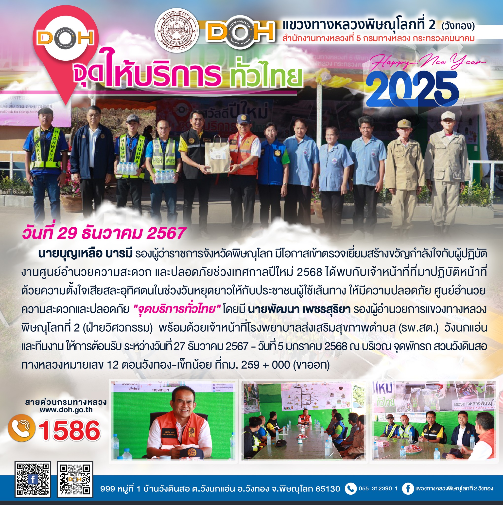 รองผู้ว่าราชการจังหวัดพิษณุโลก มีโอกาสเข้าตรวจเยี่ยมสร้างขวัญกำลังใจกับผู้ปฏิบัติงานศูนย์อำนวยความสะดวกและปลอดภัยช่วงเทศกาลปีใหม่ 2568