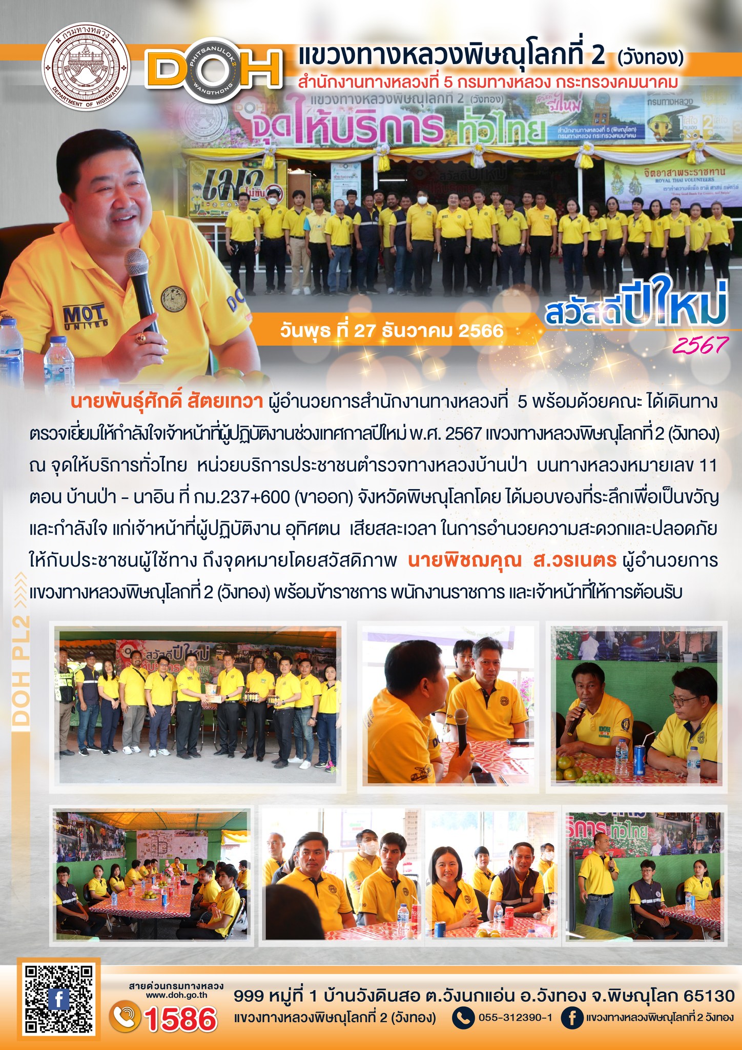 นายพันธุ์ศักดิ์ สัตยเทวา ผู้อำนวยการสำนักงานทางหลวงที่ 5 พร้อมด้วยคณะฯ ได้เดินทางตรวจเยี่ยมให้กำลังใจเจ้าหน้าที่ผู้ปฏิบัติงานช่วงเทศกาลปีใหม่ พ.ศ. 2567