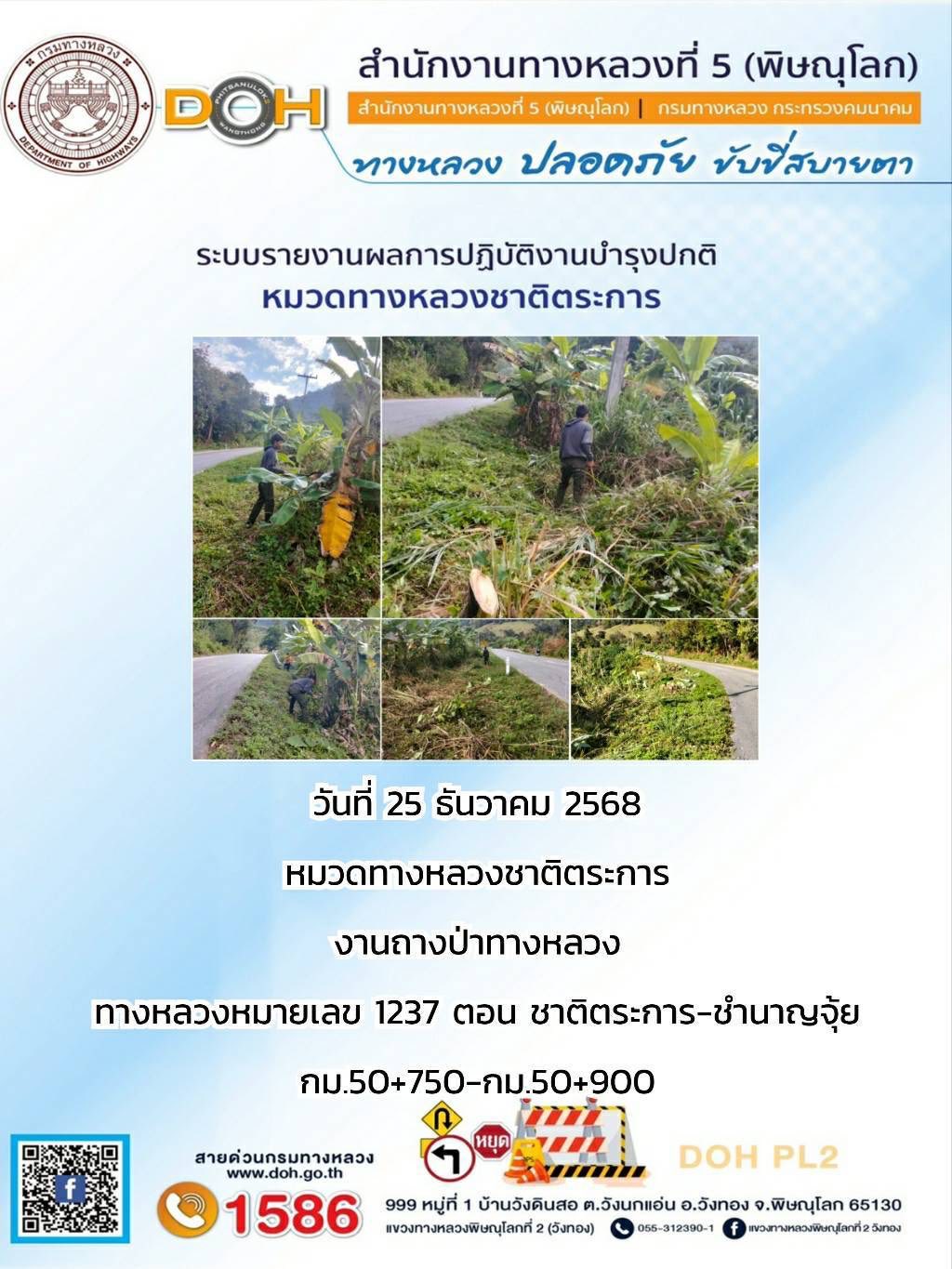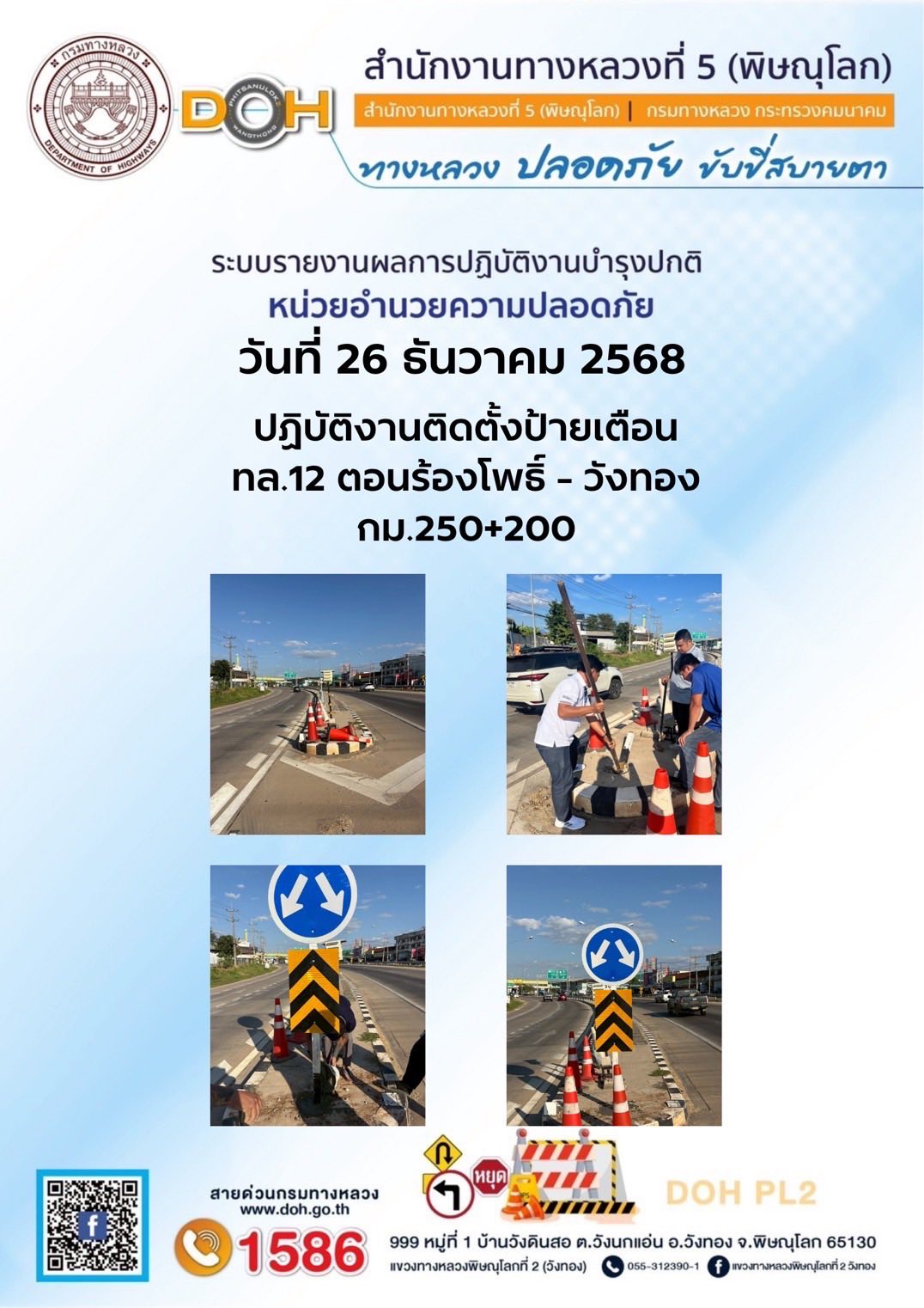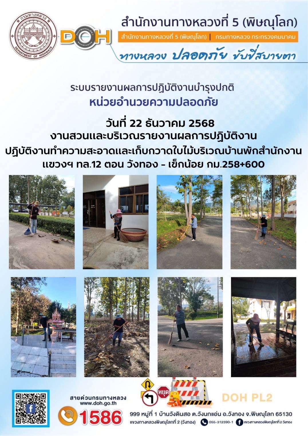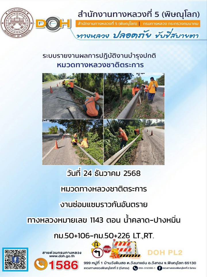 วันที่ 27 ธันวาคม 2568 เวลา 16:00 น. งานอำนวยความปลอดภัยปฏิบัติการประจำจุดบริการ ออกตรวจสายทางควบคุมทำความสะอาดบำรุงรักษาป้ายจราจรและอำนวยความสะดวกแก่ผู้ใช้ถนน บริเวณ ทล.12 ตอน วังทอง - เข็กน้อย