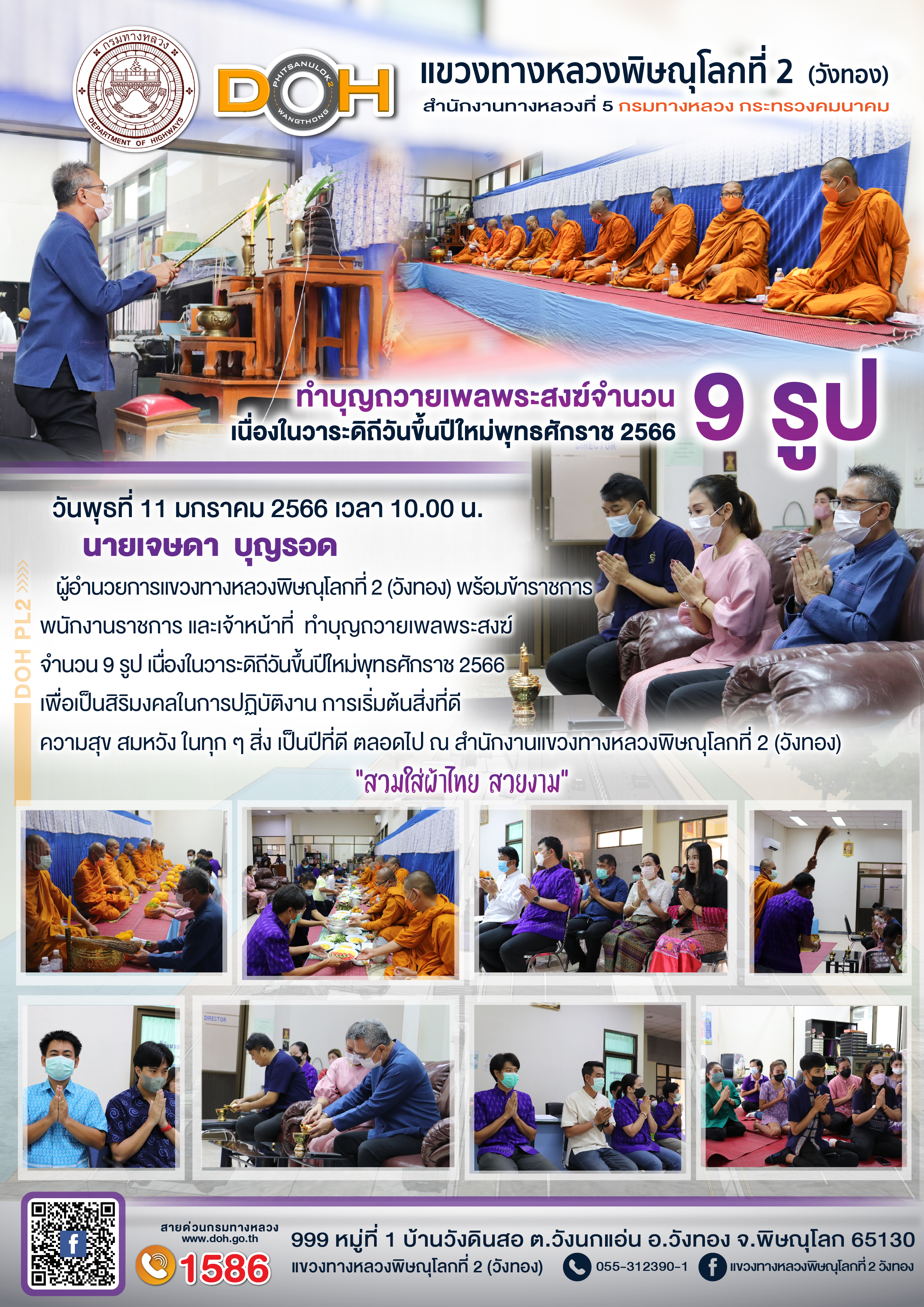 นายเจษดา บุญรอด ผู้อำนวยการแขวงทางหลวงพิษณุโลกที่ 2(วังทอง) มอบหมายให้ นายรัตติพงษ์ เก่งธัญญกรณ์ หมวดทางหลวงนครไทย ตักบาตร และถวายภัตตาหารเช้า