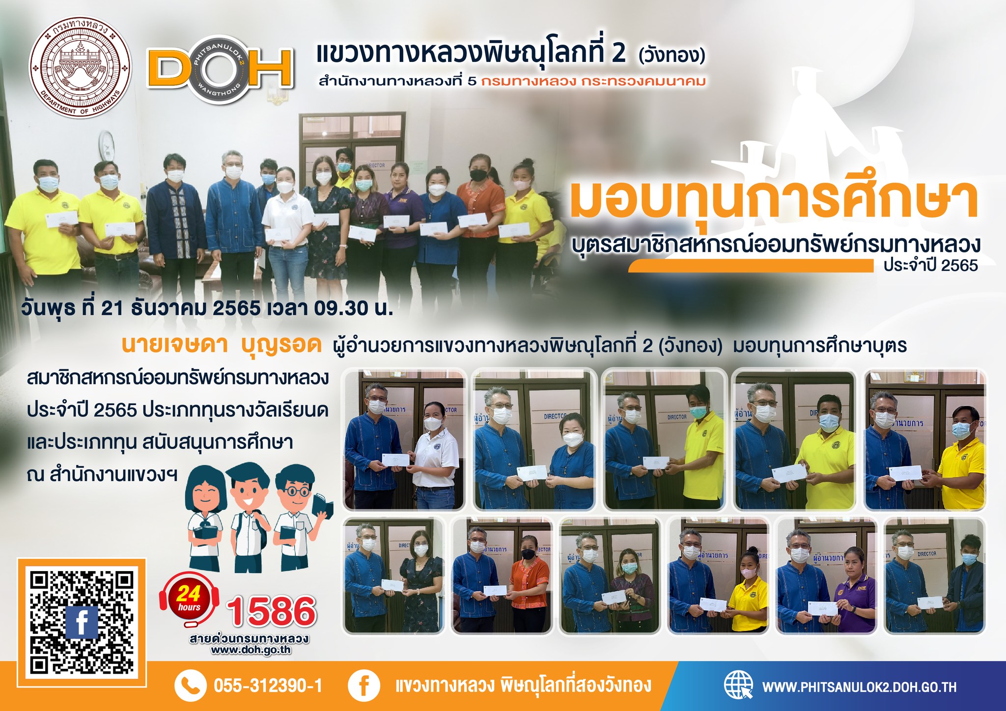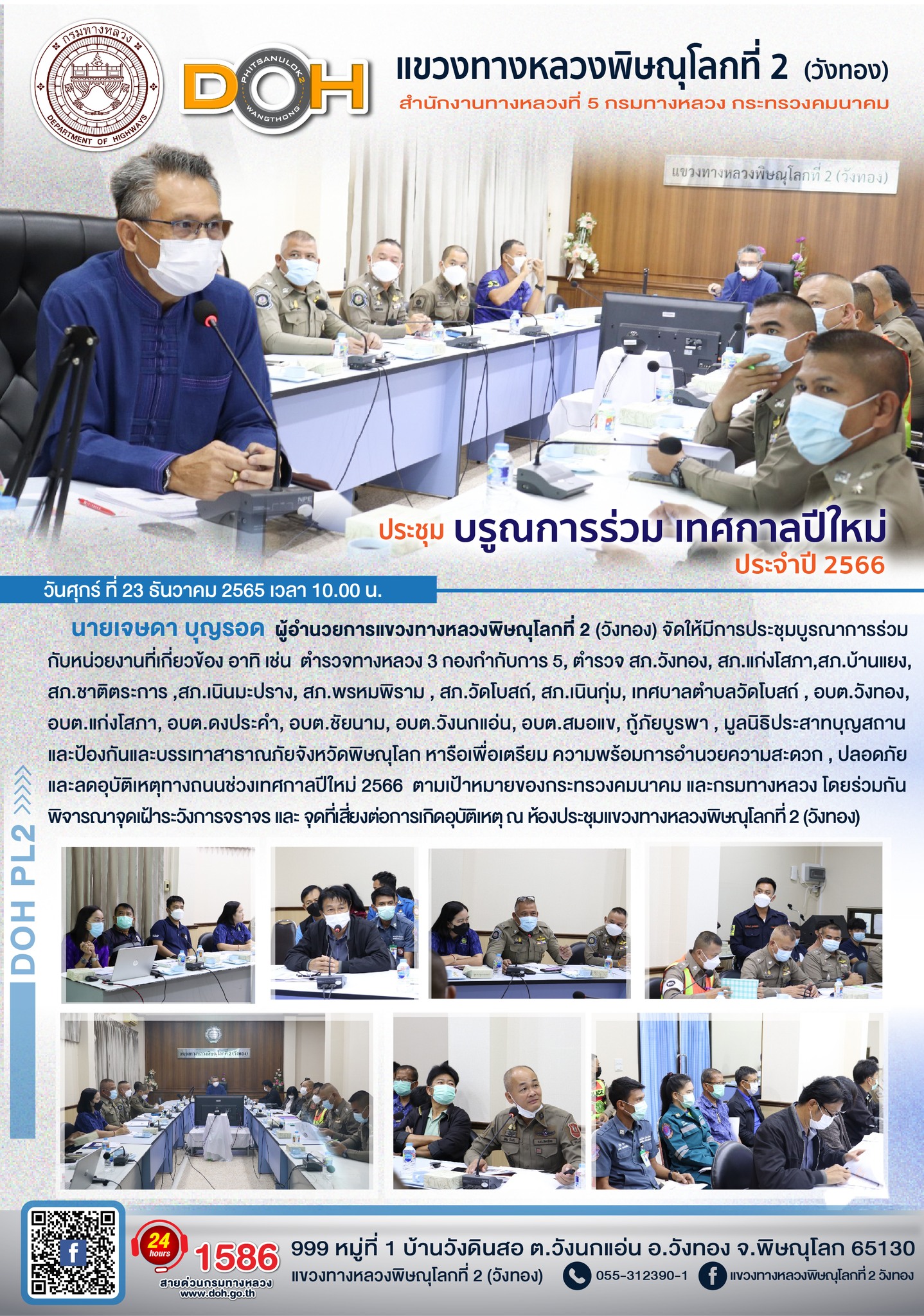 วันศุกร์ที่ 23 ธันวาคม 2565 เวลา 10.00 น. นายเจษดา บุญรอด ผู้อำนวยการแขวงทางหลวงพิษณุโลกที่ 2(วังทอง) จัดให้มีการประชุมบูรณาการร่วม กับหน่วยงานที่เกี่ยวข้อง