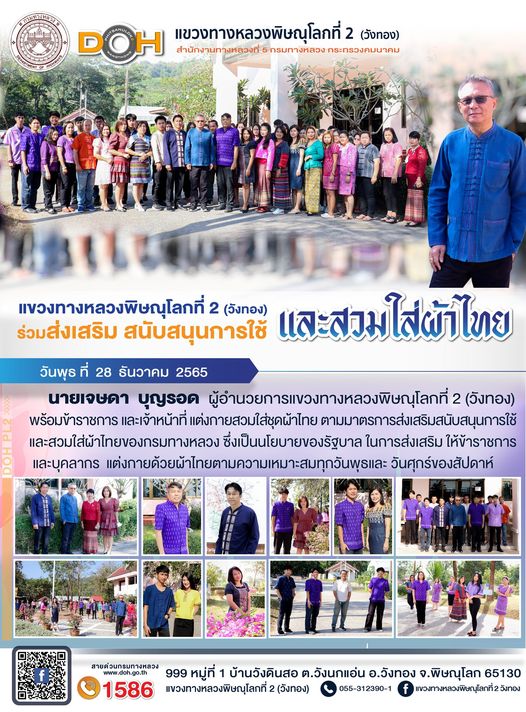 วันพุธที่ 28 ธันวาคม 2565 นายเจษดา บุญรอด ผู้อำนวยการแขวงทางหลวงพิษณุโลกที่ 2 (วังทอง) พร้อมข้าราชการ และเจ้าหน้าที่ แต่งกายสวมใส่ชุดผ้าไทย