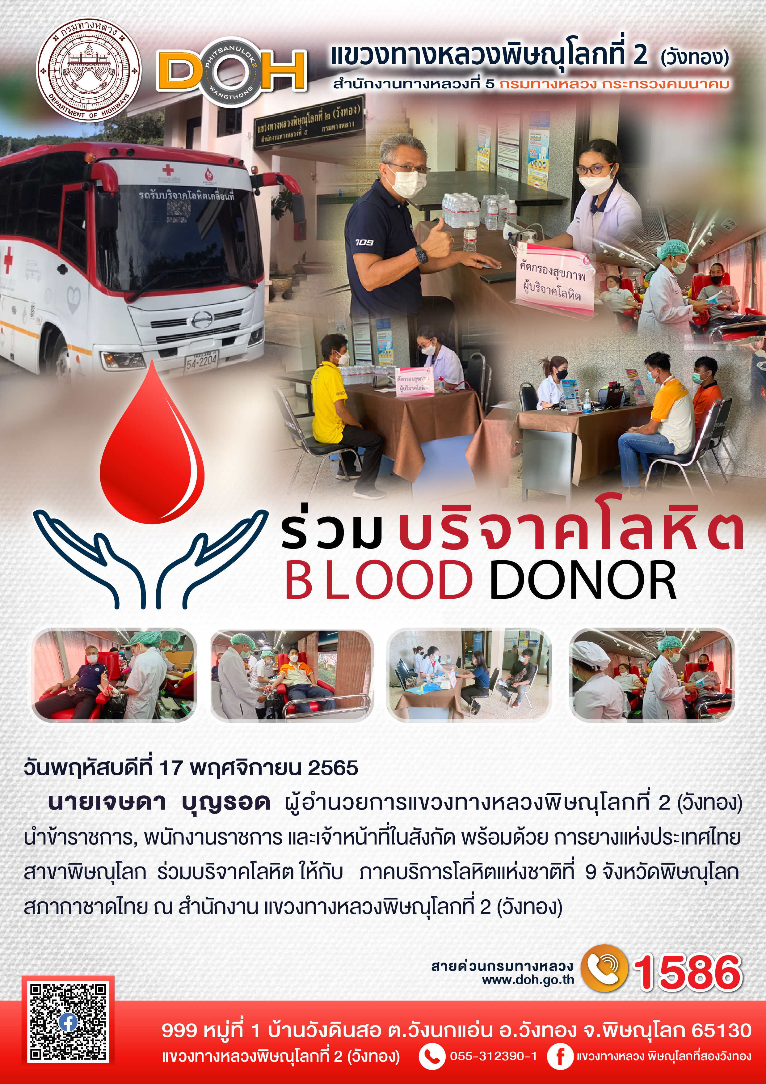 ร่วมบริจาคโลหิต ให้กับ ภาคบริการโลหิตแห่งชาติที่ 9 จังหวัดพิษณุโลก สภากาชาดไทย ณ สำนักงาน แขวงทางหลวงพิษณุโลกที่ 2(วังทอง)