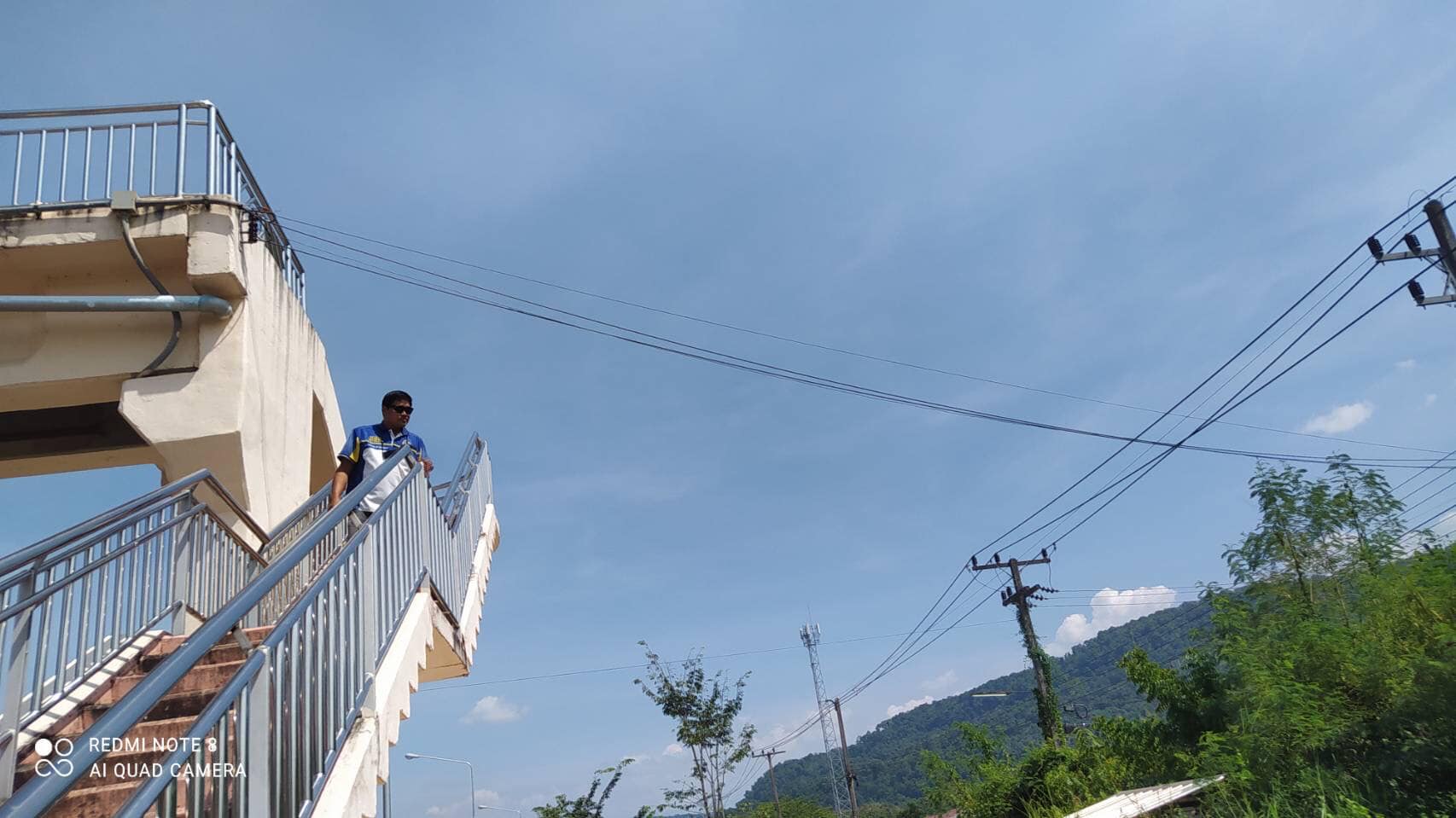 งานอำนวยความปลอดภัย ดำเนินการตรวจสอบปรับปรุง สายไฟฟ้าห้อยบริเวณสะพานลอยคนเดินข้าม หน้าโรงเรียนโป่งปะ