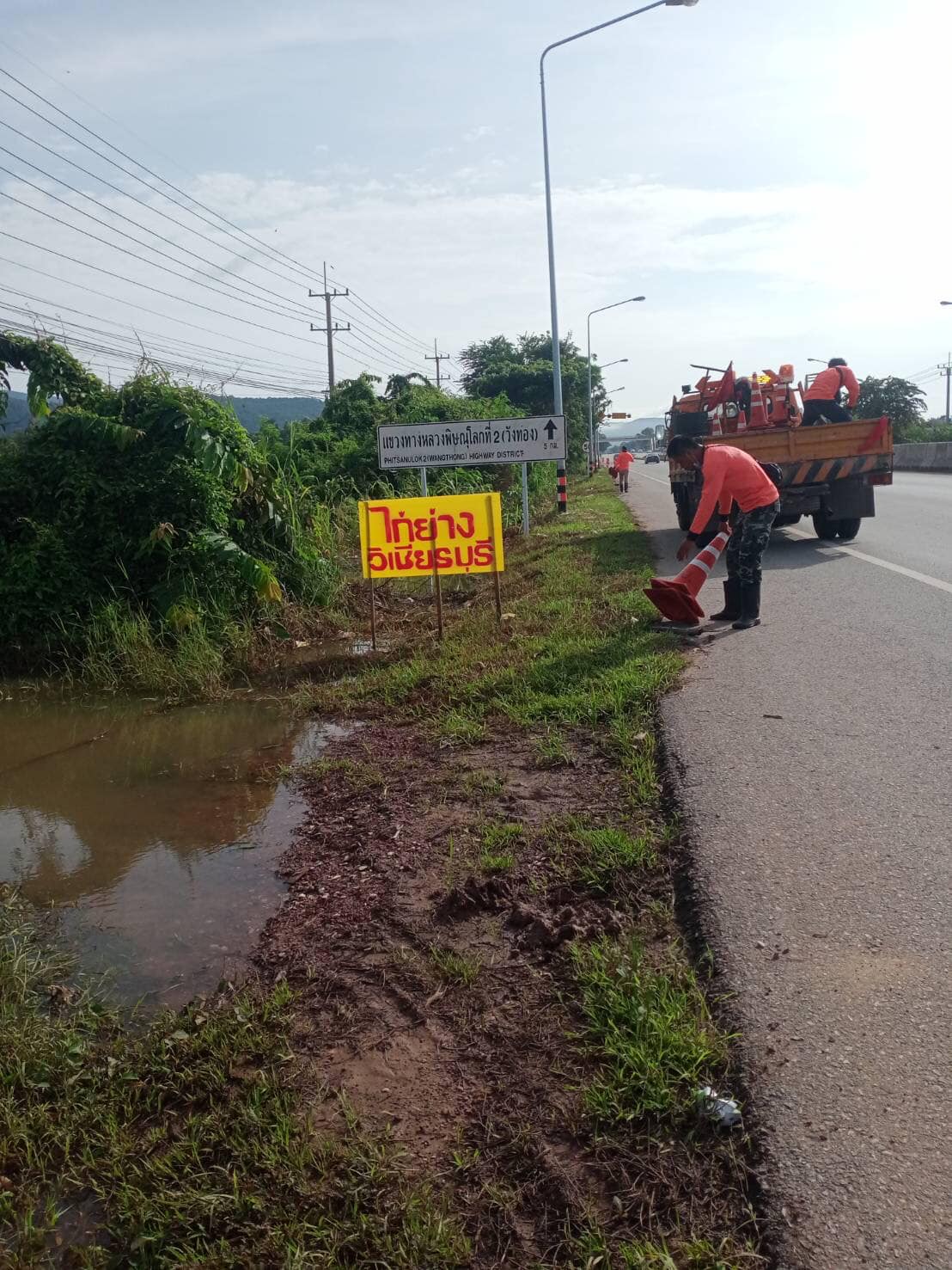 เนื่องจากมีน้ำเอ่อล้นจากแม่น้ำวังทองไหลหลาก เข้าท่วมถนนบริเวณดังกล่าว เมื่อวานนี้ สภาพทางในปัจจุบันน้ำได้ลดลงพ้นผิวทาง การจราจรผ่านได้เป็นปกติ