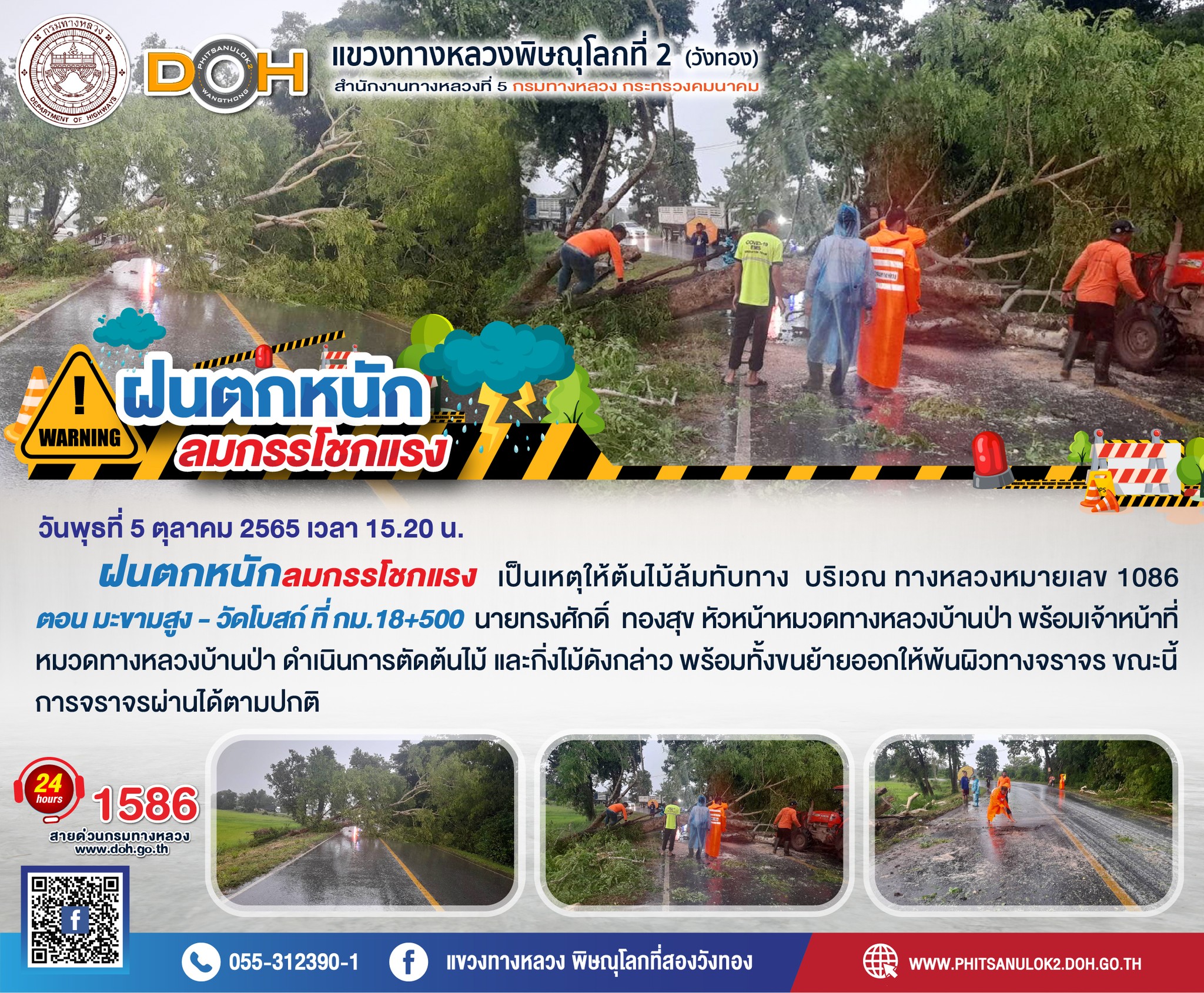 ฝนตกหนักลมกรรโชกแรงเป็นเหตุให้ต้นไม้ล้มทับทาง บริเวณ ทางหลวงหมายเลข 1086 ตอน มะขามสูง - วัดโบสถ์ ที่ กม.18+500