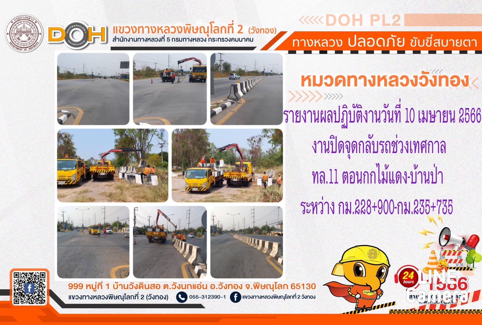 การปฏิบัติงานของ หมวดทางหลวง และ หน่วยงานในสังกัด เพื่ออำนวยความสะดวก และปลอดภัยให้กับประชาชนผู้ใช้เส้นทาง ประจำ วันจันทร์ที่ 10 เมษายน 2566