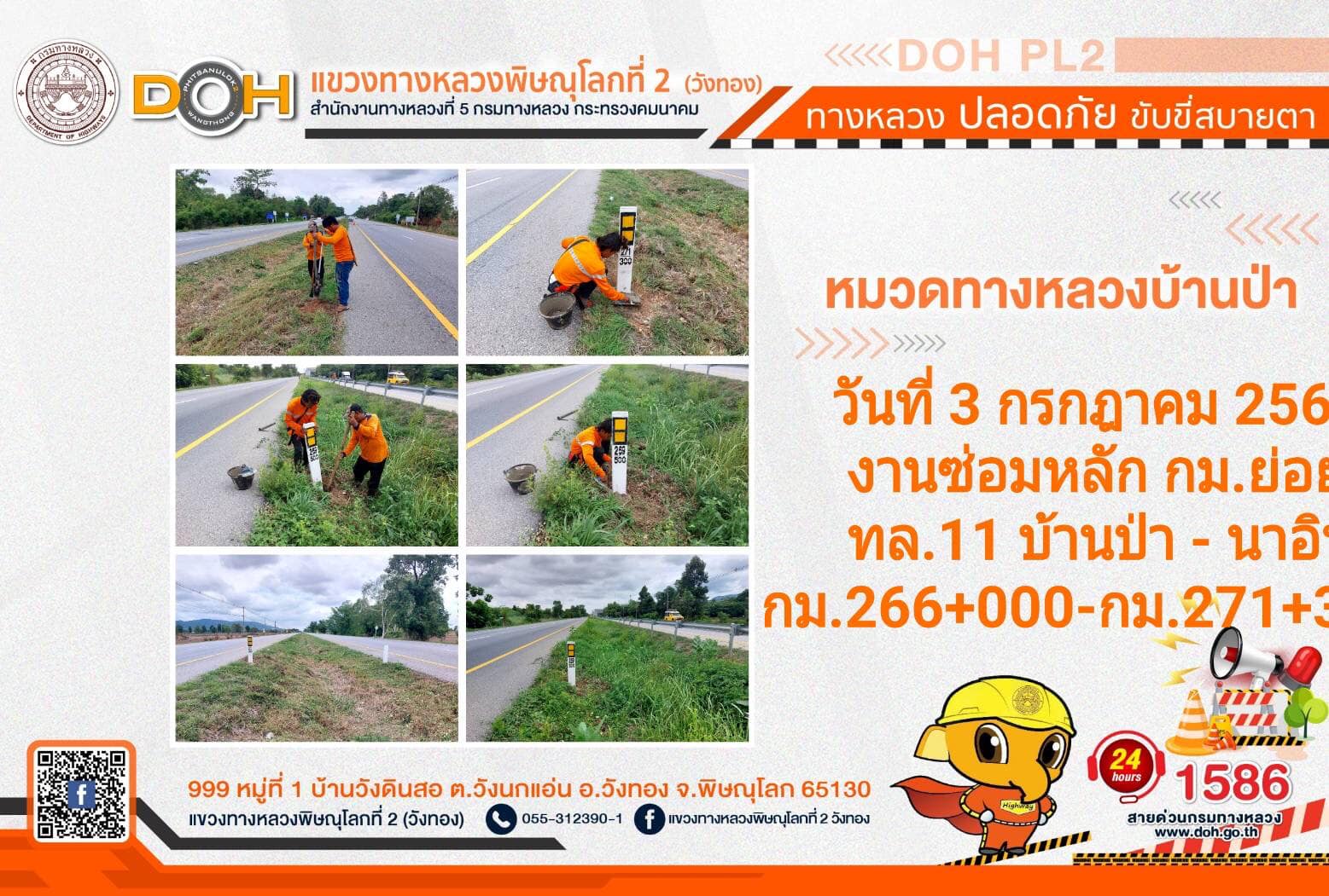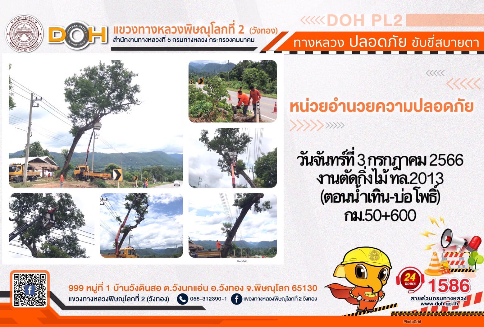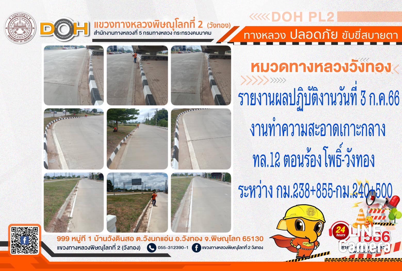 การปฏิบัติงานของ หมวดทางหลวง และ หน่วยงานในสังกัด เพื่ออำนวยความสะดวก และปลอดภัยให้กับประชาชนผู้ใช้เส้นทาง ประจำ วันจันทร์ที่ 3 กรกฎาคม 2566