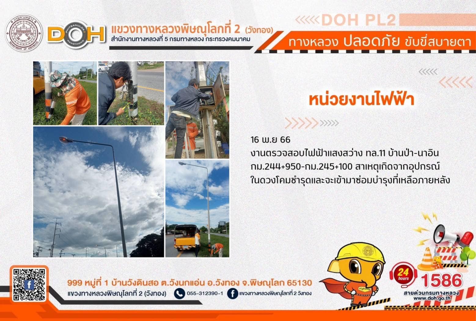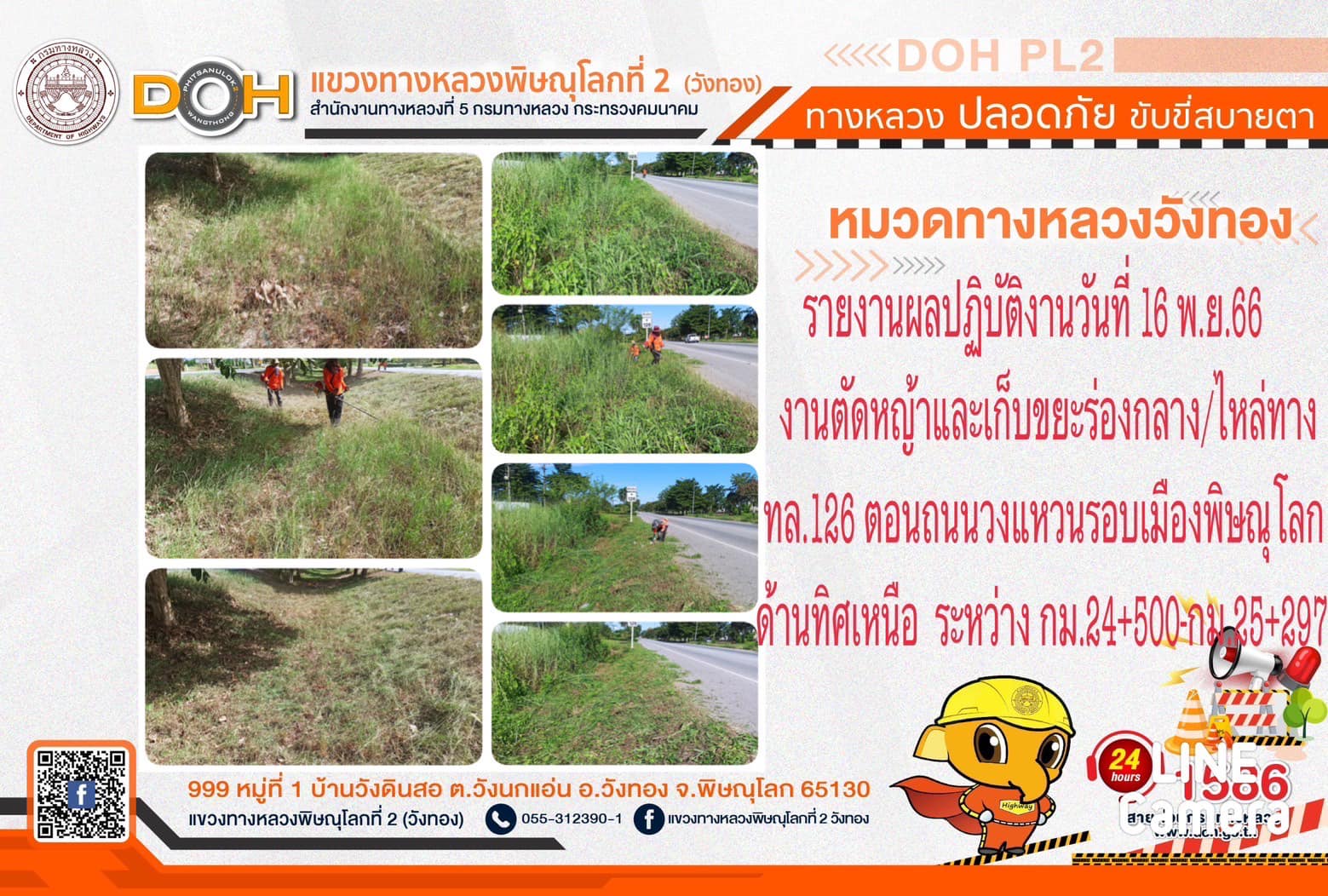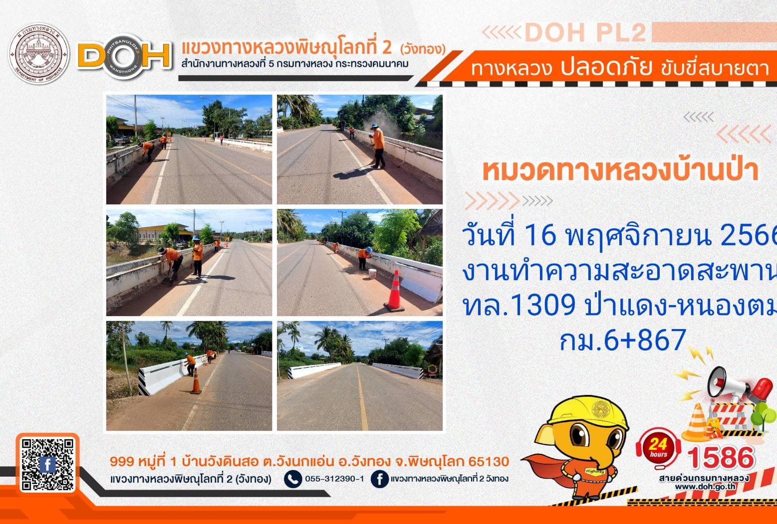 การปฏิบัติงานของ หมวดทางหลวง และ หน่วยงานในสังกัด เพื่ออำนวยความสะดวก และปลอดภัยให้กับประชาชนผู้ใช้เส้นทาง ประจำ วันพฤหัสบดีที่ 16 พฤศจิกายน 2566