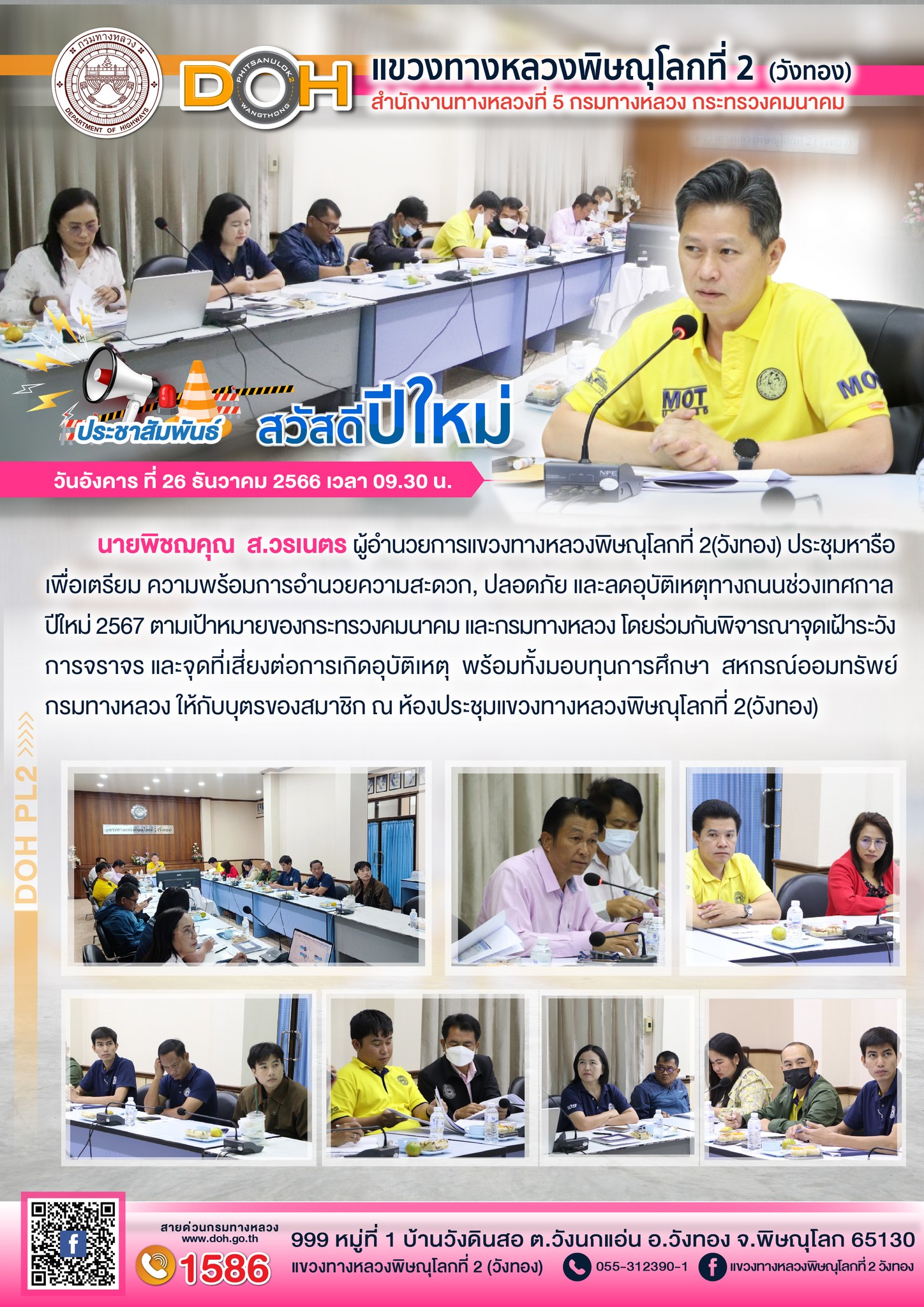 วันอังคารที่ 26 ธันวาคม 2566 เวลา 09.30 น. นายพิชฌคุณ ส.วรเนตร ผู้อำนวยการแขวงทางหลวงพิษณุโลกที่ 2(วังทอง) ประชุมหารือเพื่อเตรียม
