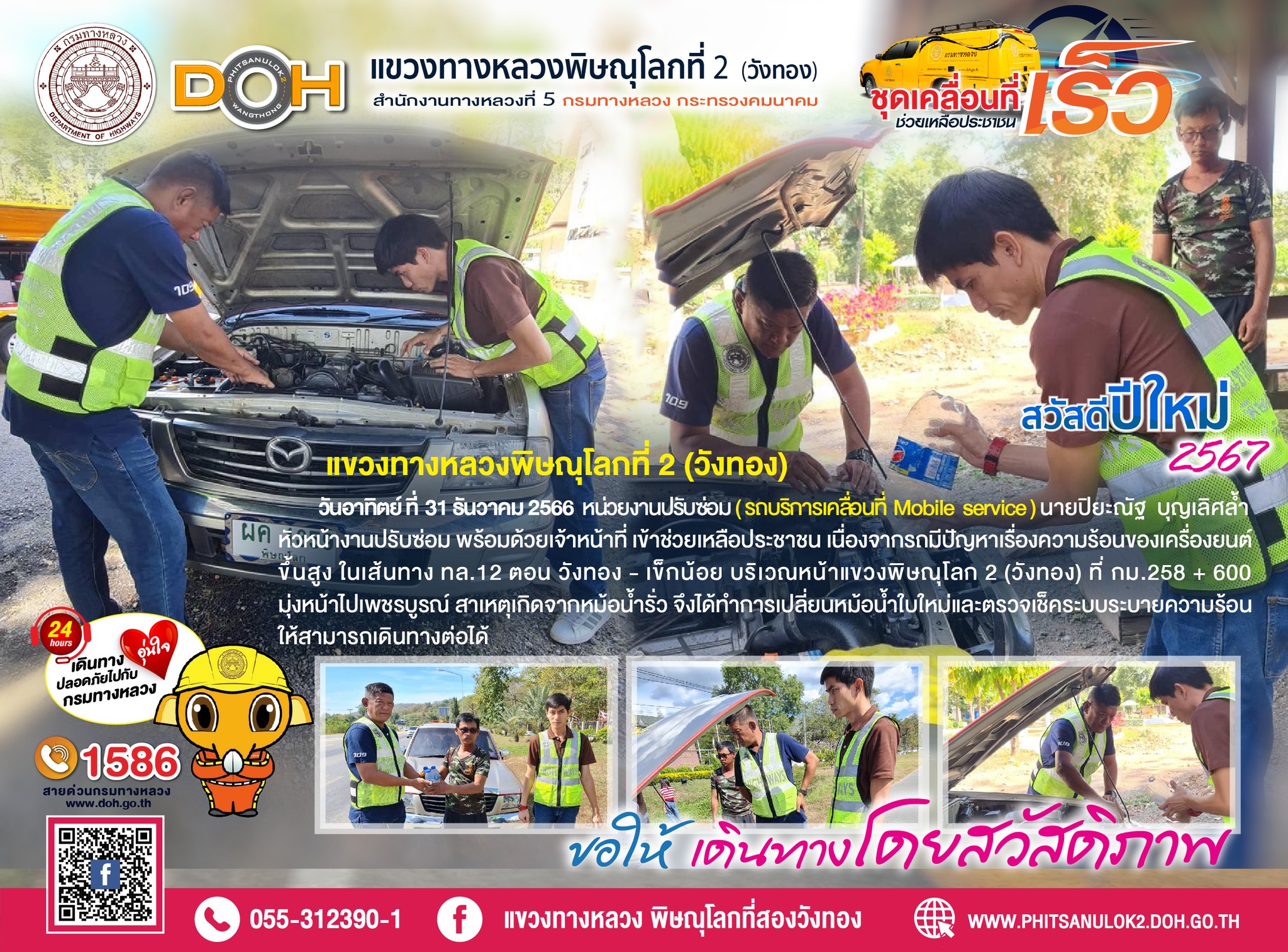หน่วยบริการเคลื่อนที่เร็ว Mobile service Car นายปิยะณัฐ บุญเลิศล้ำ หัวหน้างานปรับซ่อม พร้อมด้วยเจ้าหน้าที่ เข้าช่วยเหลือประชาชน เนื่องจากรถมีปัญหาเรื่องความร้อนของเครื่องยนต์ขึ้นสูง ในเส้นทาง ทล.12 ตอน วังทอง - เข็กน้อย บริเวณหน้าแขวงพิษณุโลก 2 (วังทอง) ที่ กม.258 + 600