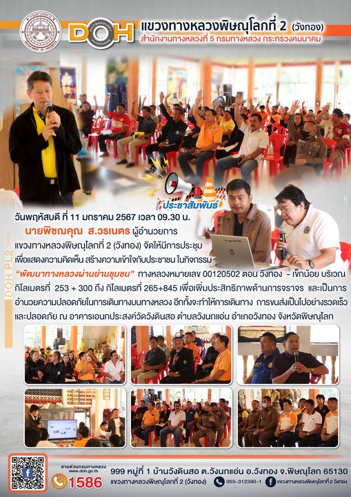 นายพิชฌคุณ ส.วรเนตร ผู้อำนวยแขวงทางหลวงพิษณุโลกที่ 2(วังทอง) จัดให้มีการประชุมเพื่อแสดงความคิดเห็น สร้างความเข้าใจกับประชาชน ในกิจกรรม "พัฒนาทางหลวงผ่านย่านชุมชน" ทางหลวงหมายเลข 00120502 ตอน วังทอง - เข็กน้อย บริเวณกิโลเมตรที่ 253+300 ถึง กิโลเมตรที่ 265+845 เพื่อเพิ่มประสิืทธิภาพด้านการจราจร และเป็นการอำนวยความปลอดภัยในการเดินทางบนทางหลวง อีกทั้งจะทำให้การเดินทาง การขนส่งเป็นไปอย่างรวดเร็ว และปลอดภัย ณ อาคารเอนกประสงค์วัดวังดินสอ ตำบลวังนกแอ่น อำเภอวังทอง จังหวัดพิษณุโลก