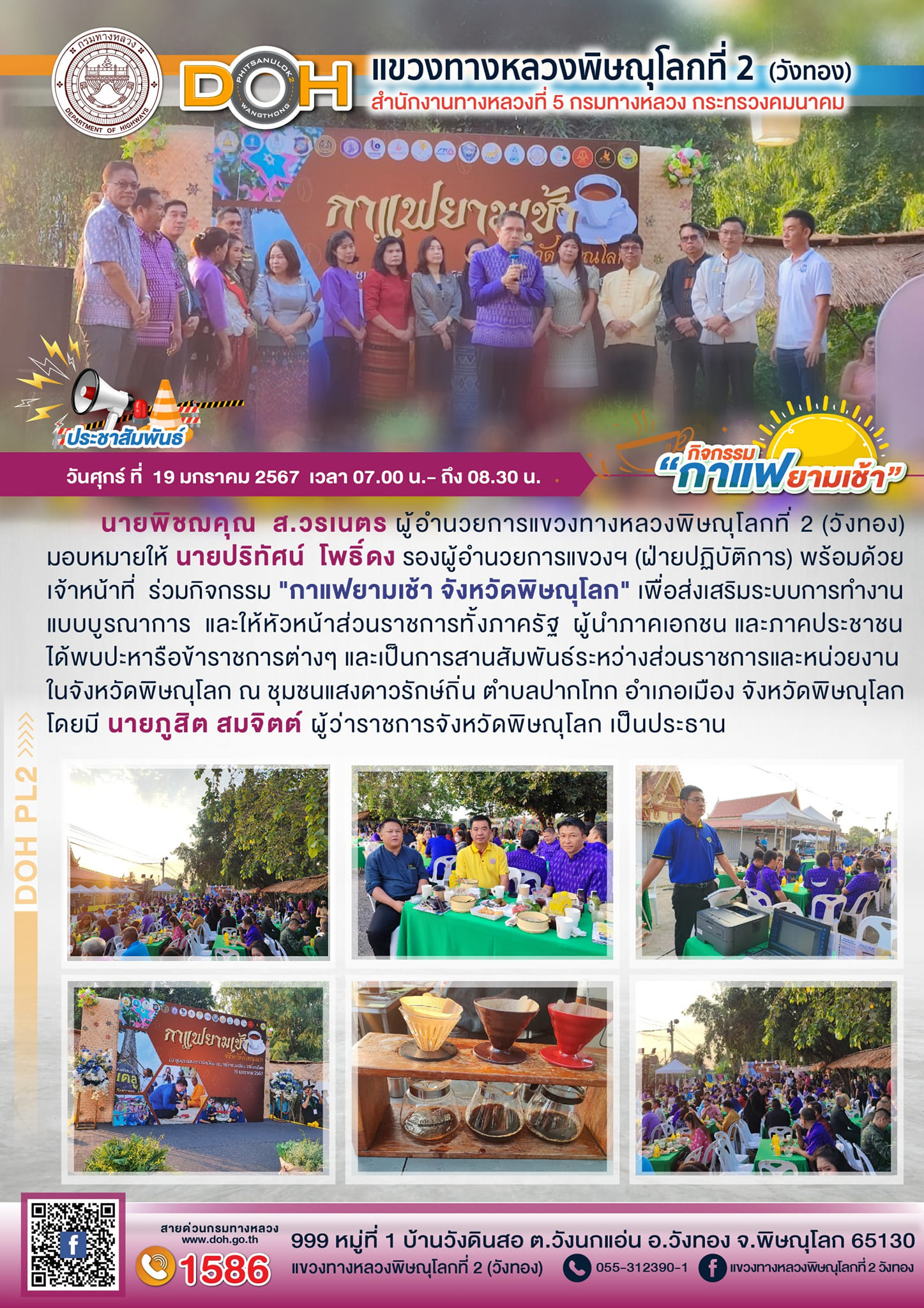 วันศุกร์ที่ 19 มกราคม 2567 นายพิชฌคุณ ส.วรเนตร ผู้อำนวยการแขวงทางหลวงพิษณุโลกที่ 2(วังทอง) มอบหมายให้นายปริทัศน์ โพธิ์ดง รองผู้อำนวยการแขวงฯ(ฝ่ายปฏิบัติการ) พร้อมด้วยเจ้าหน้าที่ ร่วมกิจกรรม "กาแฟยามเช้า จังหวัดพิษณุโลก" เพื่อส่งเสริมระบบการทำงานแบบบูรณาการ และให้หัวหน้าส่วนราชการทั้งภาครัฐ ผู้นำภาคเอกชน และภาคประชาชน ได้พบปะหารือข้าราชการต่างๆ และเป็นการสานสัมพันธ์ระหว่างส่วนราชการและหน่วยงานในจังหวัดพิษณุโลก ณ ชุมชนแสงดาวรักษ์ถิ่น ตำบลปากโทก อำเภอเมือง จังหวัดพิษณุโลก โดยมีนายภูสิต สมจิตต์ ผู้ว่าราชการจังหวัดพิษณุโลก เป็นประธาน