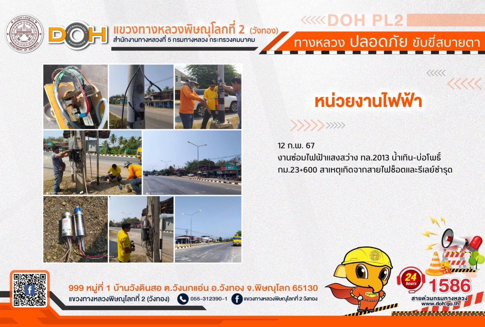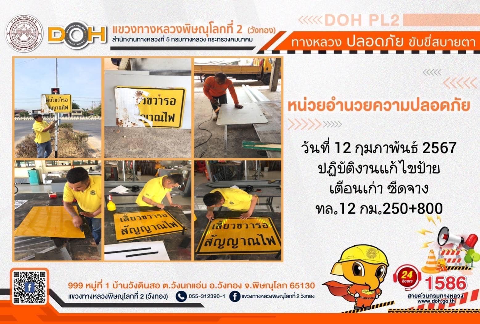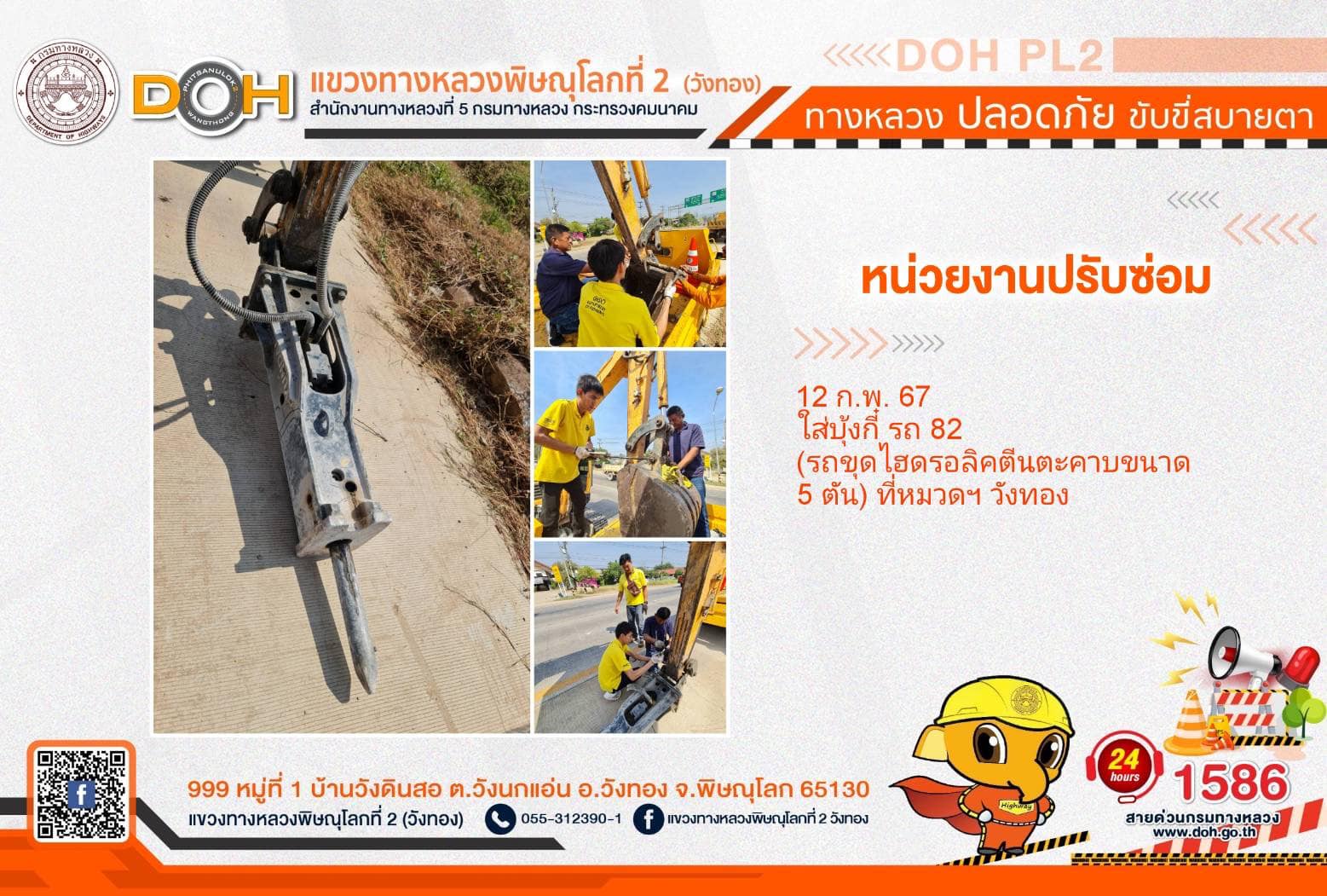 การปฏิบัติงานของ หมวดทางหลวง และ หน่วยงานในสังกัด เพื่ออำนวยความสะดวก และปลอดภัยให้กับประชาชนผู้ใช้เส้นทาง ประจำ วันจันทร์ที่ 12 กุมภาพันธ์ 2567