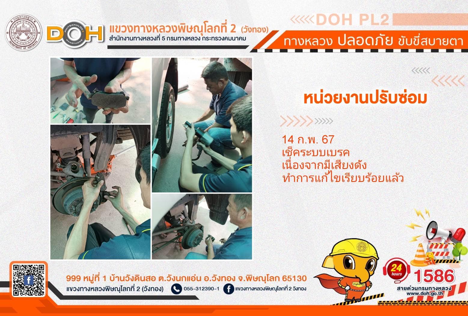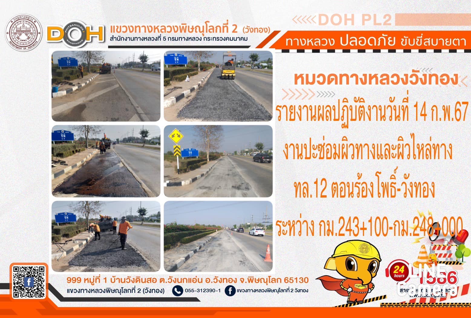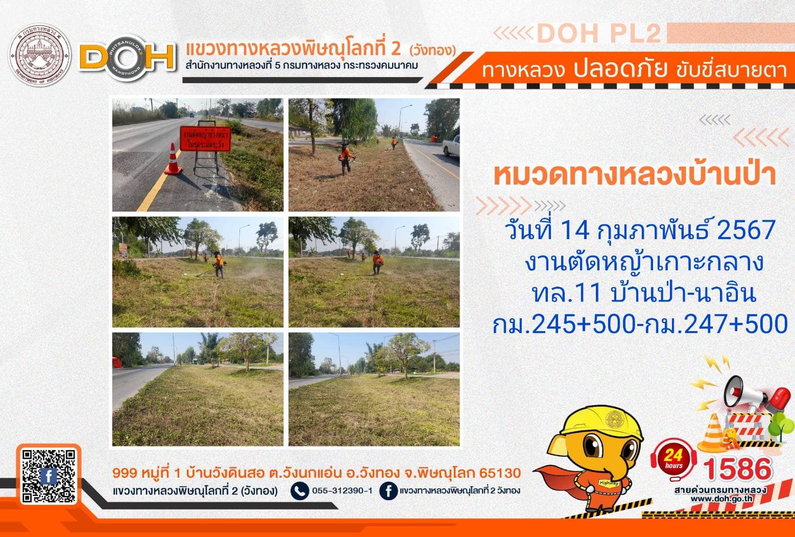 การปฏิบัติงานของ หมวดทางหลวง และ หน่วยงานในสังกัด เพื่ออำนวยความสะดวก และปลอดภัยให้กับประชาชนผู้ใช้เส้นทาง ประจำ วันพุธที่ 14 กุมภาพันธ์ 2567