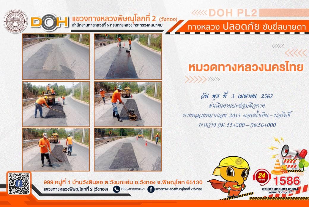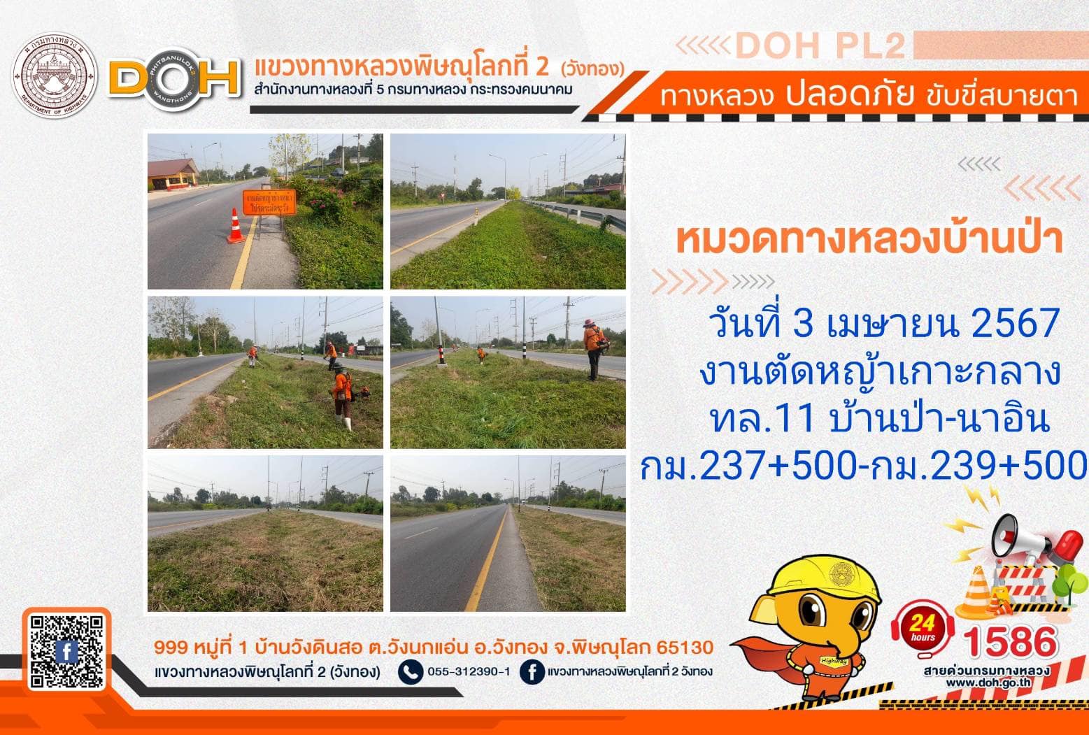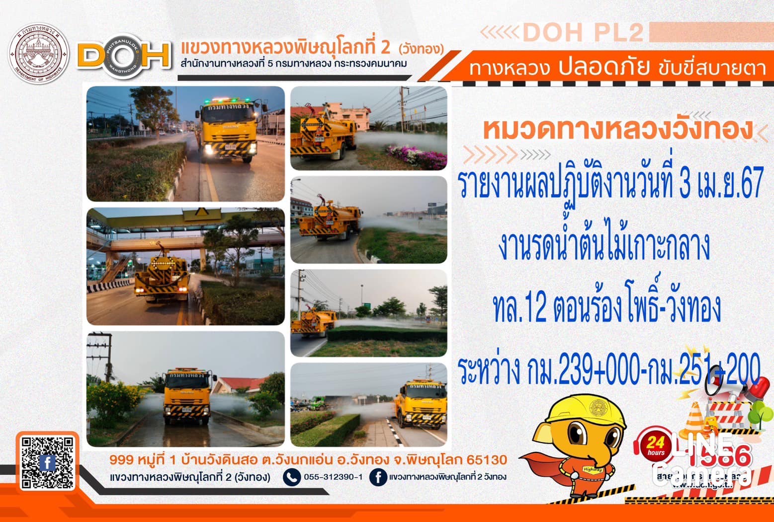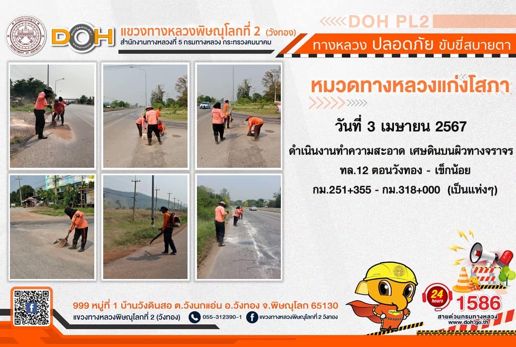 การปฏิบัติงานของ หมวดทางหลวง และ หน่วยงานในสังกัด เพื่ออำนวยความสะดวก และปลอดภัยให้กับประชาชนผู้ใช้เส้นทาง ประจำ วันพุธที่ 3 เมษายน 2567