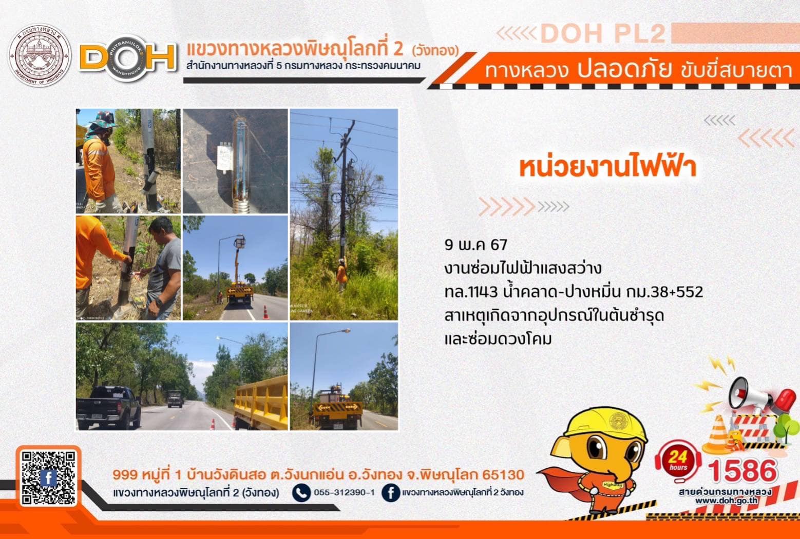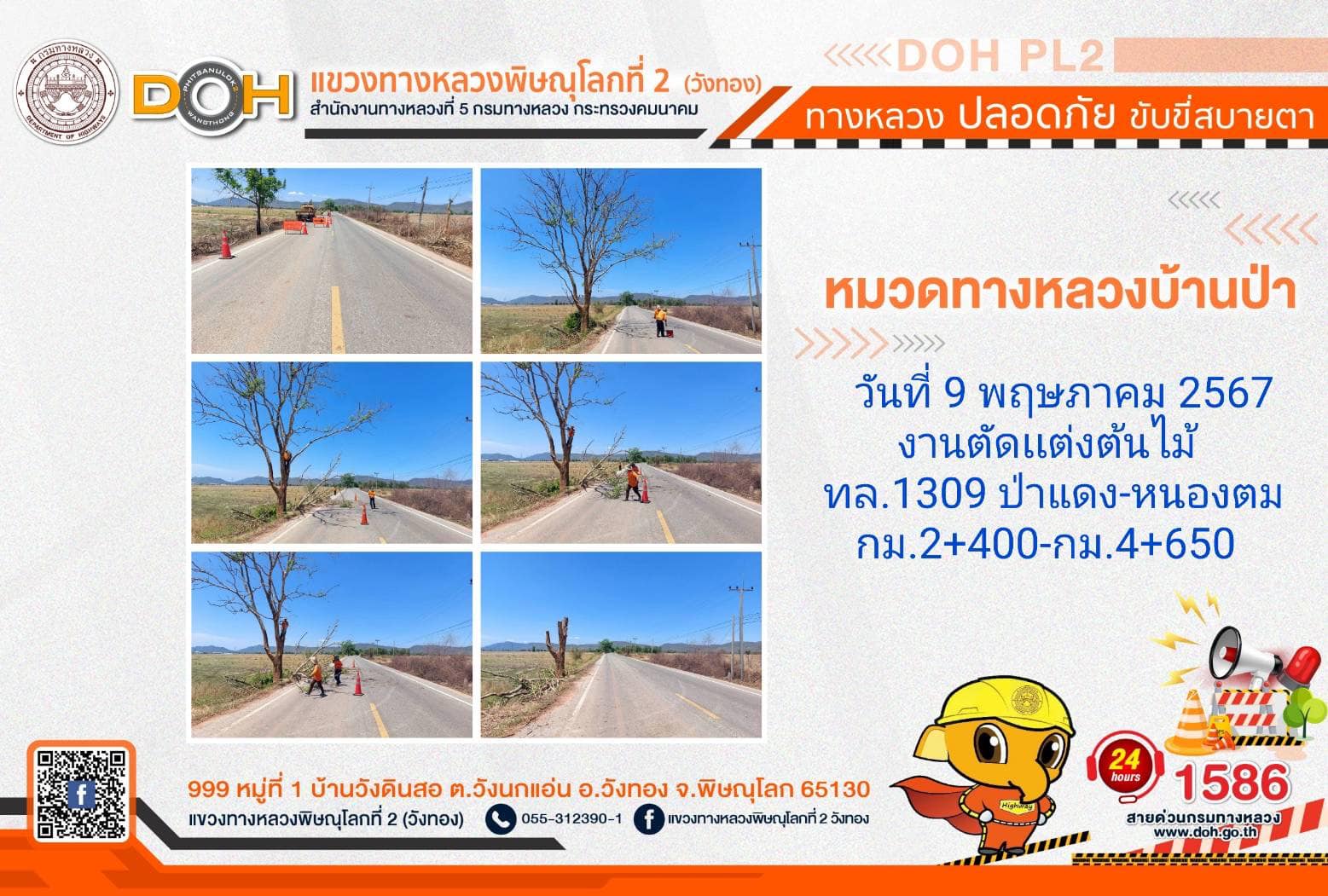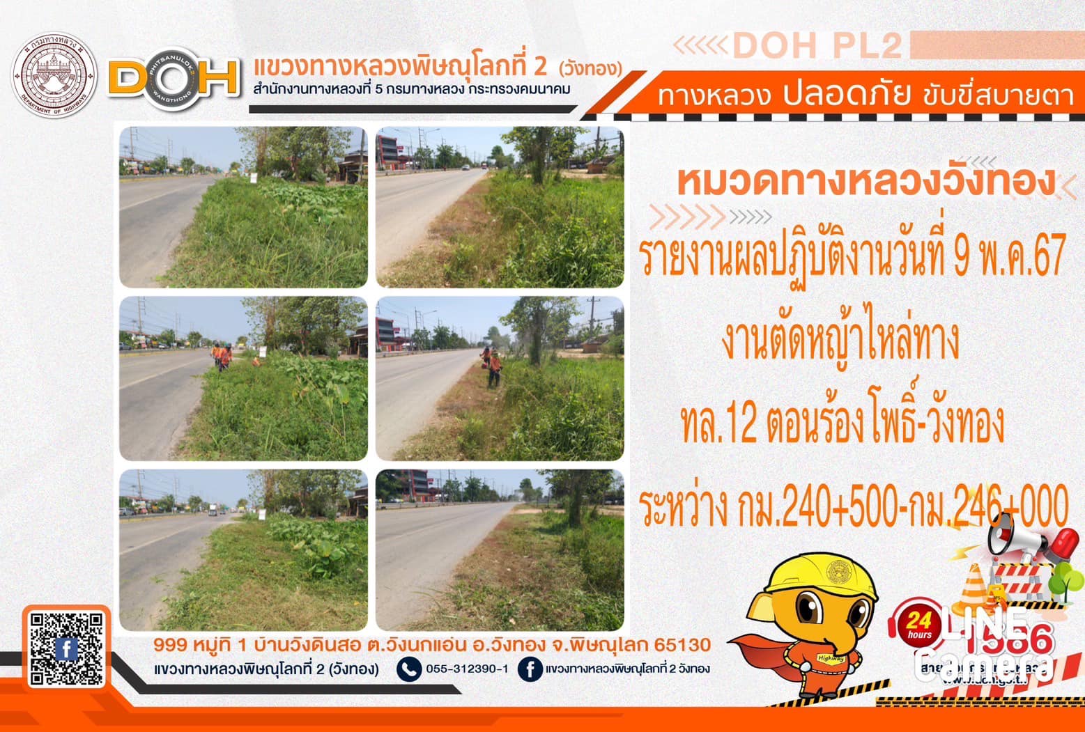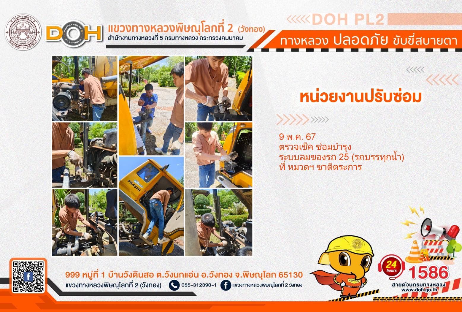 การปฏิบัติงานของ หมวดทางหลวง และ หน่วยงานในสังกัด เพื่ออำนวยความสะดวก และปลอดภัยให้กับประชาชนผู้ใช้เส้นทาง ประจำ วันพฤหัสบดีที่ 9 พฤษภาคม 2567