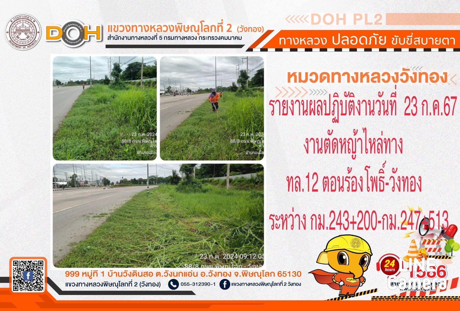 การปฏิบัติงานของ หมวดทางหลวง และ หน่วยงานในสังกัด เพื่ออำนวยความสะดวก และปลอดภัยให้กับประชาชนผู้ใช้เส้นทาง ประจำ วันอังคารที่ 23 กรกฎาคม 2567