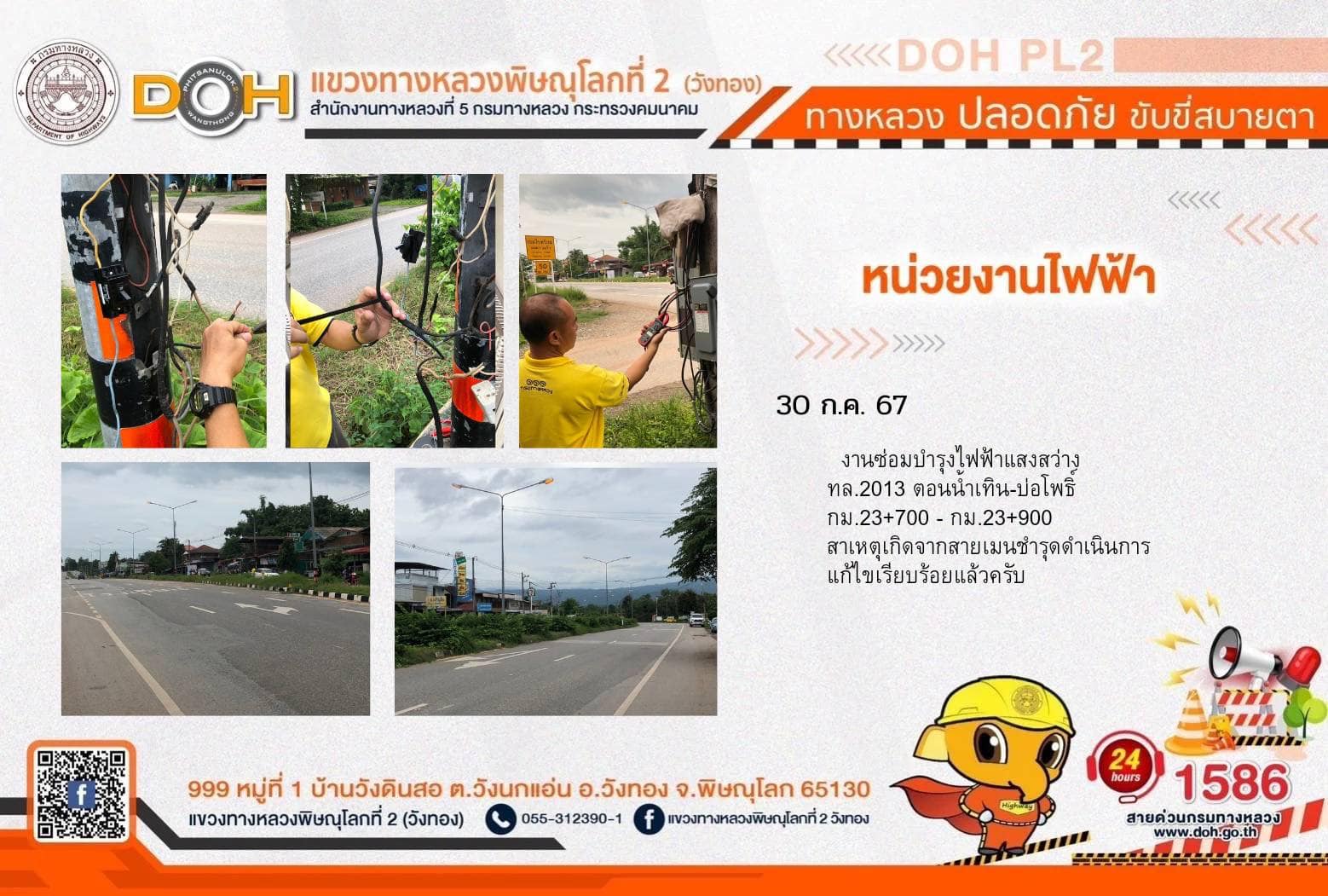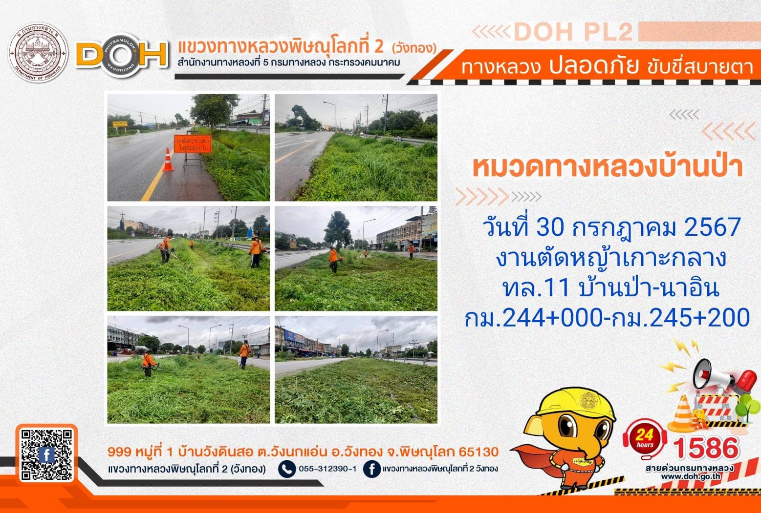 การปฏิบัติงานของ หมวดทางหลวง และ หน่วยงานในสังกัด เพื่ออำนวยความสะดวก และปลอดภัยให้กับประชาชนผู้ใช้เส้นทาง ประจำ วันอังคารที่ 30 กรกฎาคม 2567