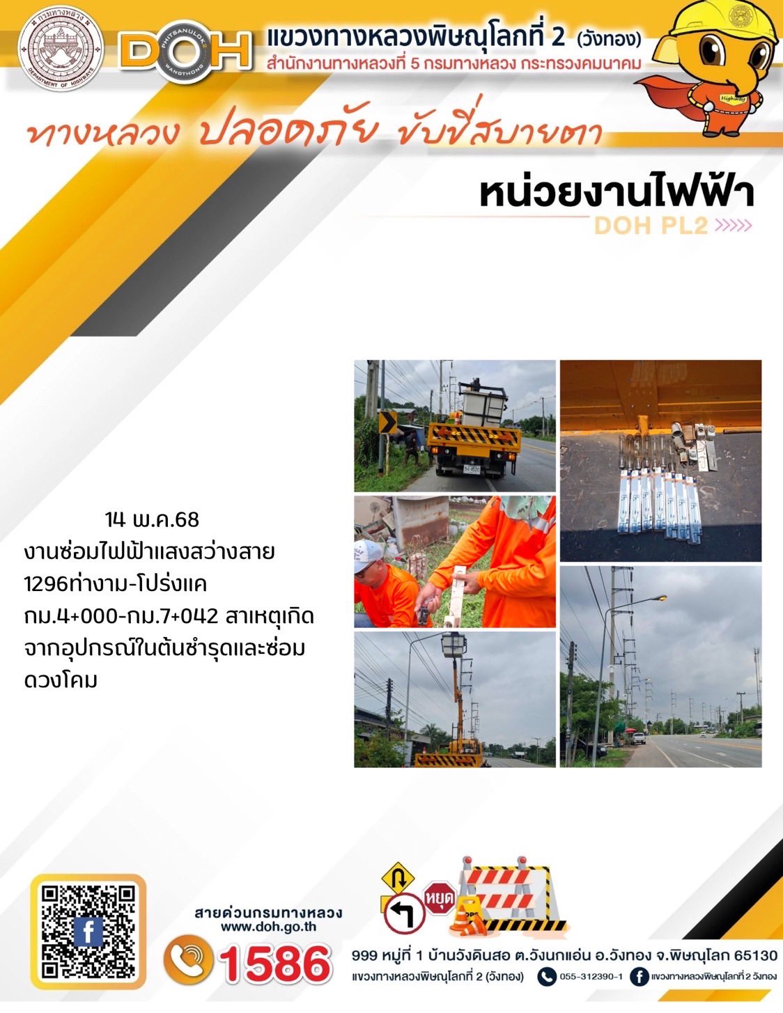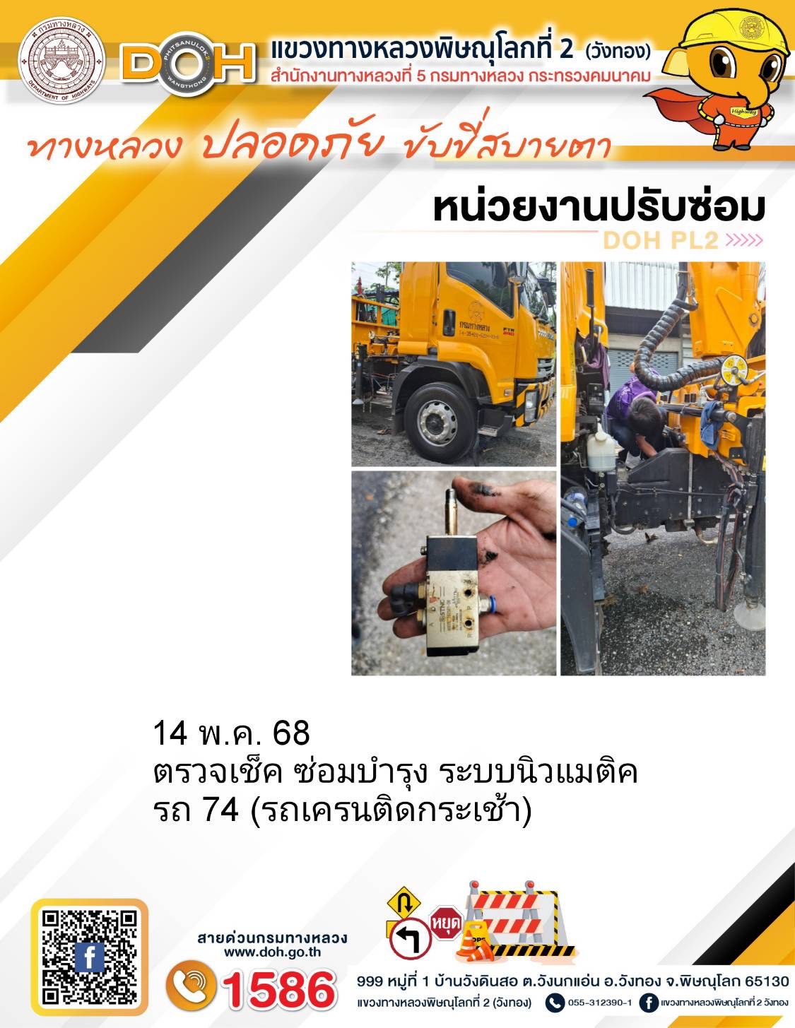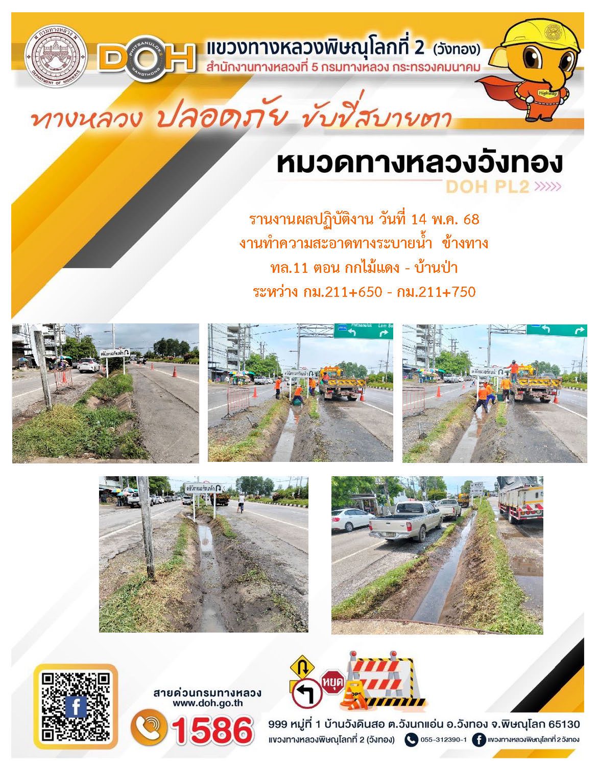 การปฏิบัติงานของ หมวดทางหลวง และ หน่วยงานในสังกัด เพื่ออำนวยความสะดวก และปลอดภัยให้กับประชาชนผู้ใช้เส้นทาง ประจำวันพุธ ที่ 14 พฤษภาคม 2568