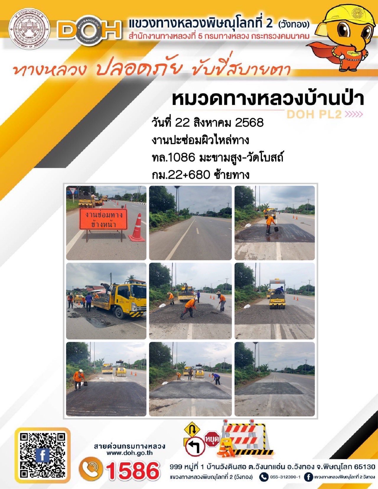 การปฏิบัติงานของ หมวดทางหลวง และ หน่วยงานในสังกัด เพื่ออำนวยความสะดวก และปลอดภัยให้กับประชาชนผู้ใช้เส้นทาง ประจำวันศุกร์ ที่ 22 สิงหาคม 2568