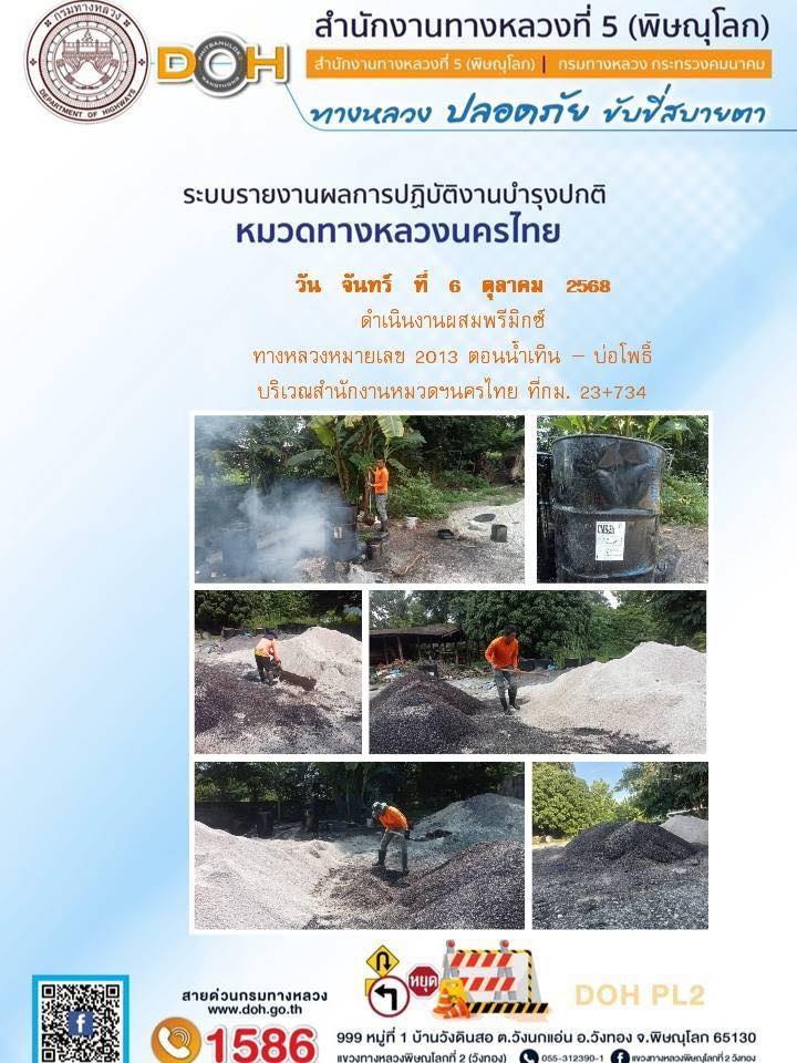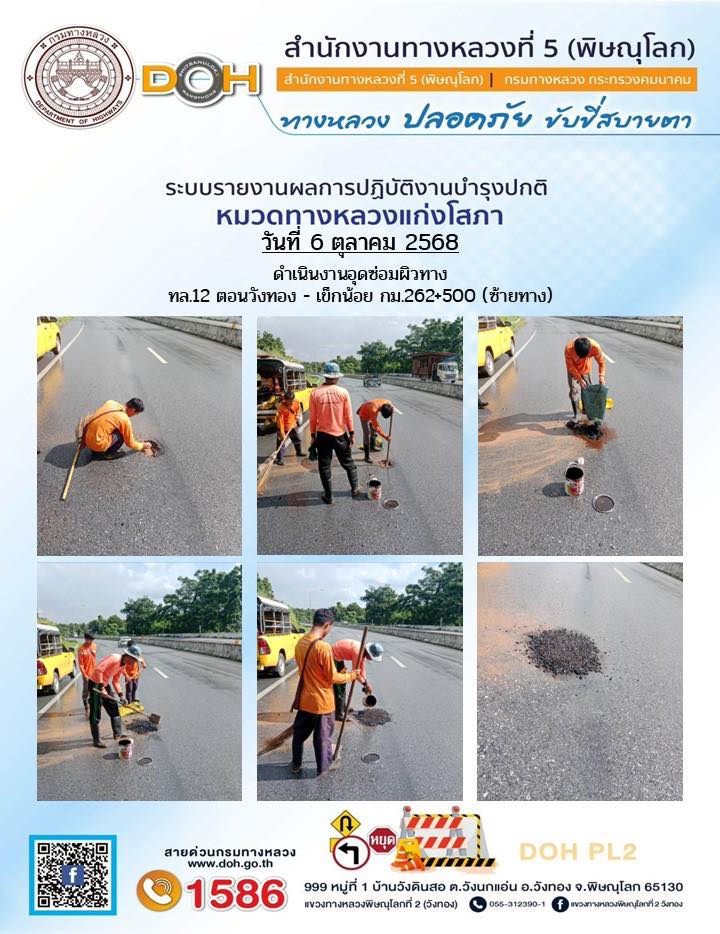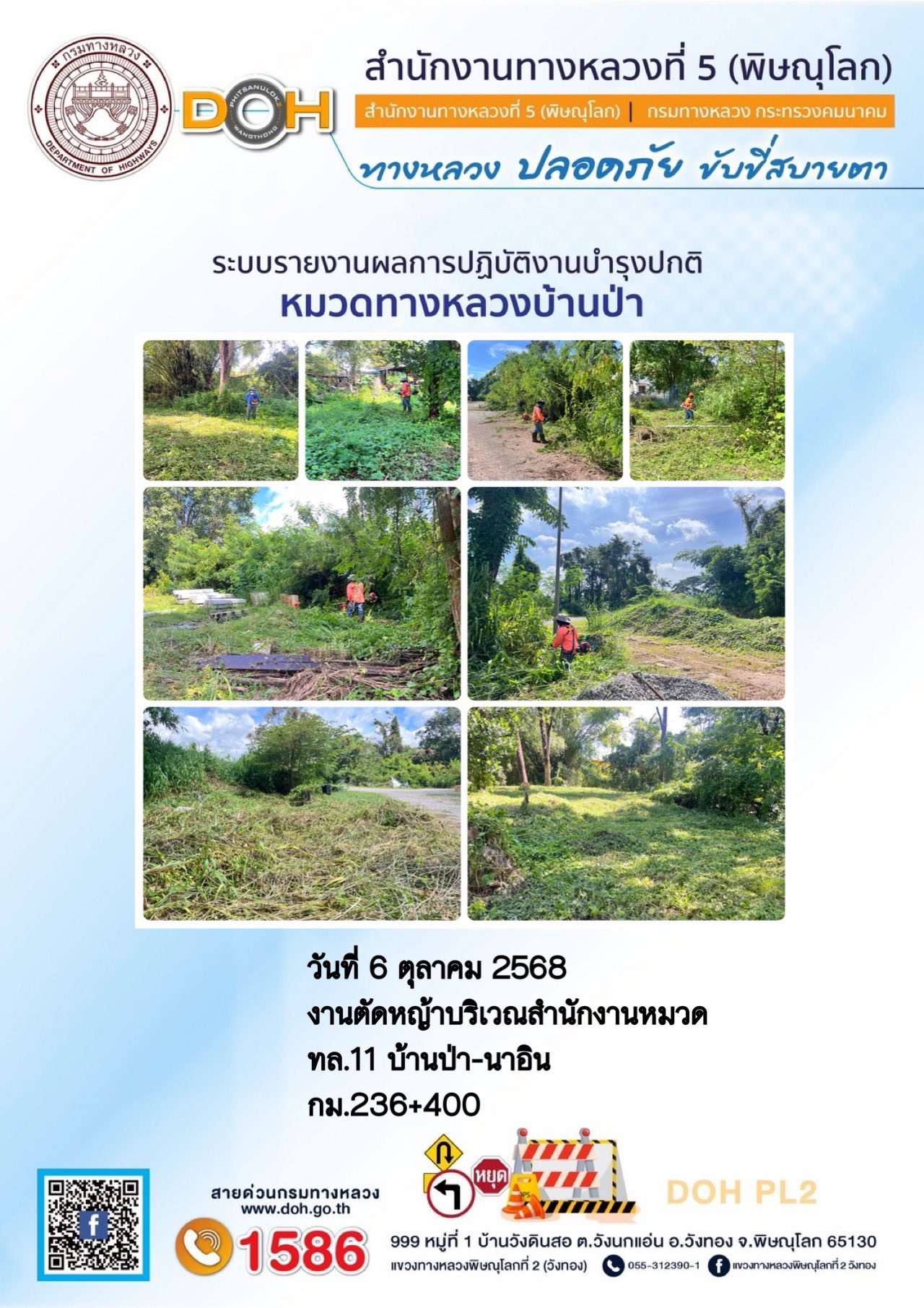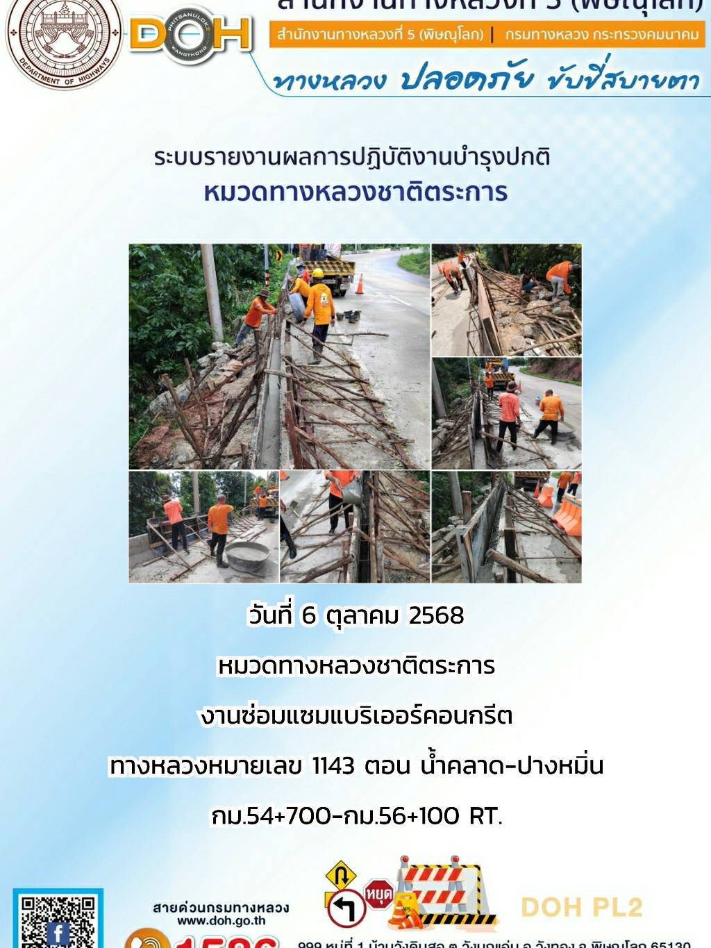 การปฏิบัติงานของ หมวดทางหลวง และ หน่วยงานในสังกัด เพื่ออำนวยความสะดวก และปลอดภัยให้กับประชาชนผู้ใช้เส้นทาง ประจำวันจันทร์ ที่ 6 ตุลาคม 2568