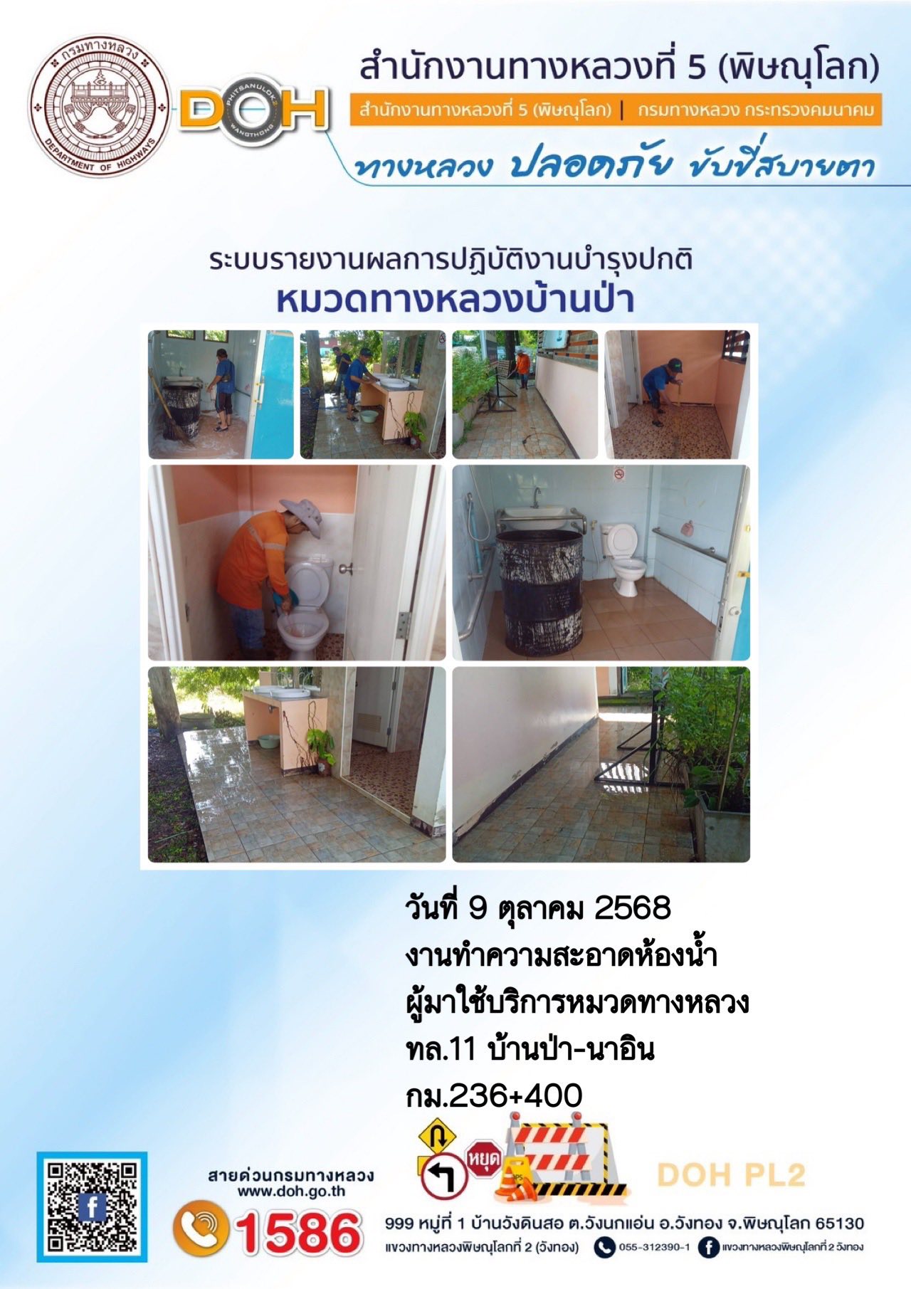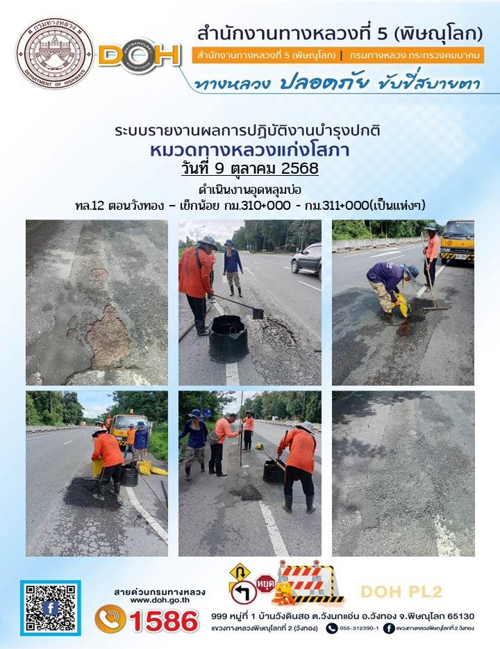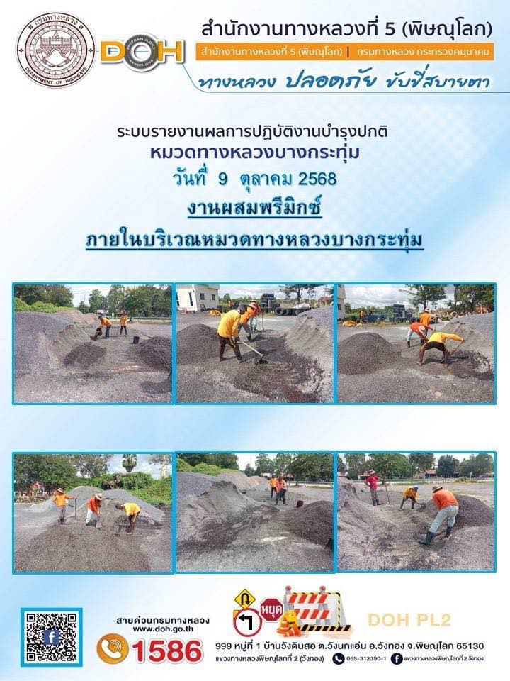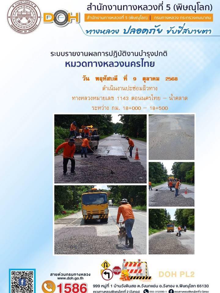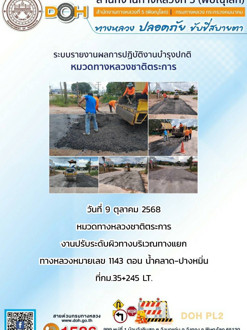 การปฏิบัติงานของ หมวดทางหลวง และ หน่วยงานในสังกัด เพื่ออำนวยความสะดวก และปลอดภัยให้กับประชาชนผู้ใช้เส้นทาง ประจำวันพฤหัสบดี ที่ 9 ตุลาคม 2568