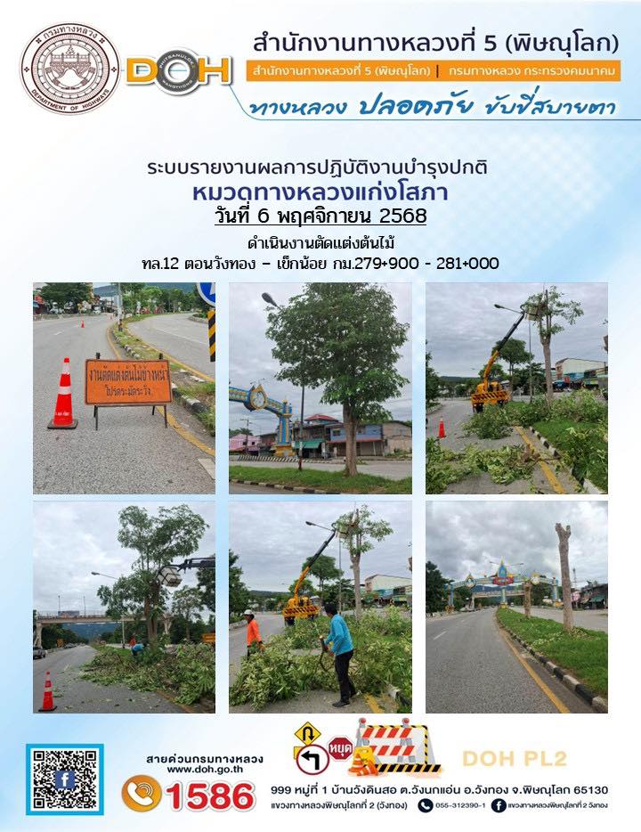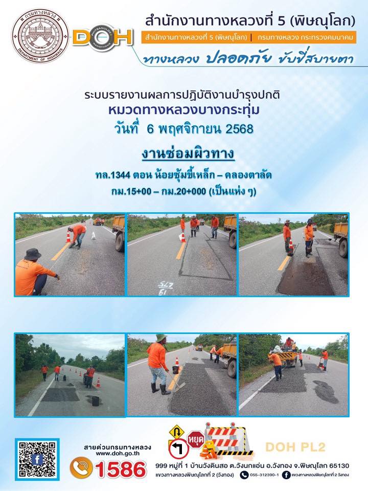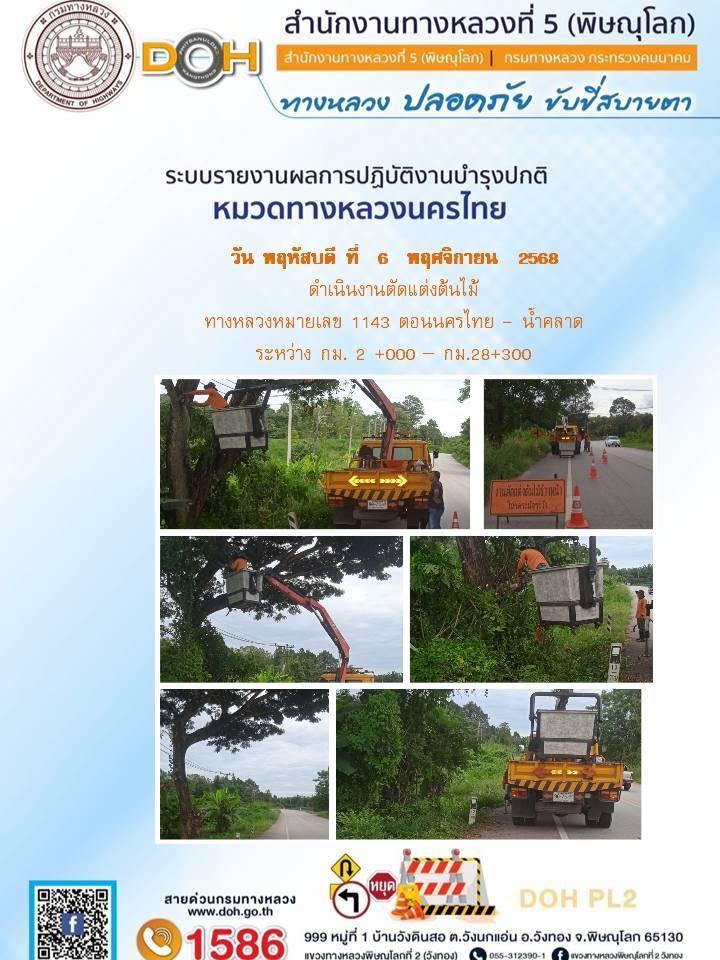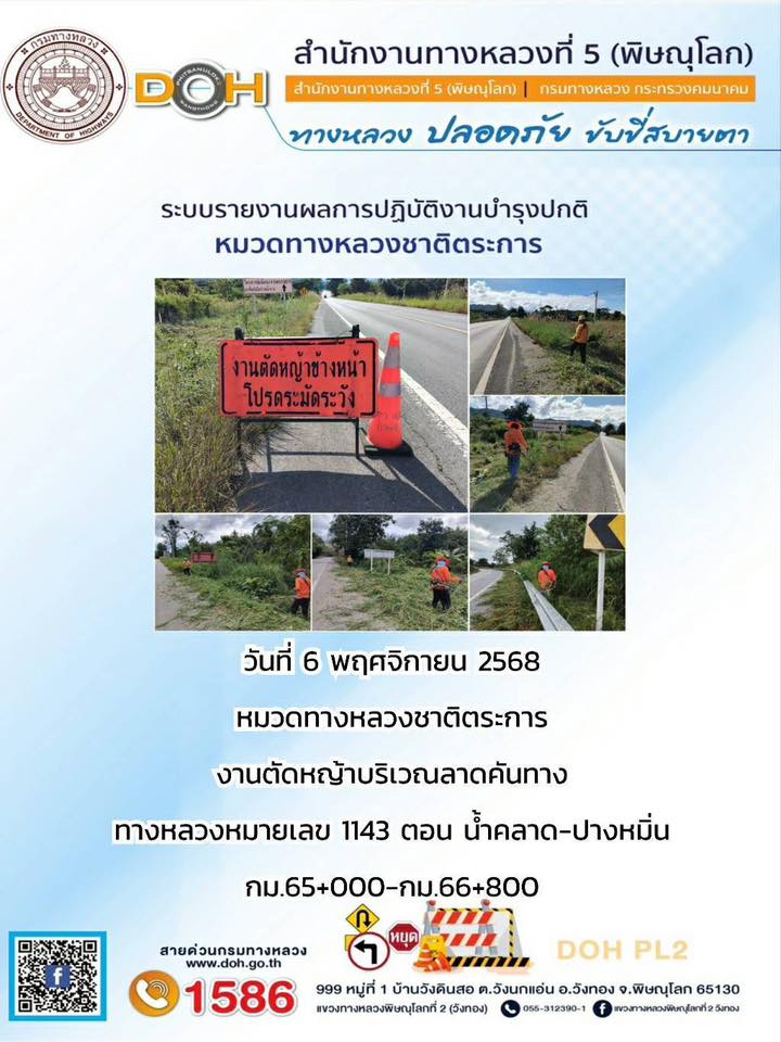 การปฏิบัติงานของ หมวดทางหลวง และ หน่วยงานในสังกัด เพื่ออำนวยความสะดวก และปลอดภัยให้กับประชาชนผู้ใช้เส้นทาง ประจำวันพฤหัสบดี ที่ 6 พฤศจิกายน 2568