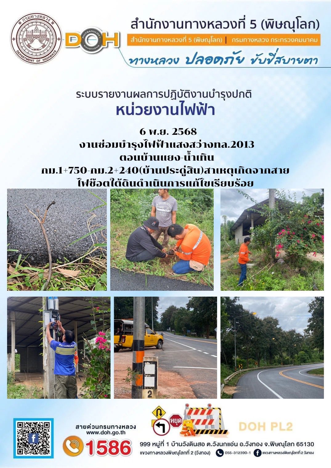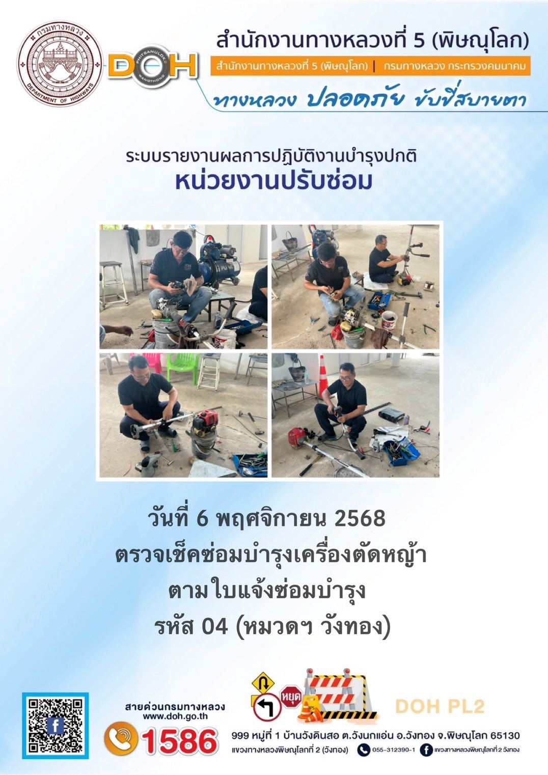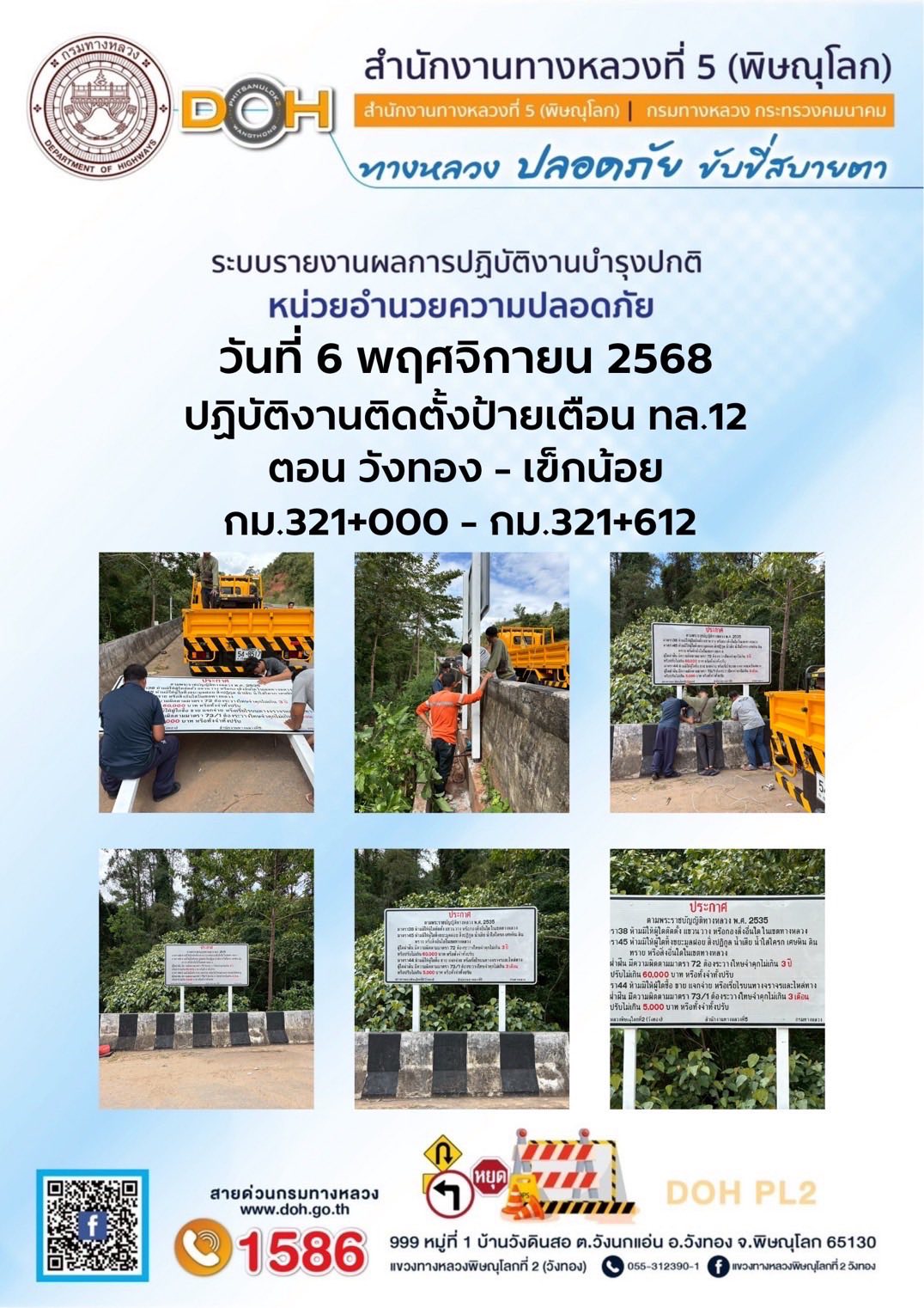 การปฏิบัติงานของ หมวดทางหลวง และ หน่วยงานในสังกัด เพื่ออำนวยความสะดวก และปลอดภัยให้กับประชาชนผู้ใช้เส้นทาง ประจำวันพฤหัสบดี ที่ 6 พฤศจิกายน 2568