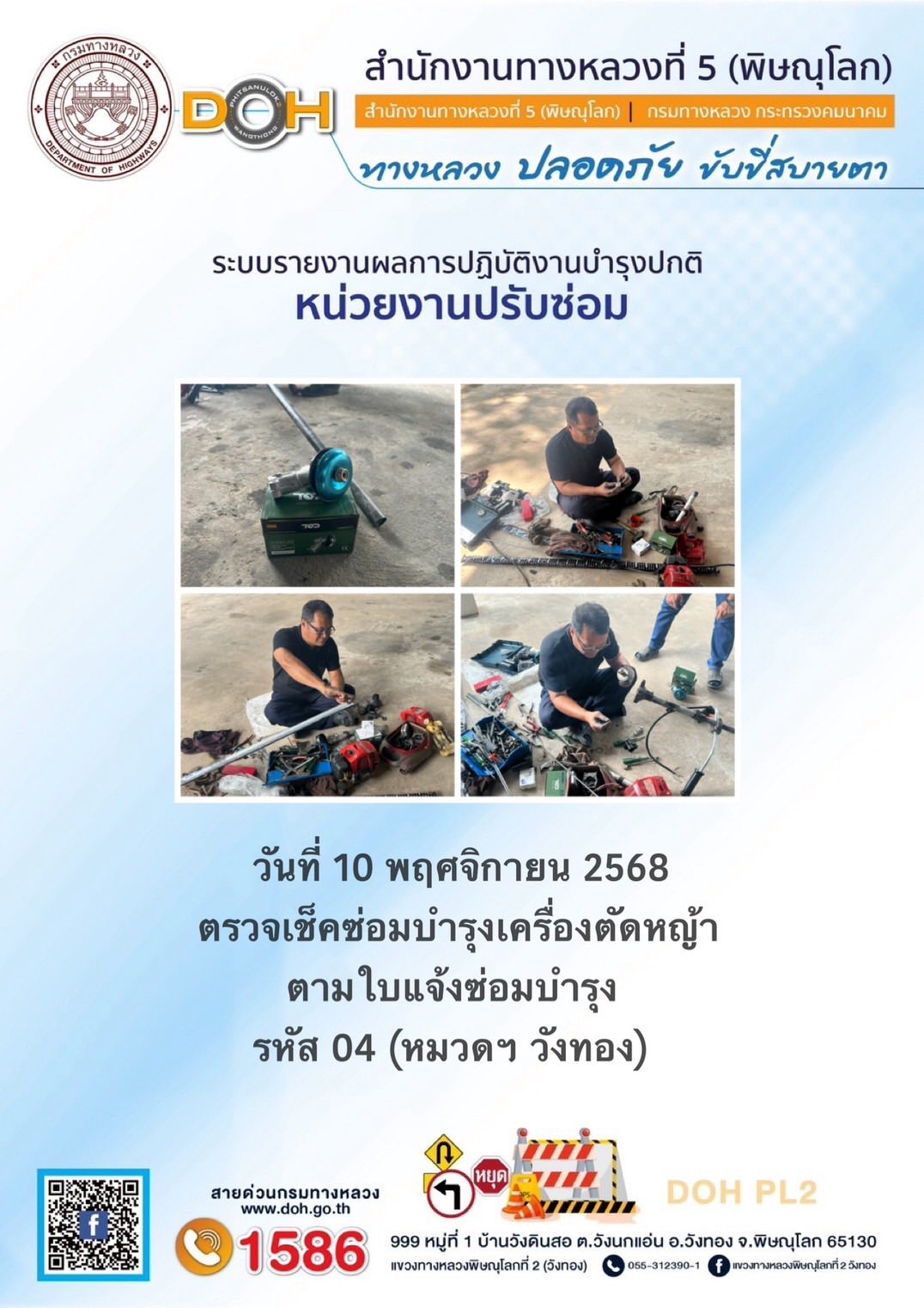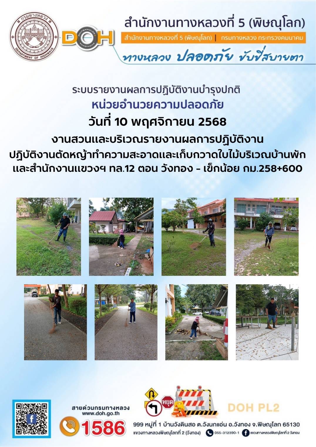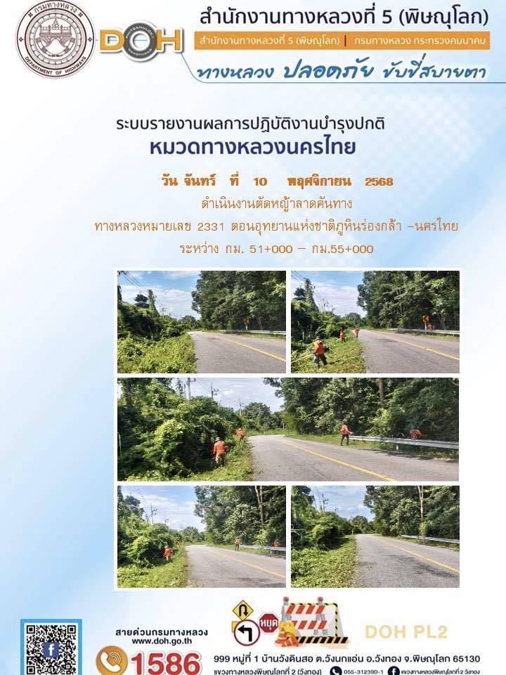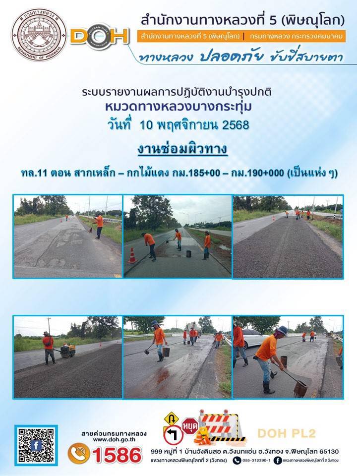 การปฏิบัติงานของ หมวดทางหลวง และ หน่วยงานในสังกัด เพื่ออำนวยความสะดวก และปลอดภัยให้กับประชาชนผู้ใช้เส้นทาง ประจำวันจันทร์ ที่ 10 พฤศจิกายน 2568