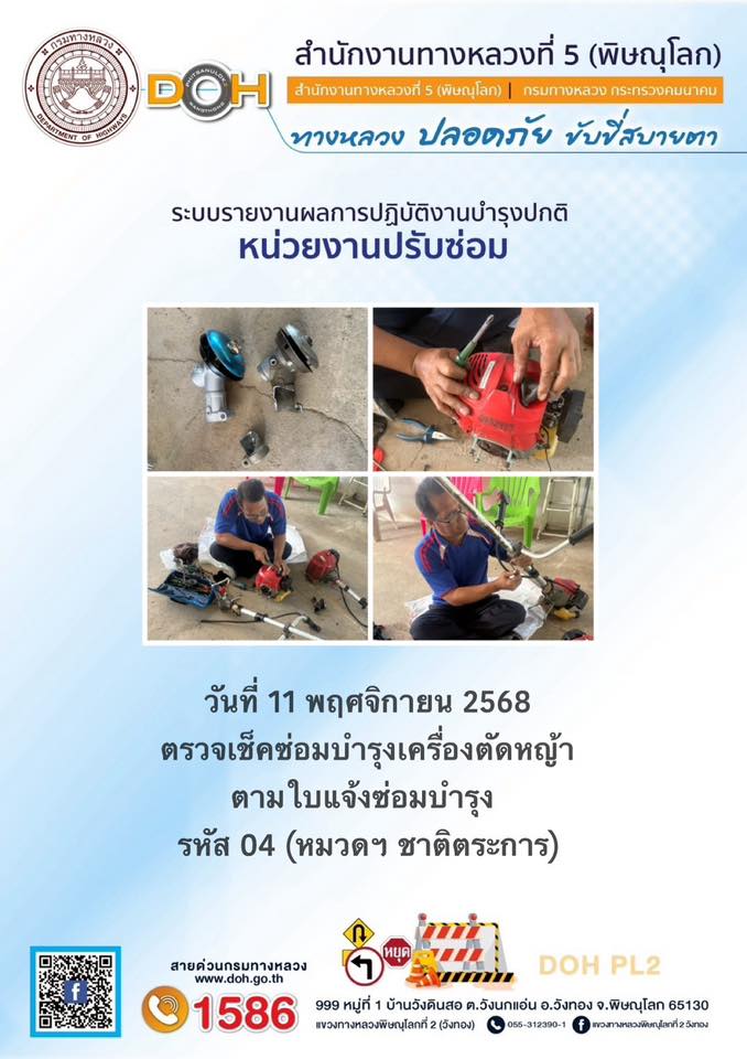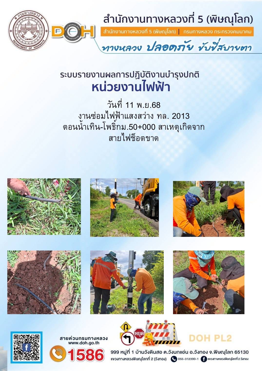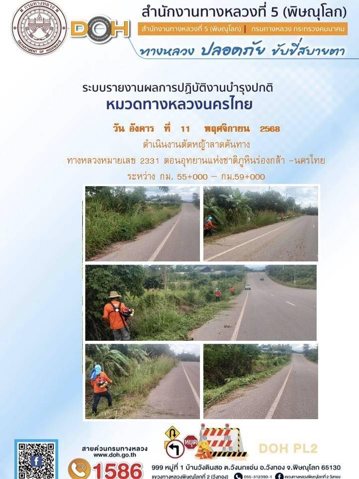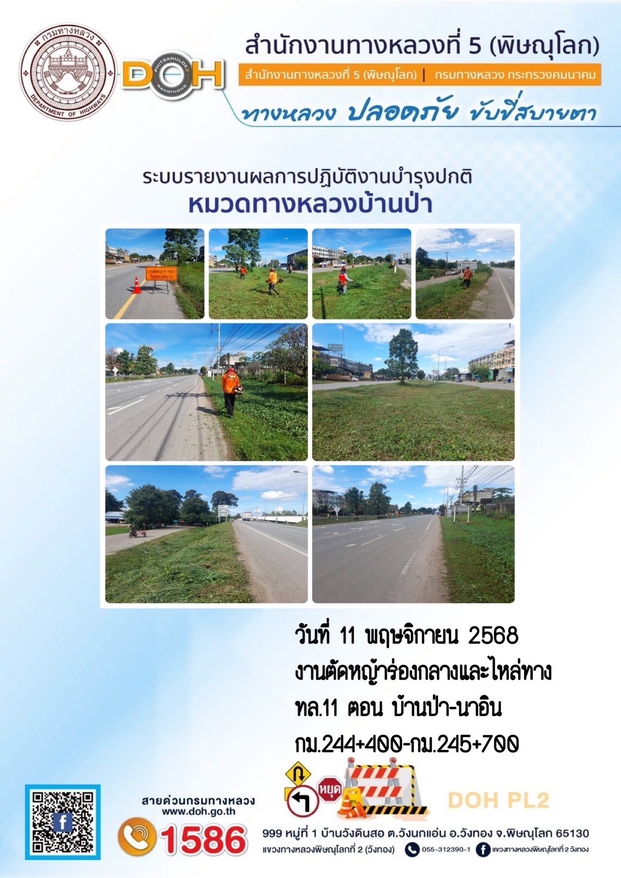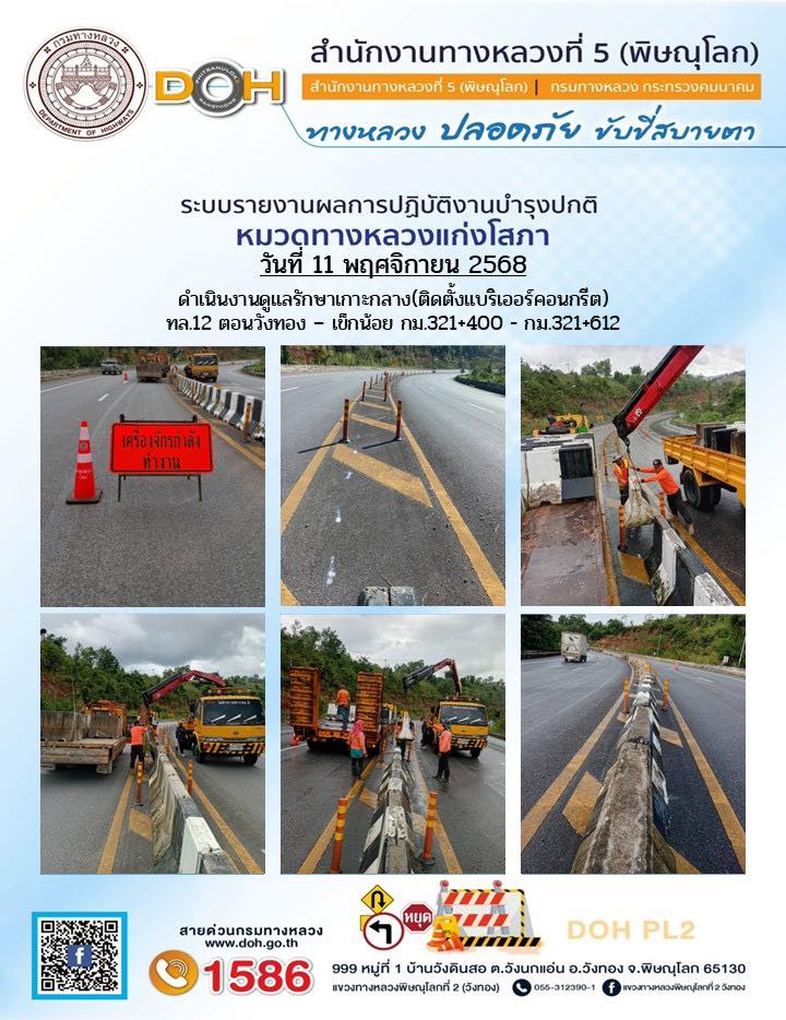 การปฏิบัติงานของ หมวดทางหลวง และ หน่วยงานในสังกัด เพื่ออำนวยความสะดวก และปลอดภัยให้กับประชาชนผู้ใช้เส้นทาง ประจำวันอังคาร ที่ 11 พฤศจิกายน 2568