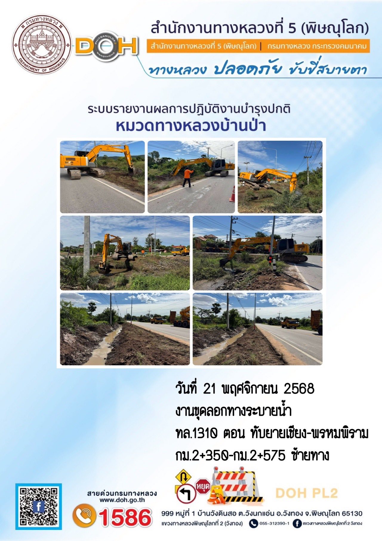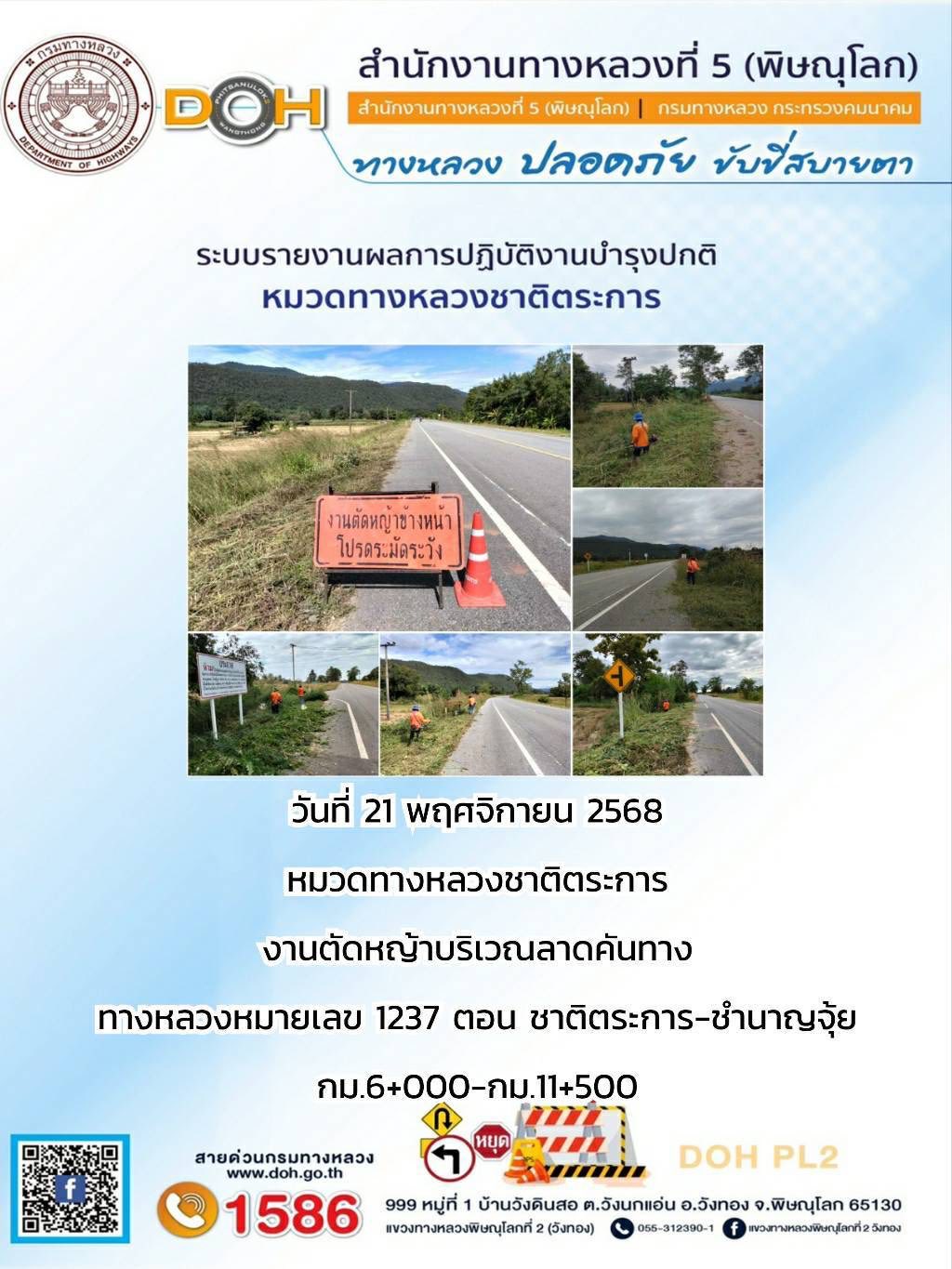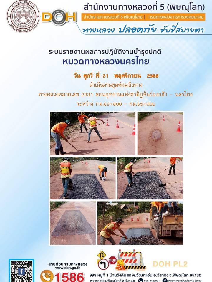 การปฏิบัติงานของ หมวดทางหลวง และ หน่วยงานในสังกัด เพื่ออำนวยความสะดวก และปลอดภัยให้กับประชาชนผู้ใช้เส้นทาง ประจำวันศุกร์ ที่ 21 พฤศจิกายน 2568