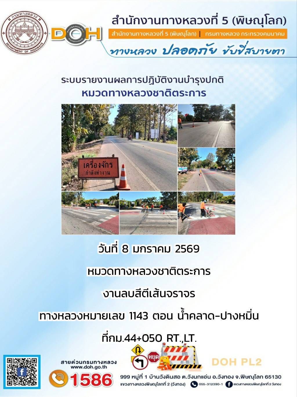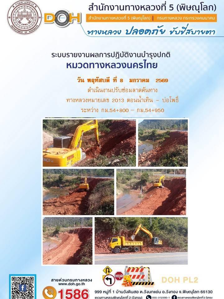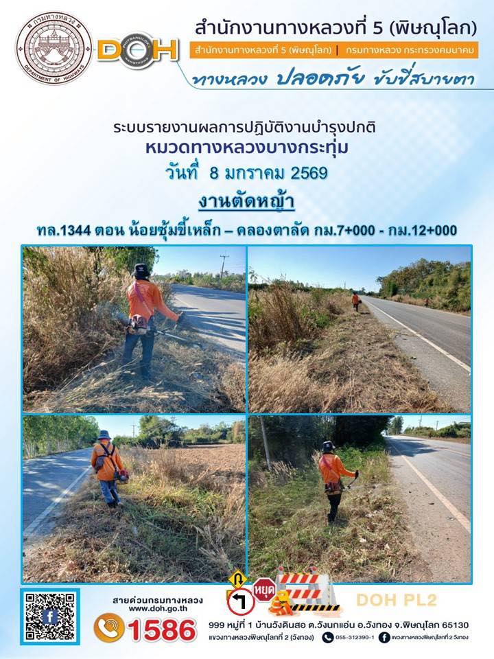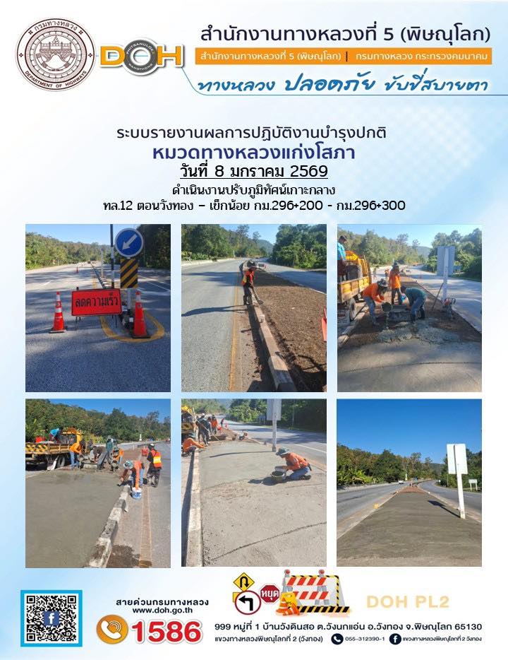 การปฏิบัติงานของ หมวดทางหลวง และ หน่วยงานในสังกัด เพื่ออำนวยความสะดวก และปลอดภัยให้กับประชาชนผู้ใช้เส้นทาง ประจำวันพฤหัสบดี ที่ 8 มกราคม 2569
