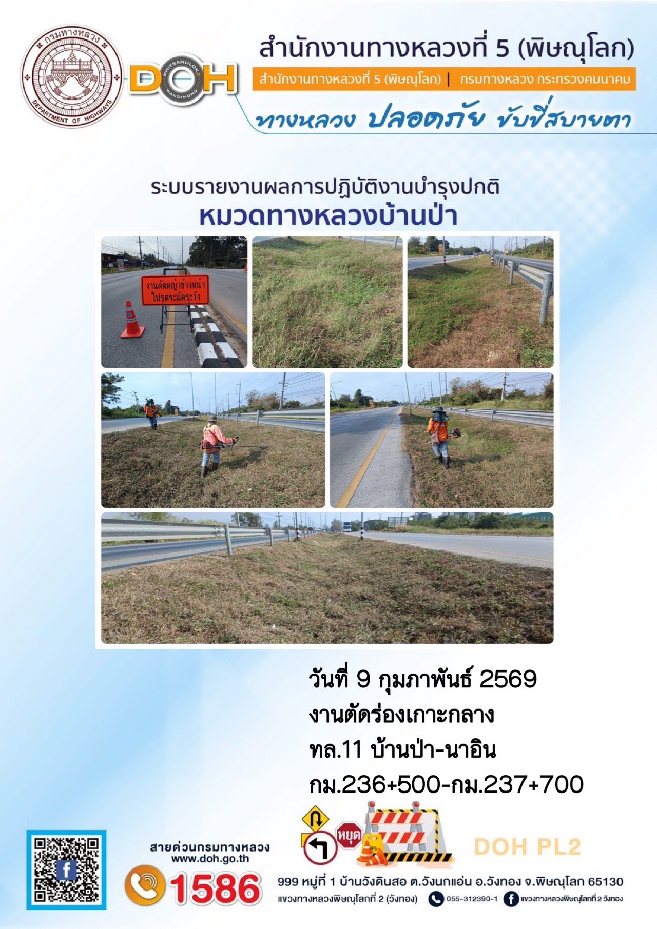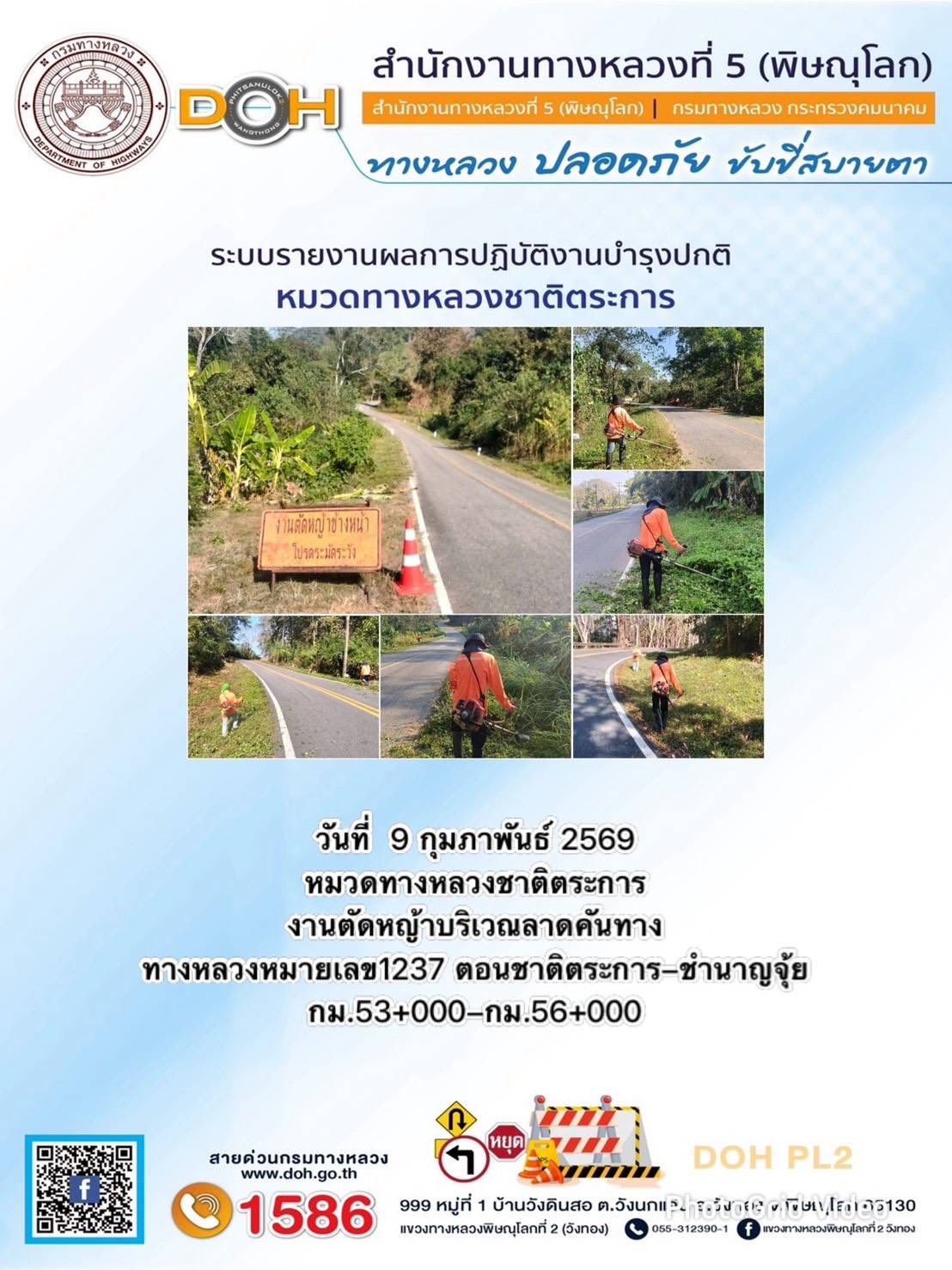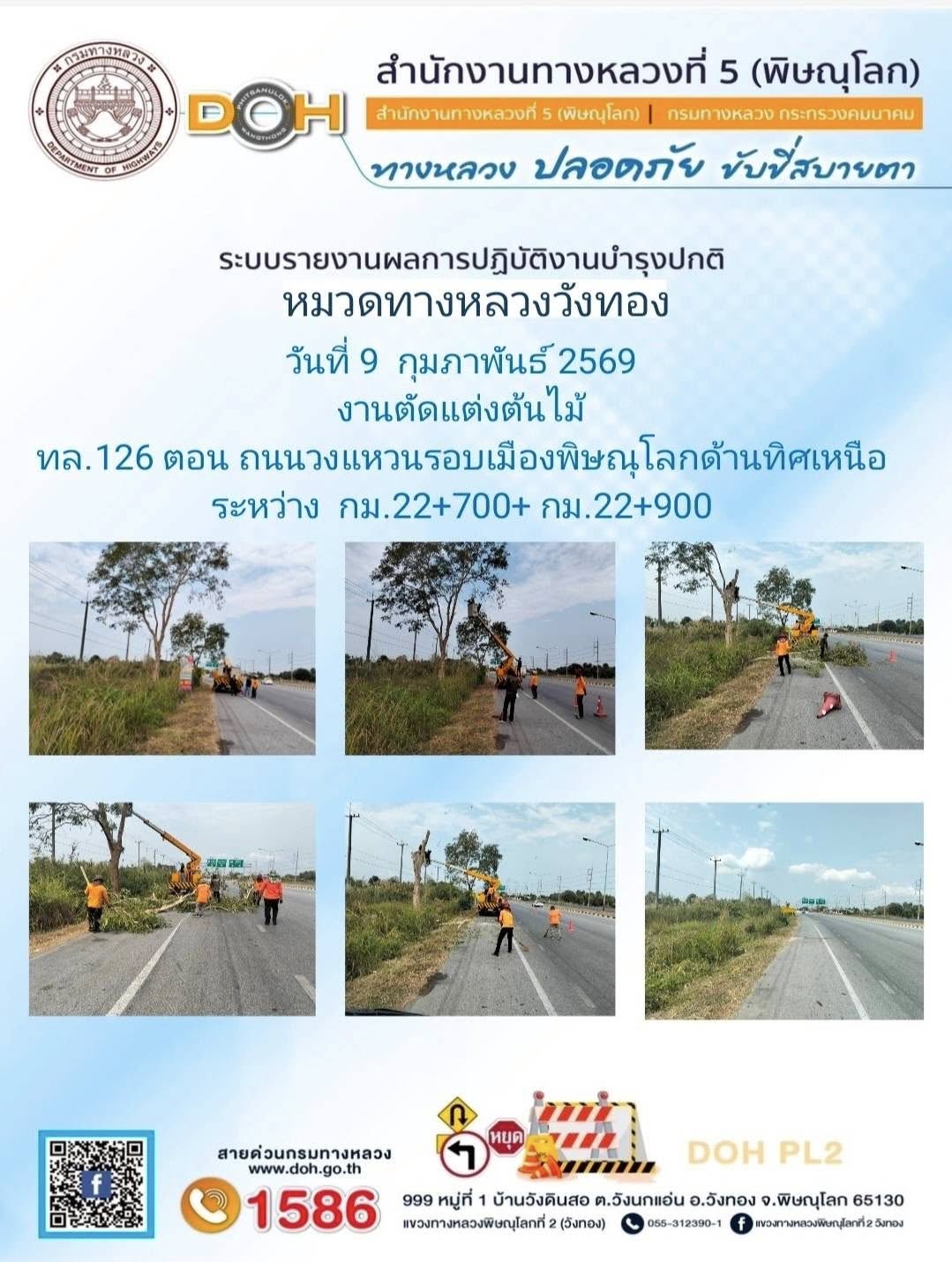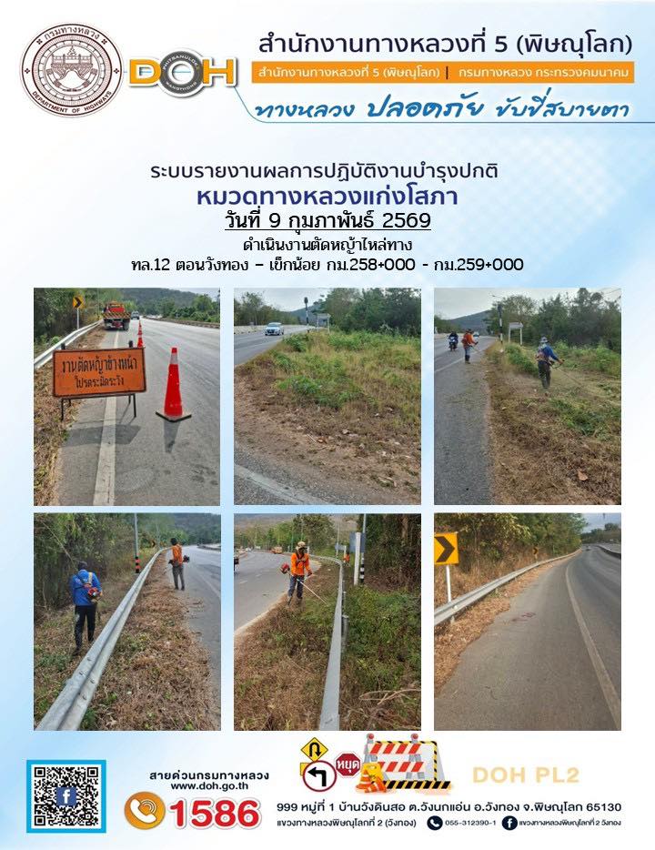 การปฏิบัติงานของ หมวดทางหลวง และ หน่วยงานในสังกัด เพื่ออำนวยความสะดวก และปลอดภัยให้กับประชาชนผู้ใช้เส้นทาง ประจำวันจันทร์ ที่ 9 กุมภาพันธ์ 2569