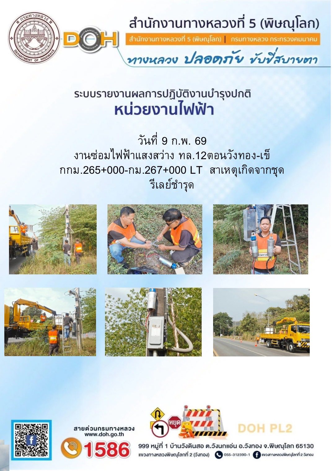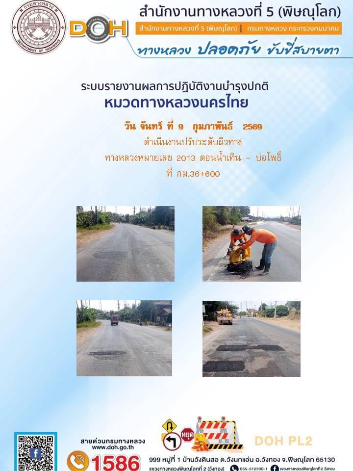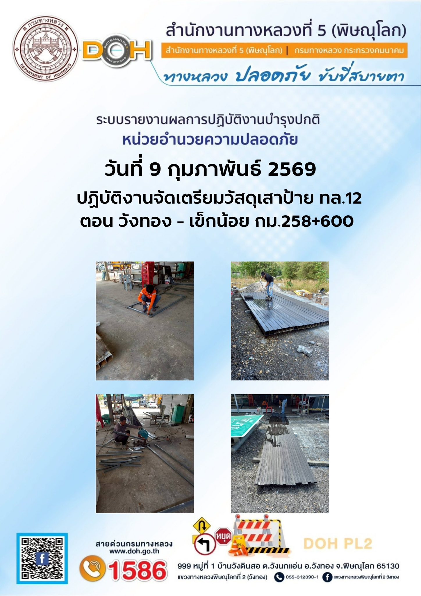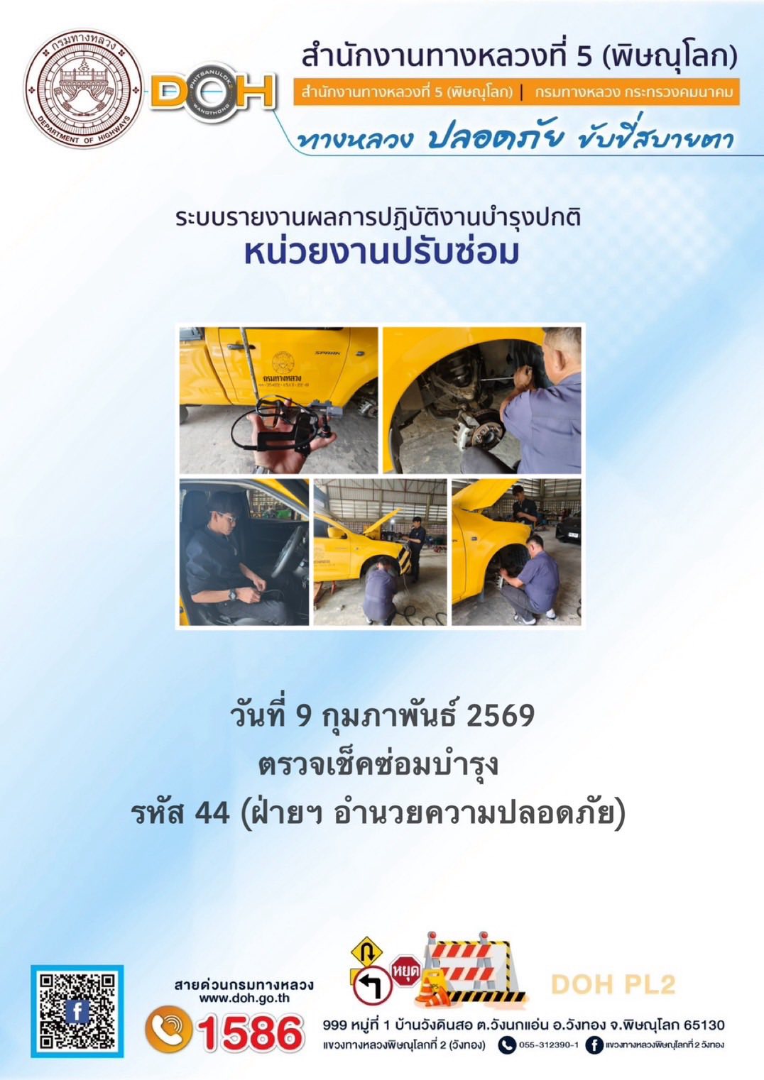 การปฏิบัติงานของ หมวดทางหลวง และ หน่วยงานในสังกัด เพื่ออำนวยความสะดวก และปลอดภัยให้กับประชาชนผู้ใช้เส้นทาง ประจำวันจันทร์ ที่ 9 กุมภาพันธ์ 2569