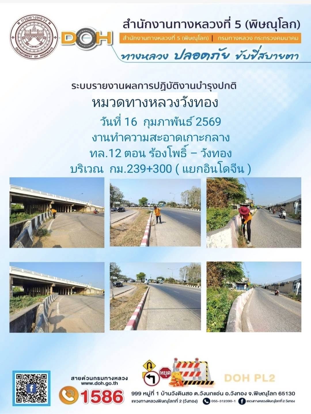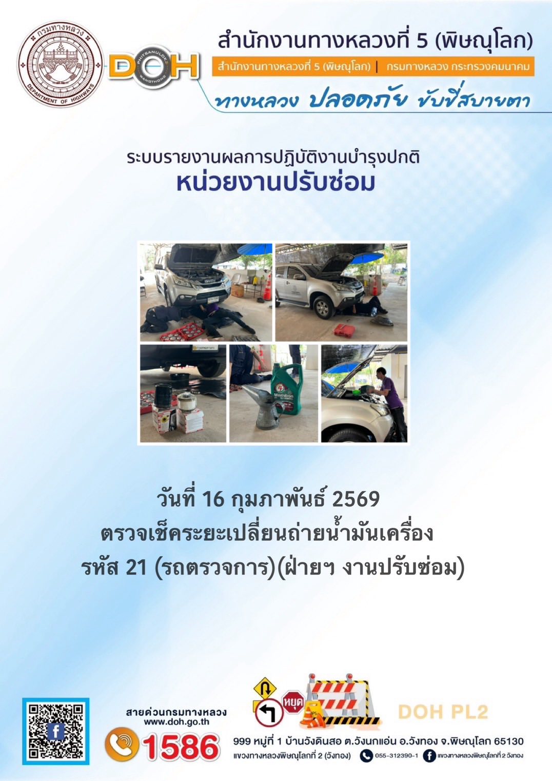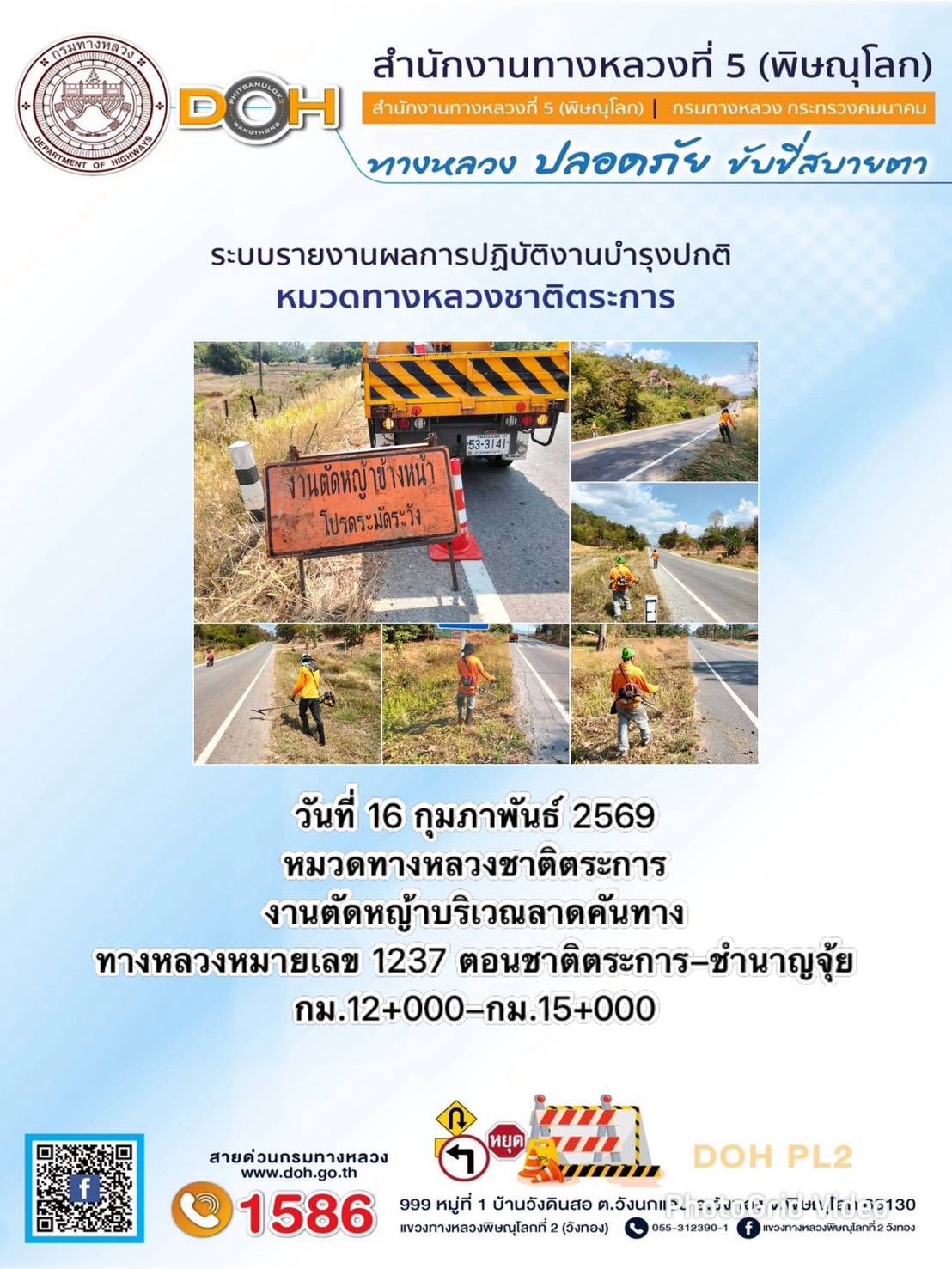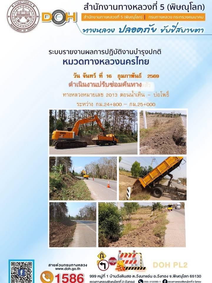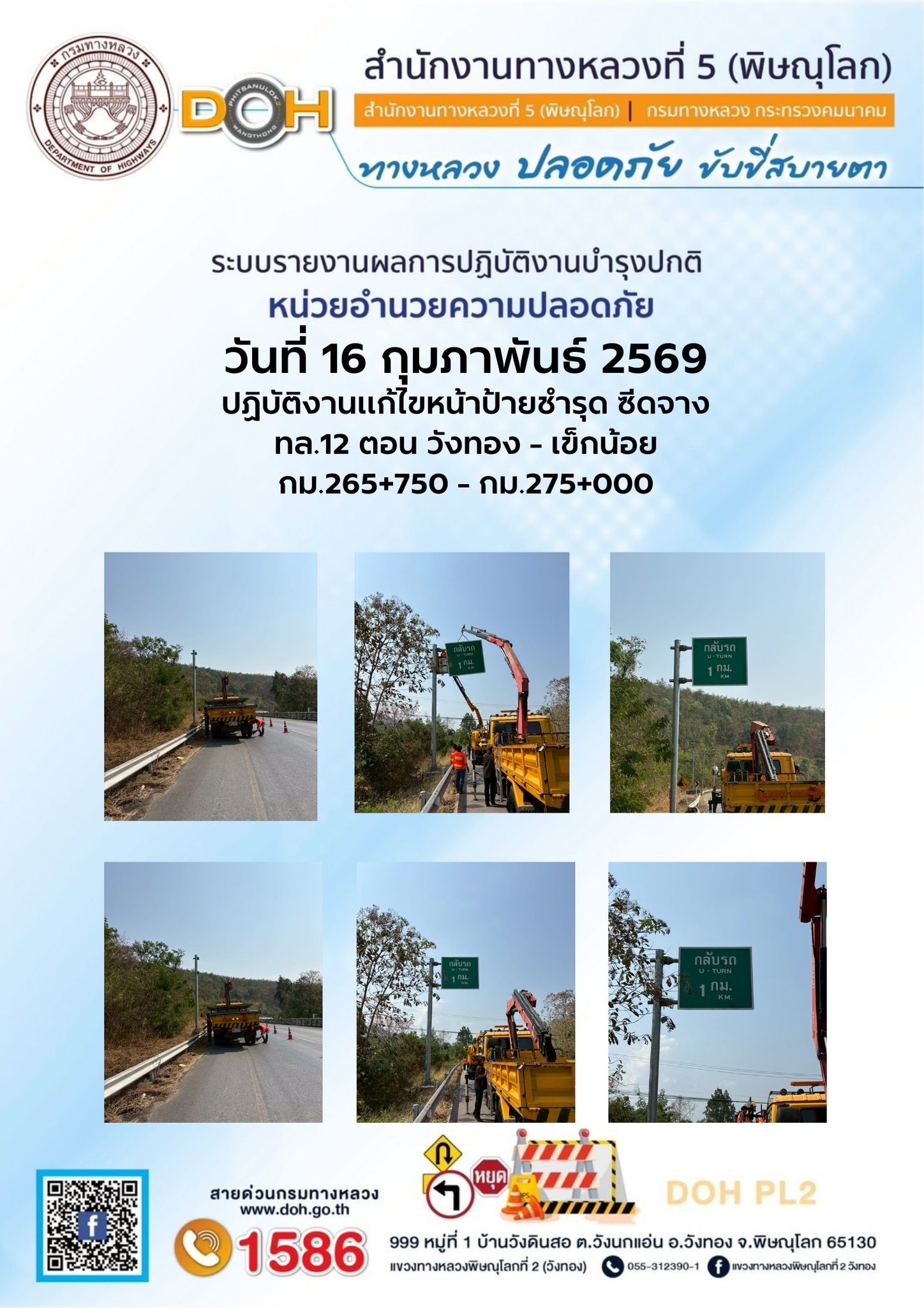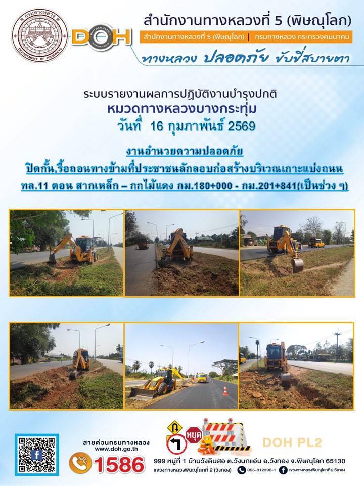 การปฏิบัติงานของ หมวดทางหลวง และ หน่วยงานในสังกัด เพื่ออำนวยความสะดวก และปลอดภัยให้กับประชาชนผู้ใช้เส้นทาง ประจำวันจันทร์ ที่ 16 กุมภาพันธ์ 2569