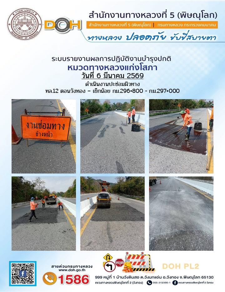 การปฏิบัติงานของ หมวดทางหลวง และ หน่วยงานในสังกัด เพื่ออำนวยความสะดวก และปลอดภัยให้กับประชาชนผู้ใช้เส้นทาง ประจำวันศุกร์ ที่ 6 กุมภาพันธ์ 2569