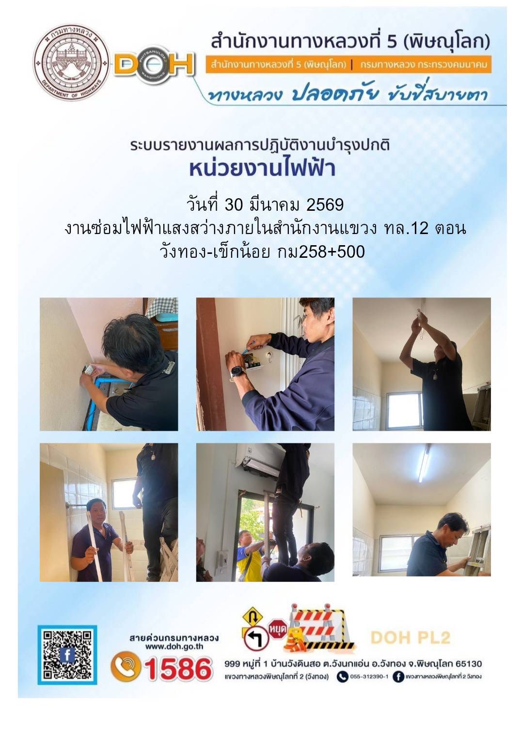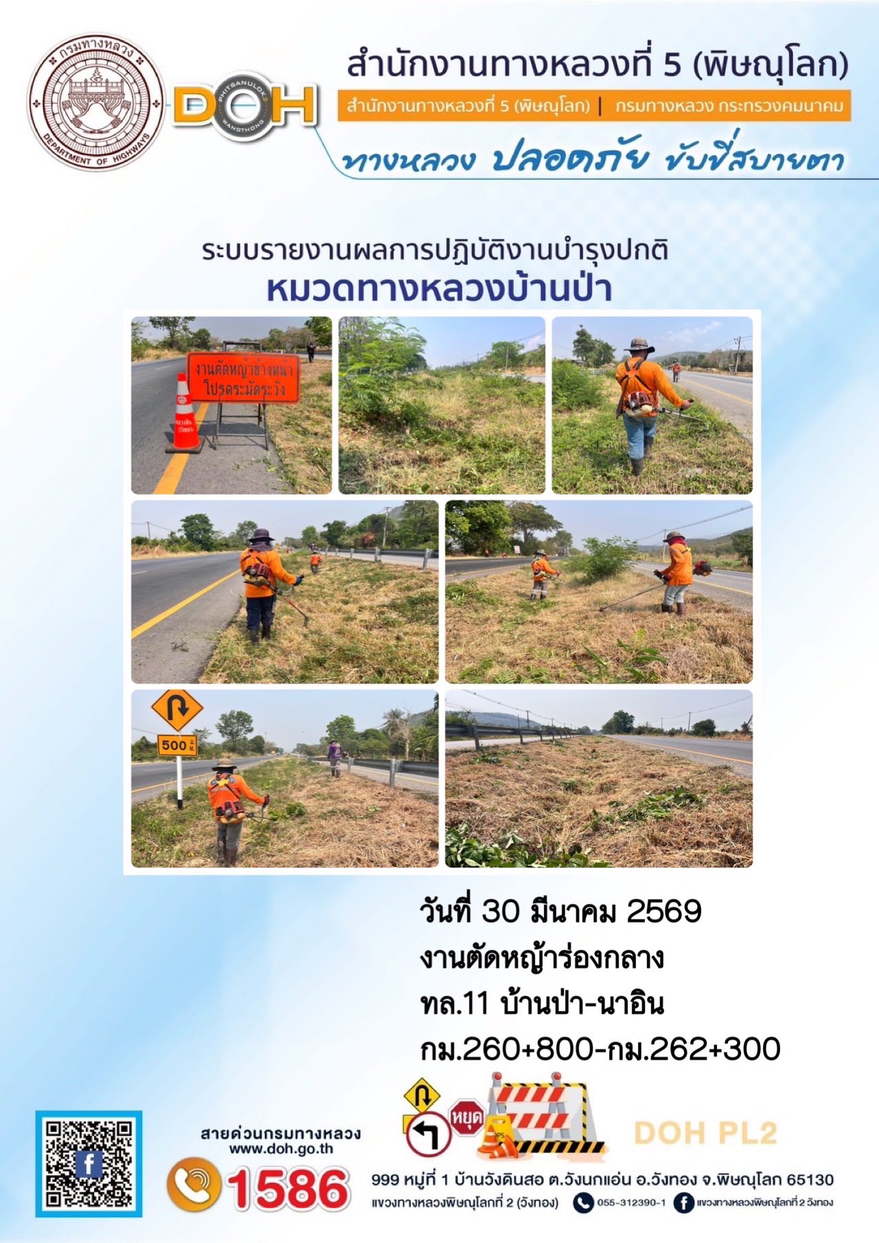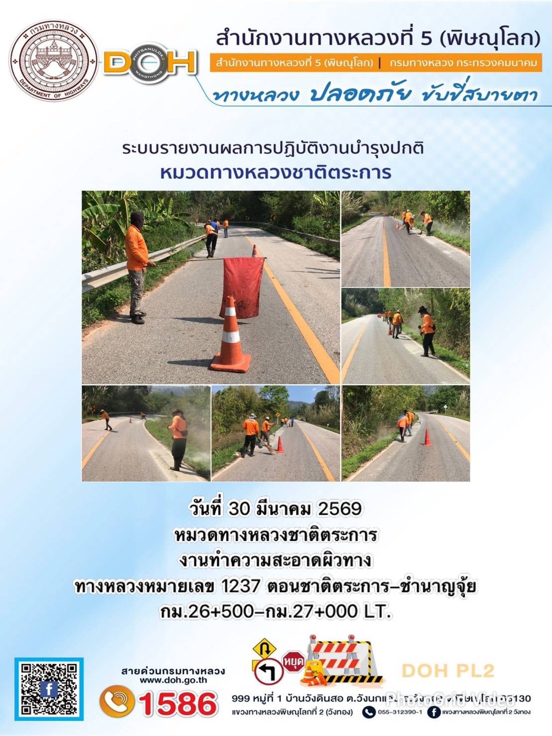 การปฏิบัติงานของ หมวดทางหลวง และ หน่วยงานในสังกัด เพื่ออำนวยความสะดวก และปลอดภัยให้กับประชาชนผู้ใช้เส้นทาง ประจำวันจันทร์ ที่ 30 มีนาคม 2569