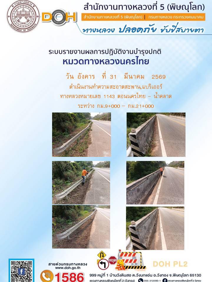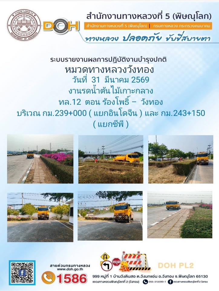 การปฏิบัติงานของ หมวดทางหลวง และ หน่วยงานในสังกัด เพื่ออำนวยความสะดวก และปลอดภัยให้กับประชาชนผู้ใช้เส้นทาง ประจำวันอังคาร ที่ 31 มีนาคม 2569
