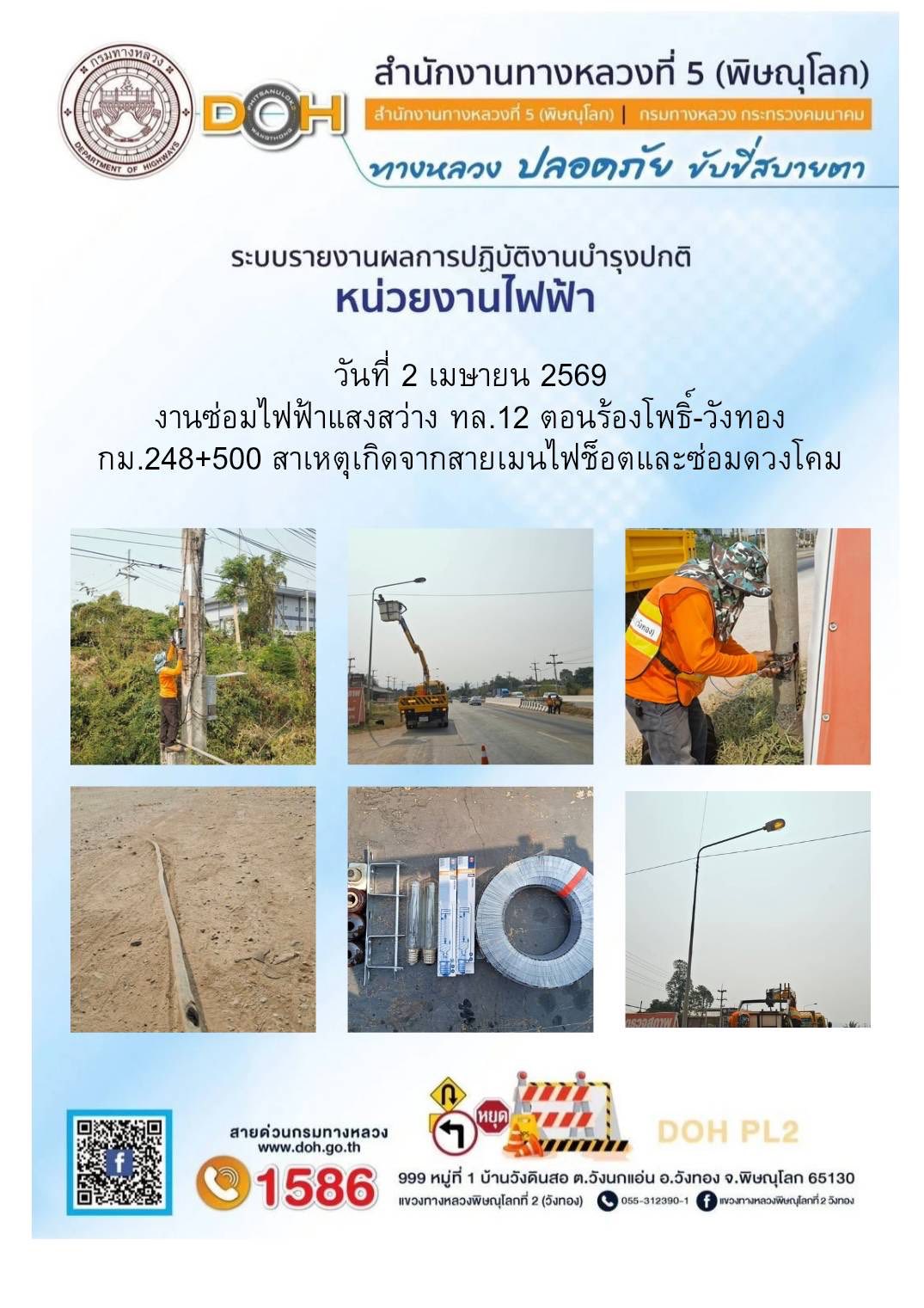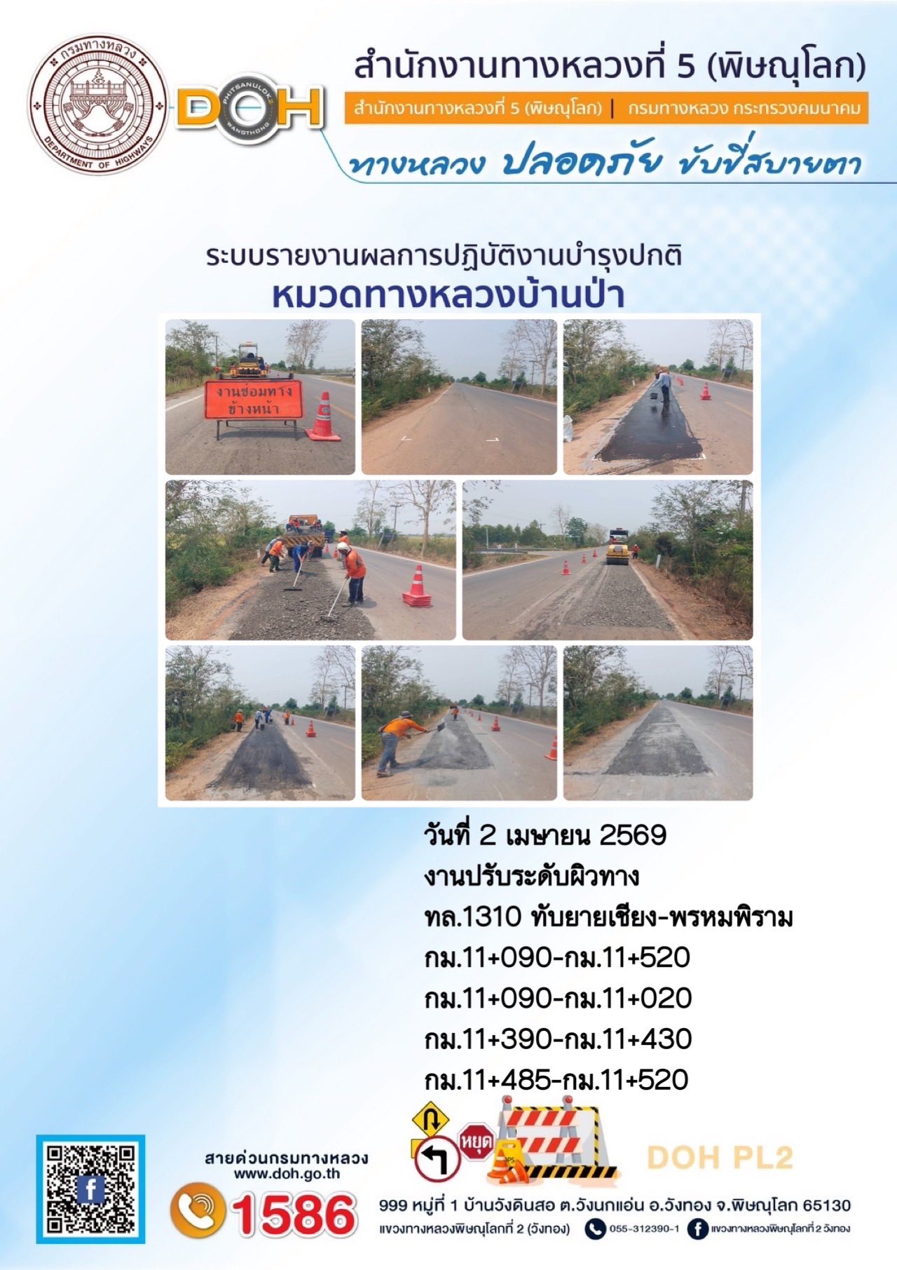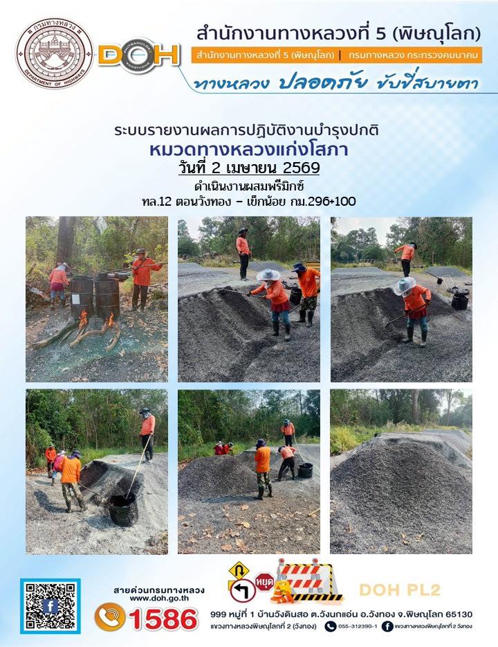 การปฏิบัติงานของ หมวดทางหลวง และ หน่วยงานในสังกัด เพื่ออำนวยความสะดวก และปลอดภัยให้กับประชาชนผู้ใช้เส้นทาง ประจำวันพฤหัสบดี ที่ 2 เมษายน 2569