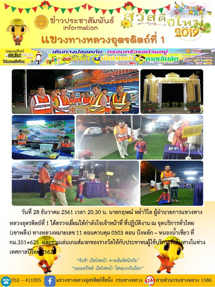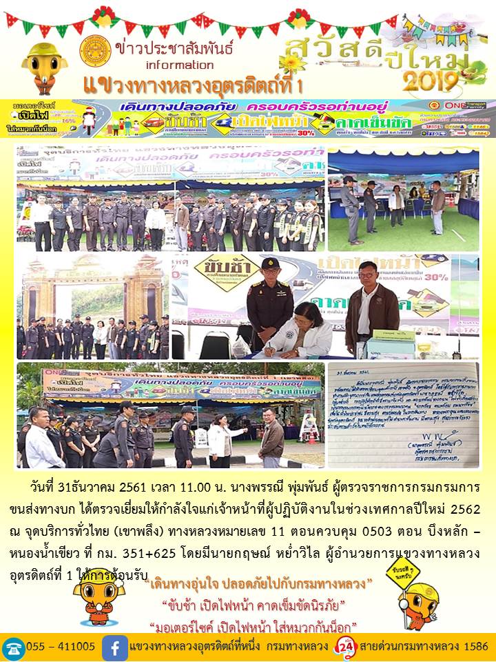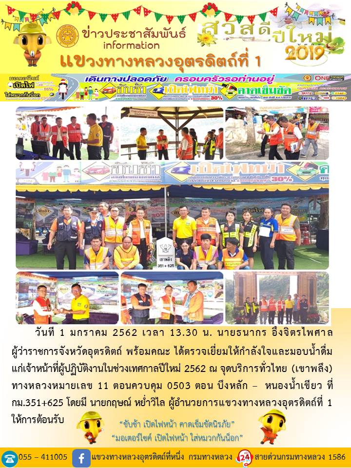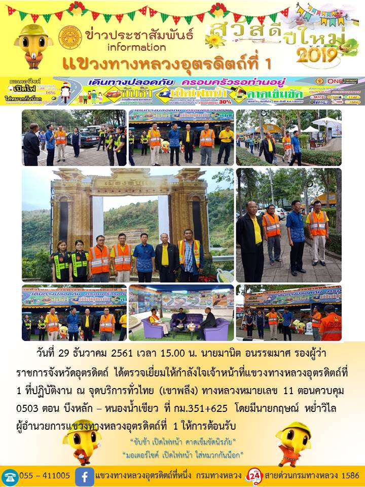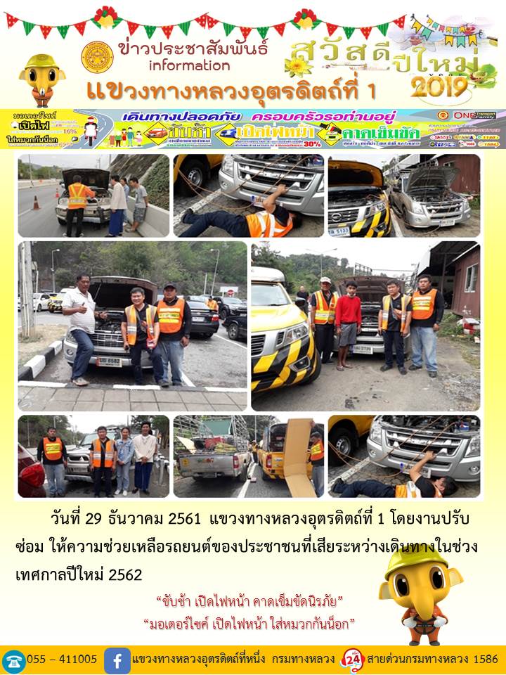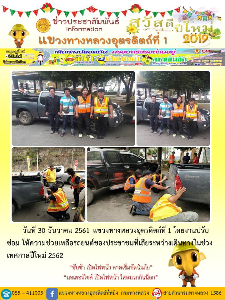 แขวงทางหลวงอุตรดิตถ์ที่ 1 ได้จัดชุดเจ้าหน้าที่ เพื่อปฏิบัติหน้าที่ค่อยบริการพี่น้องประชาชนที่เดินในช่วงเทศกาลปีใหม่ 2562 ตลอด 24 ชั่วโมง ระหว่างวันที่ 27 ธันวาคม 2561 ถึง วันที่ 2 มกราคม 2562 เพื่อให้การเดินทางของทุกท่านถึงที่หมายด้วยความปลอดภัย