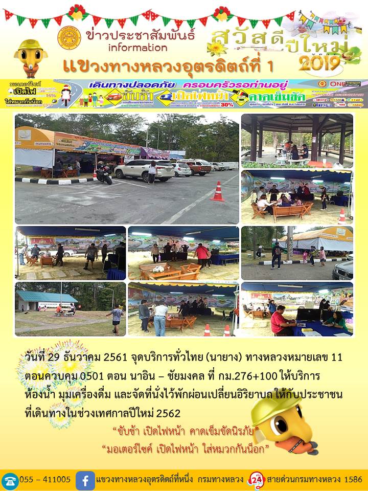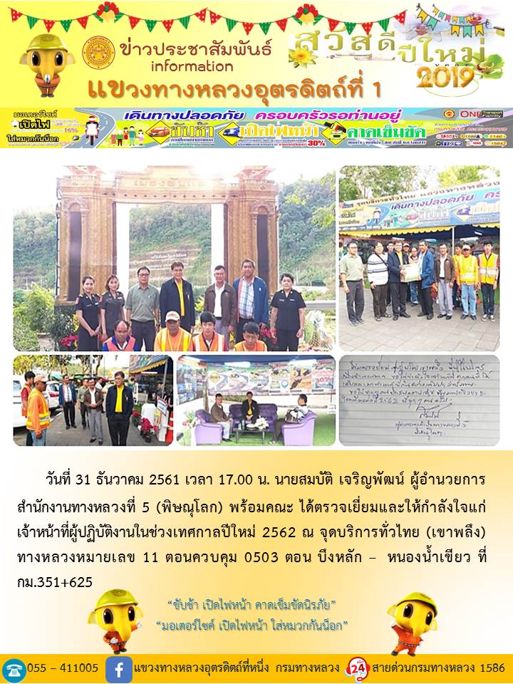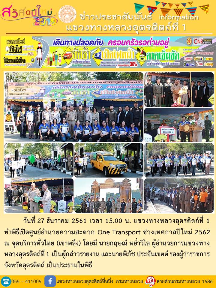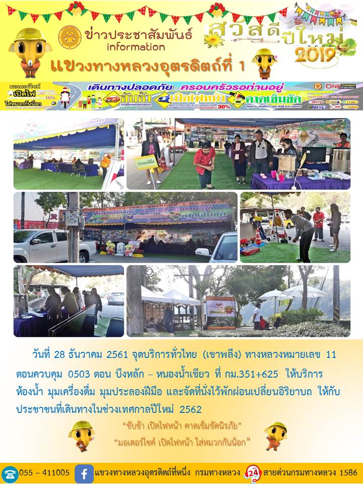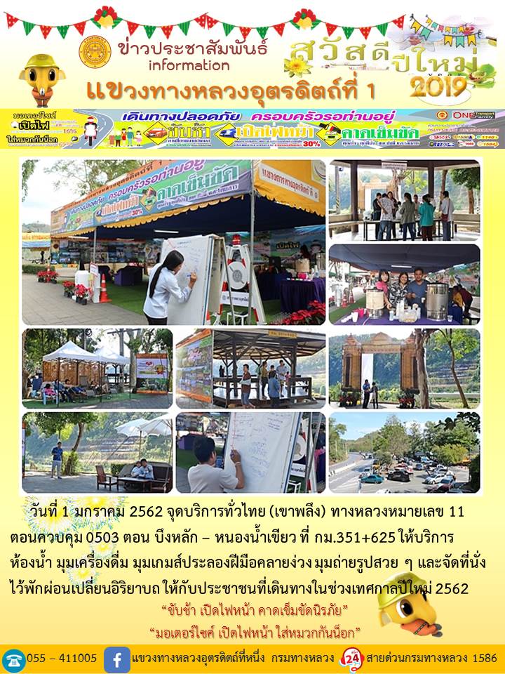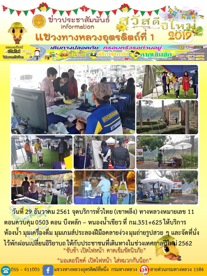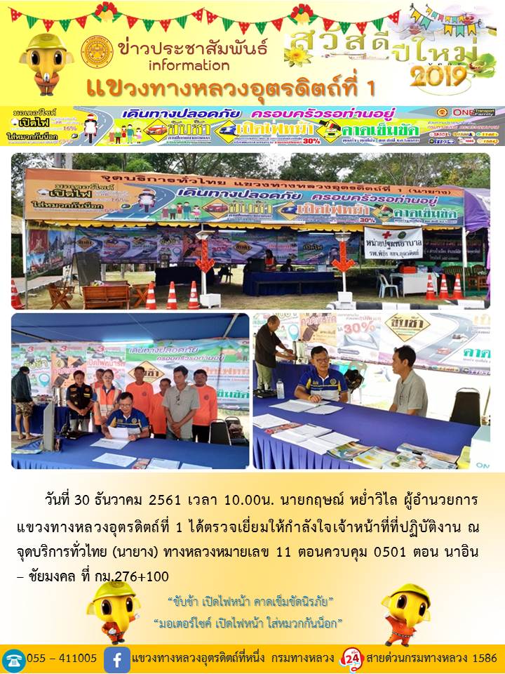 แขวงทางหลวงอุตรดิตถ์ที่ 1 ได้จัดชุดเจ้าหน้าที่ เพื่อปฏิบัติหน้าที่ค่อยบริการพี่น้องประชาชนที่เดินในช่วงเทศกาลปีใหม่ 2562 ตลอด 24 ชั่วโมง ระหว่างวันที่ 27 ธันวาคม 2561 ถึง วันที่ 2 มกราคม 2562 เพื่อให้การเดินทางของทุกท่านถึงที่หมายด้วยความปลอดภัย