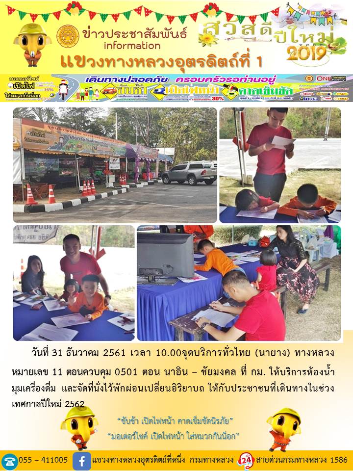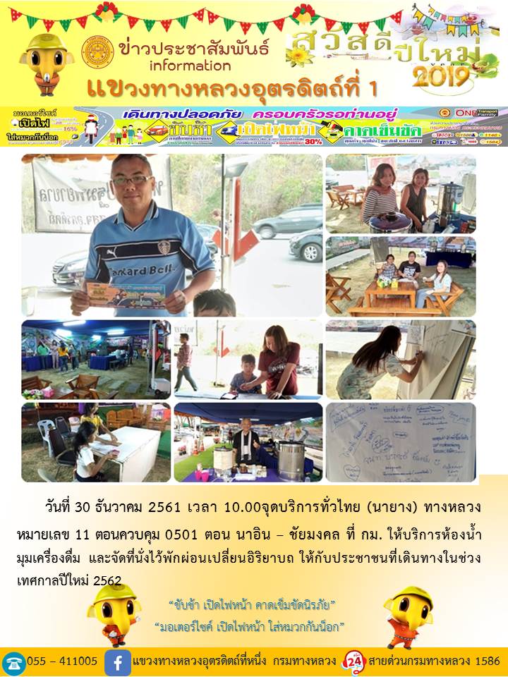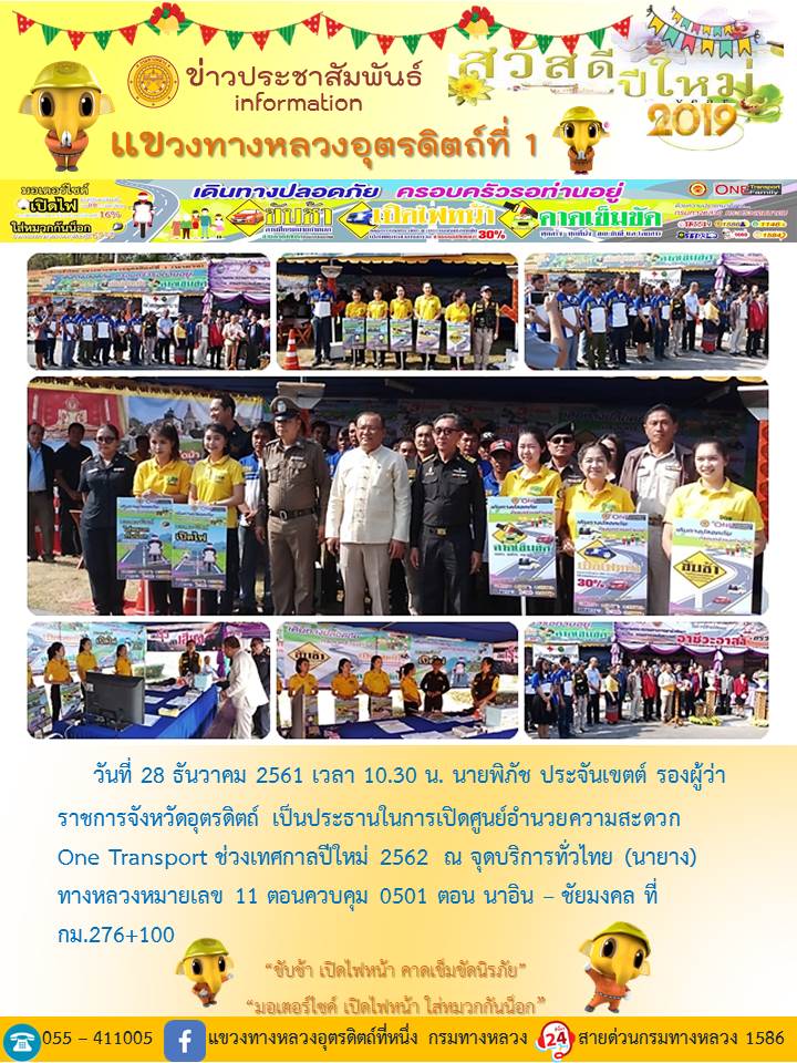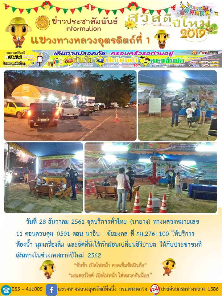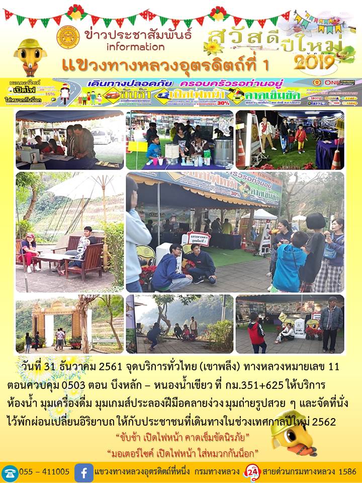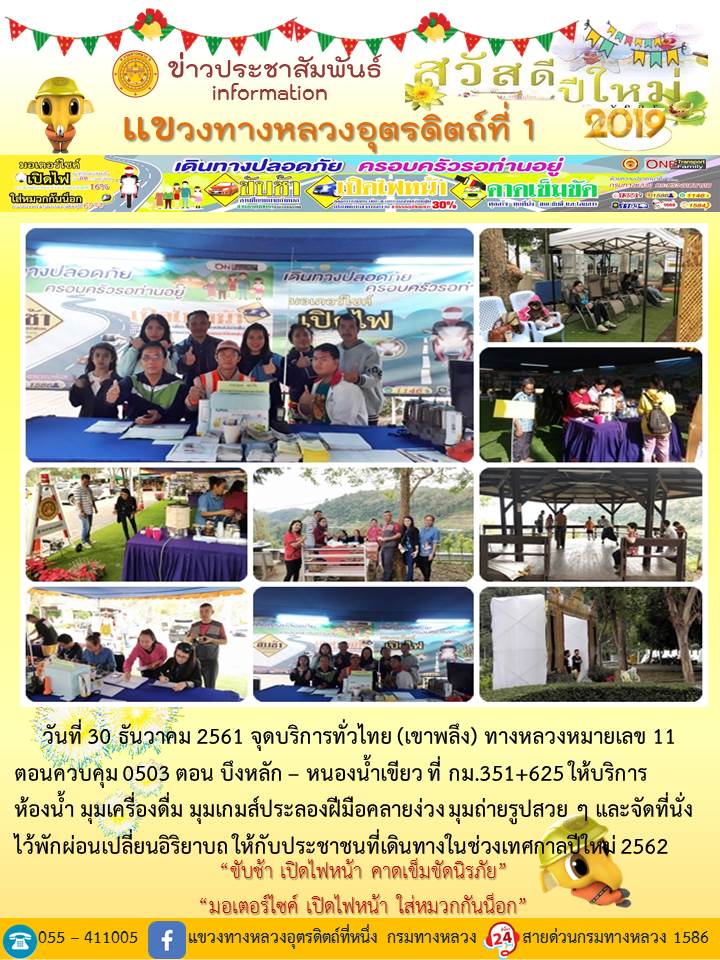 แขวงทางหลวงอุตรดิตถ์ที่ 1 ได้จัดชุดเจ้าหน้าที่ เพื่อปฏิบัติหน้าที่ค่อยบริการพี่น้องประชาชนที่เดินในช่วงเทศกาลปีใหม่ 2562 ตลอด 24 ชั่วโมง ระหว่างวันที่ 27 ธันวาคม 2561 ถึง วันที่ 2 มกราคม 2562 เพื่อให้การเดินทางของทุกท่านถึงที่หมายด้วยความปลอดภัย