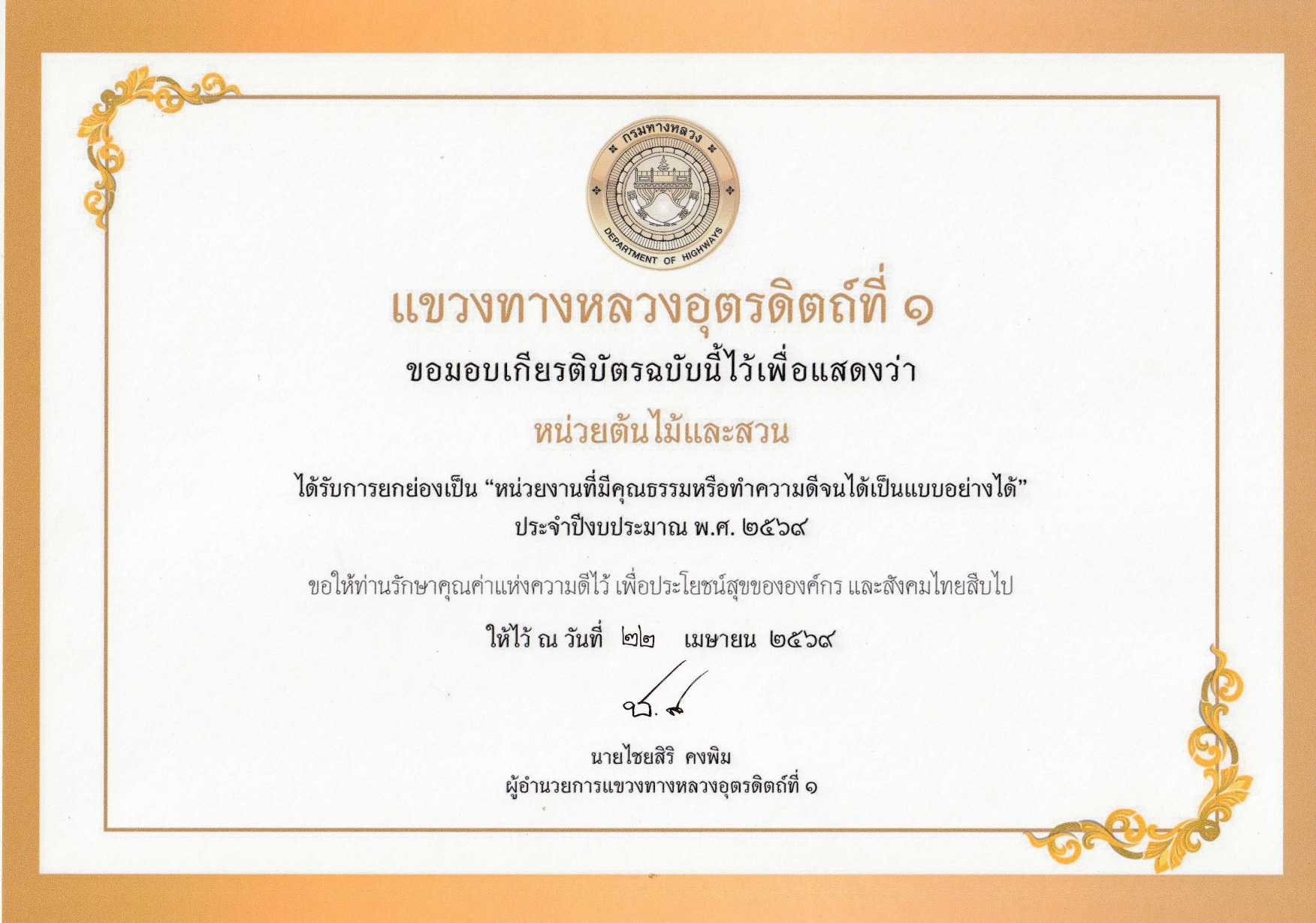 นายไชยศิริ คงพิม ผู้อำนวยการแขวงทางหลวงอุตรดิตถ์ที่ 1 มอบประกาศนียบัตรแก่บุคลากรและหน่วยงานในสังกัดที่มีคุณธรรมและทำความดีจนเป็นแบบอย่างได้ ตามแผนปฏิบัติการส่งเสริมคุณธรรมจริยธรรมของแขวงทางหลวงอุตรดิตถ์ที่ 1 ประจำปีงบประมาณ พ.ศ. 2569 ดังนี้