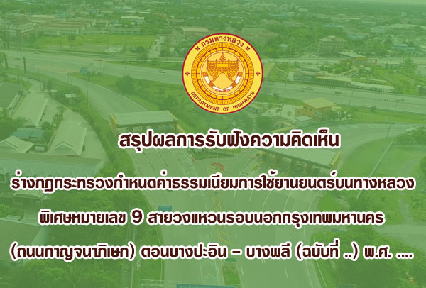 สรุปผลการรับฟังความคิดเห็น ร่างกฎกระทรวงกำหนดค่าธรรมเนียมการใช้ยานยนตร์บนทางหลวงพิเศษหมายเลข 9 สายวงแหวนรอบนอกกรุงเทพมหานคร (ถนนกาญจนาภิเษก) ตอนบางปะอิน - บางพลี