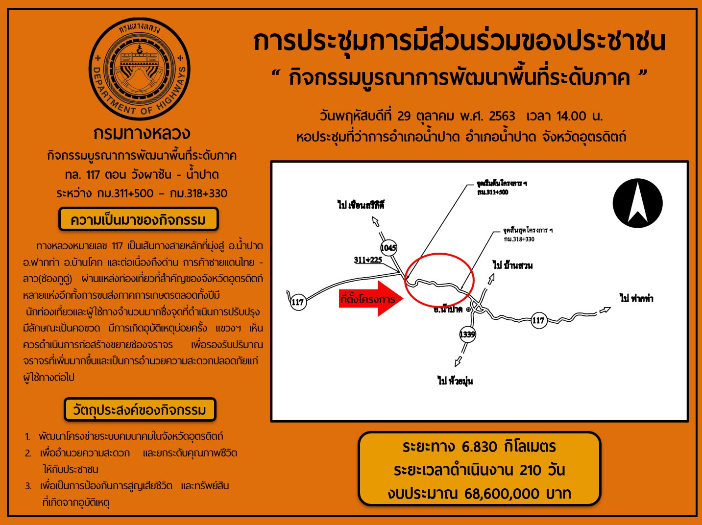 ขอเชิญเข้าร่วมประชุมการรับฟังความคิดเห็นของประชาชน ทล.117 กรณีโครงการก่อสร้างงานบูรณาการพัฒนาพื้นที่ระดับภาค ทางหลวงหมายเลข 117 ตอนควบคุม 0501 ตอน วังผาชัน - น้ำปาด ระหว่าง กม.311+500 - กม.318+330
