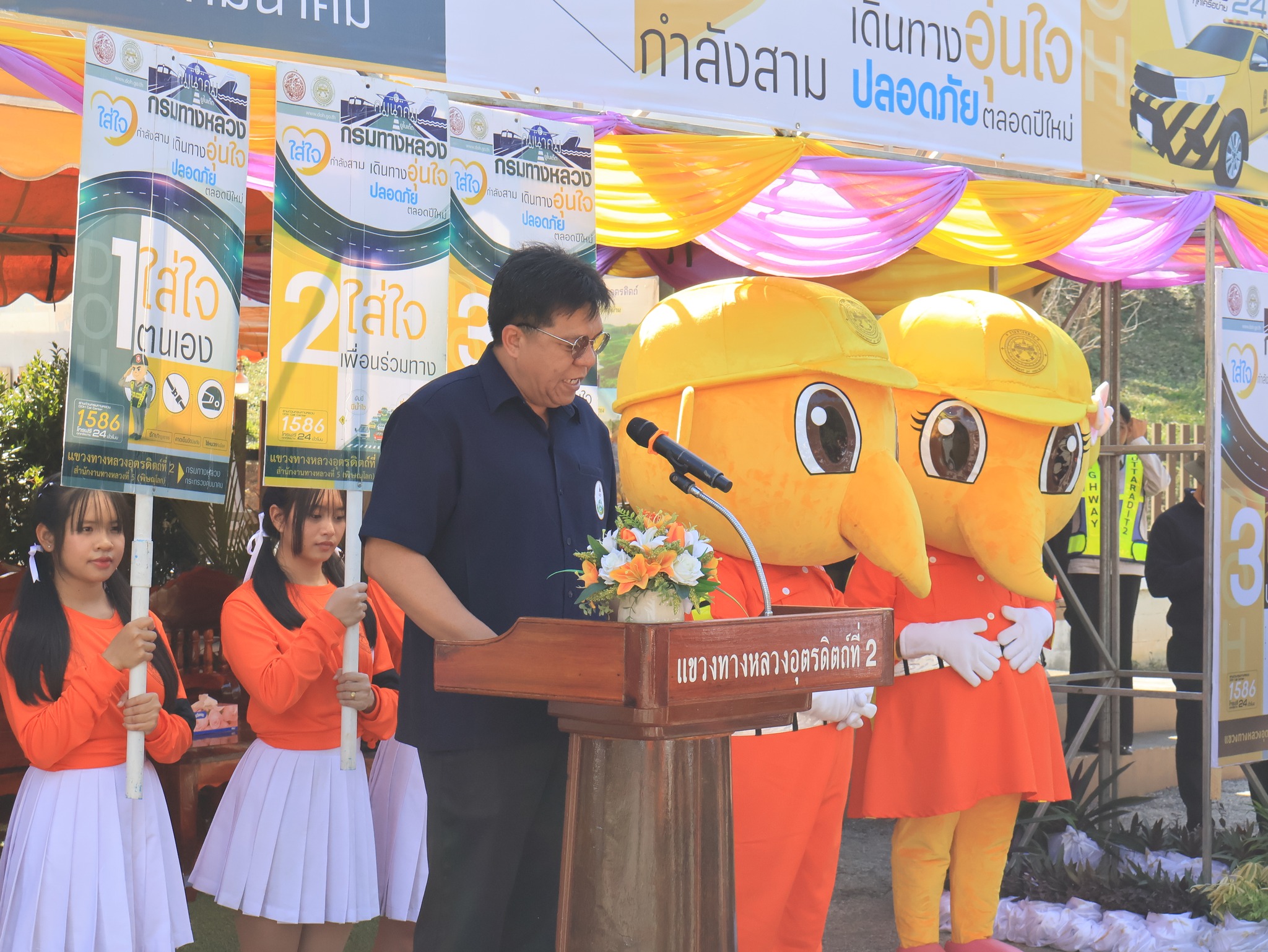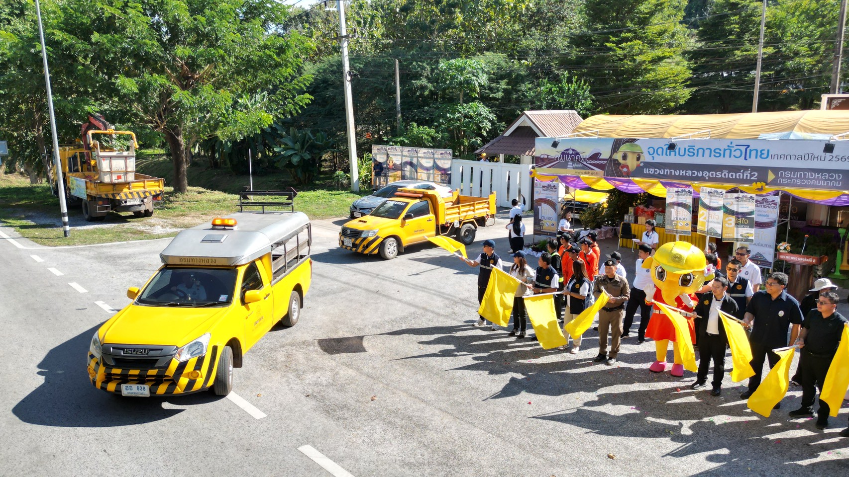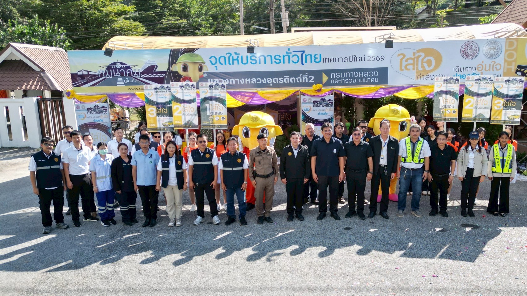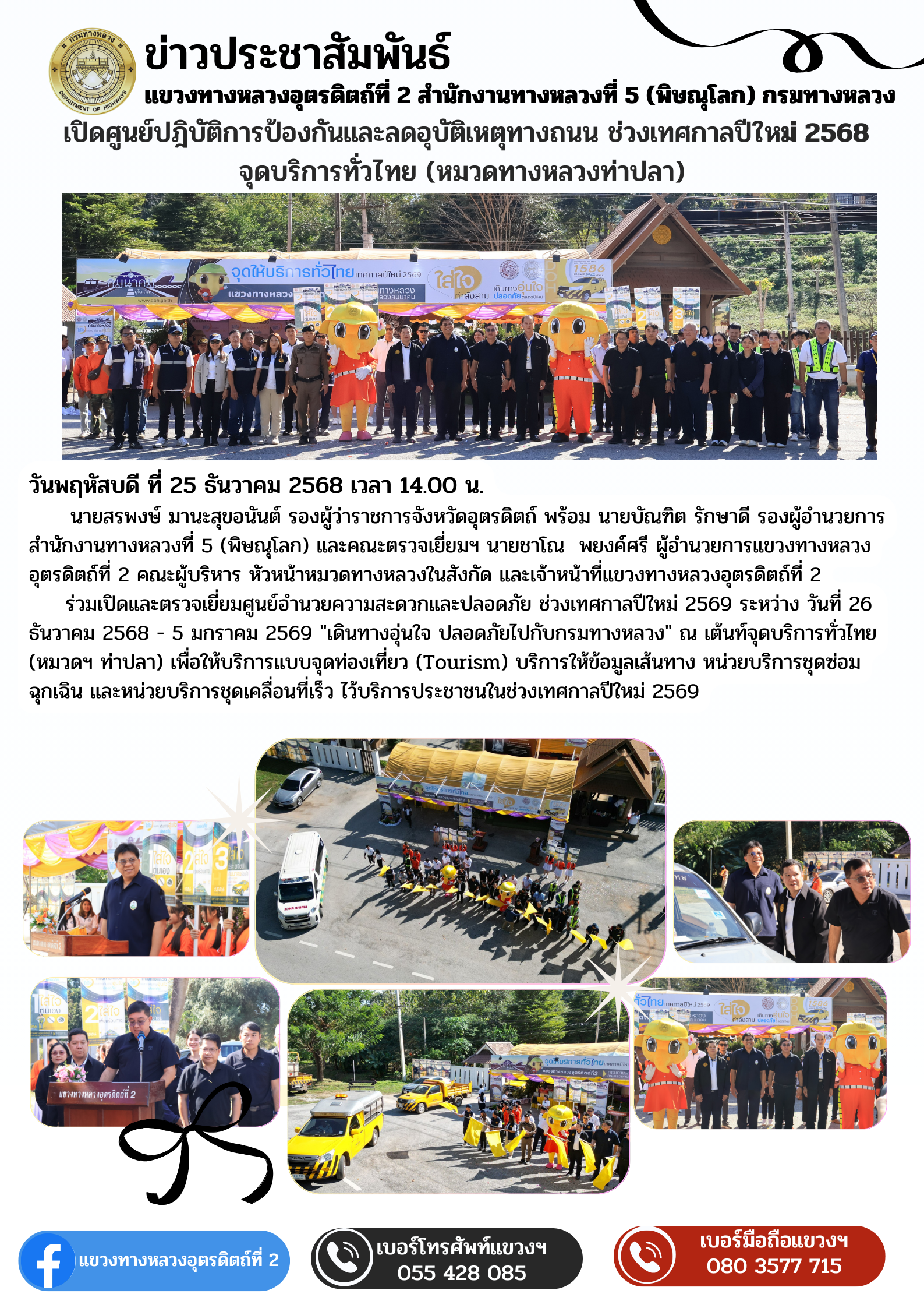 เปิดและตรวจเยี่ยมศูนย์อำนวยความสะดวกและปลอดภัย ช่วงเทศกาลปีใหม่ 2569 ระหว่าง วันที่ 26 ธันวาคม 2568 - 5 มกราคม 2569 "เดินทางอุ่นใจ ปลอดภัยไปกับกรมทางหลวง" ณ เต้นท์จุดบริการทั่วไทย (หมวดฯ ท่าปลา) เพื่อให้บริการแบบจุดท่องเที่ยว (Tourism) บริการให้ข้อมูลเส้นทาง หน่วยบริการชุดซ่อมฉุกเฉิน